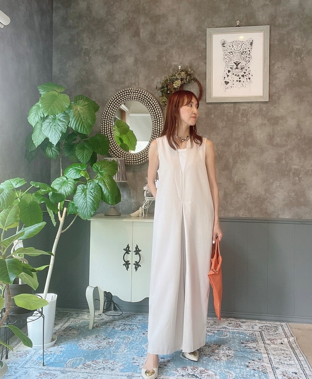 Vネックロンパース ●1枚でサマになる、上品なVネックデザイン ●軽やか素材で春夏秋も快適&涼やかに着こなせる ●深めのVネックとゆるシルエットで抜け感たっぷり♪ ●オンにもオフにも対応、着るだけでコーデが完成! ●後ろファスナー ■伸縮性:なし ■裏地:なし ■透け感:薄い色ややあり ■生地の厚さ:普通 サイズ 総丈 :112cm ヒップ : 97cm 渡り幅 : 40cm 股下 : 61.5cm 裾幅 : 28cm