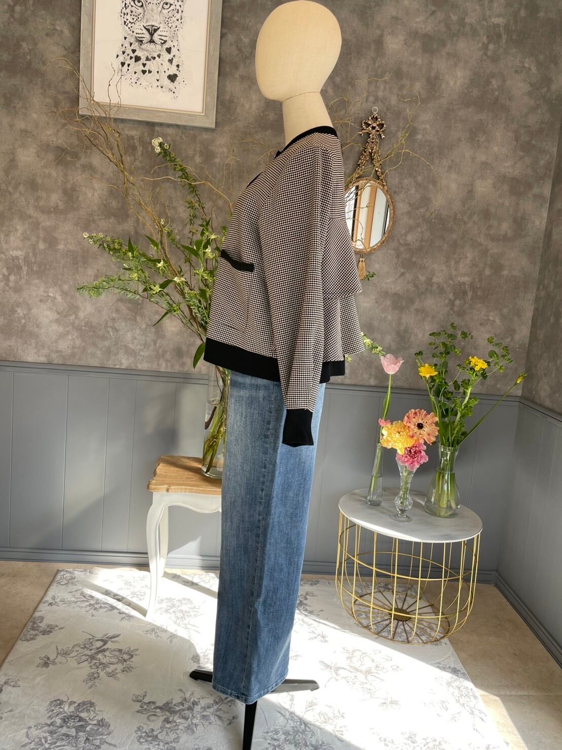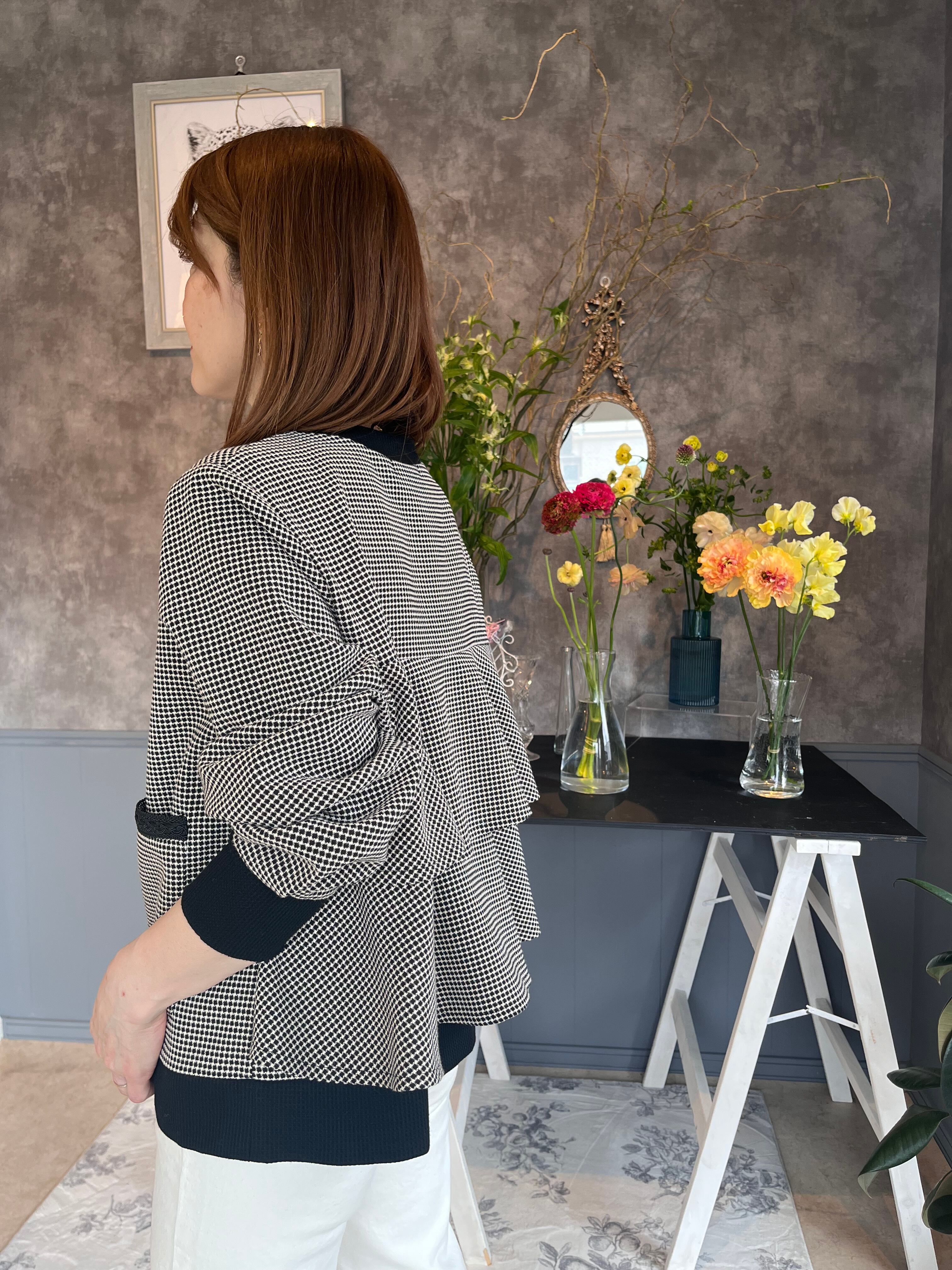 ・ワッフルツイード生地を使用したカーディガンで、後ろ側には華やかな2段フリルが施されています。