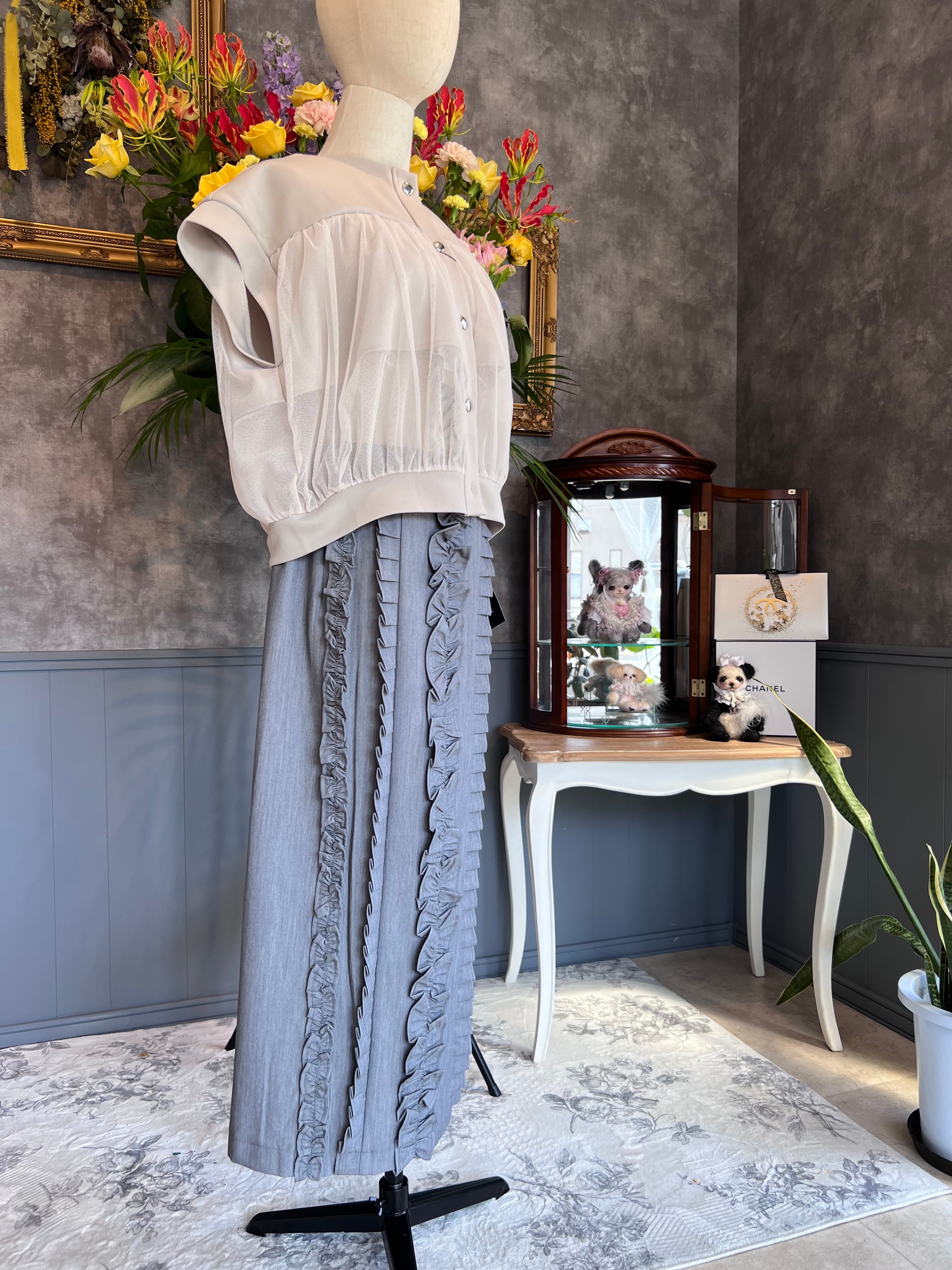 ・軽やかなチュールのトリミングが、シンプルながらも女性らしさを引き立て、さまざまなコーディネートに合わせやすいアイテムです。