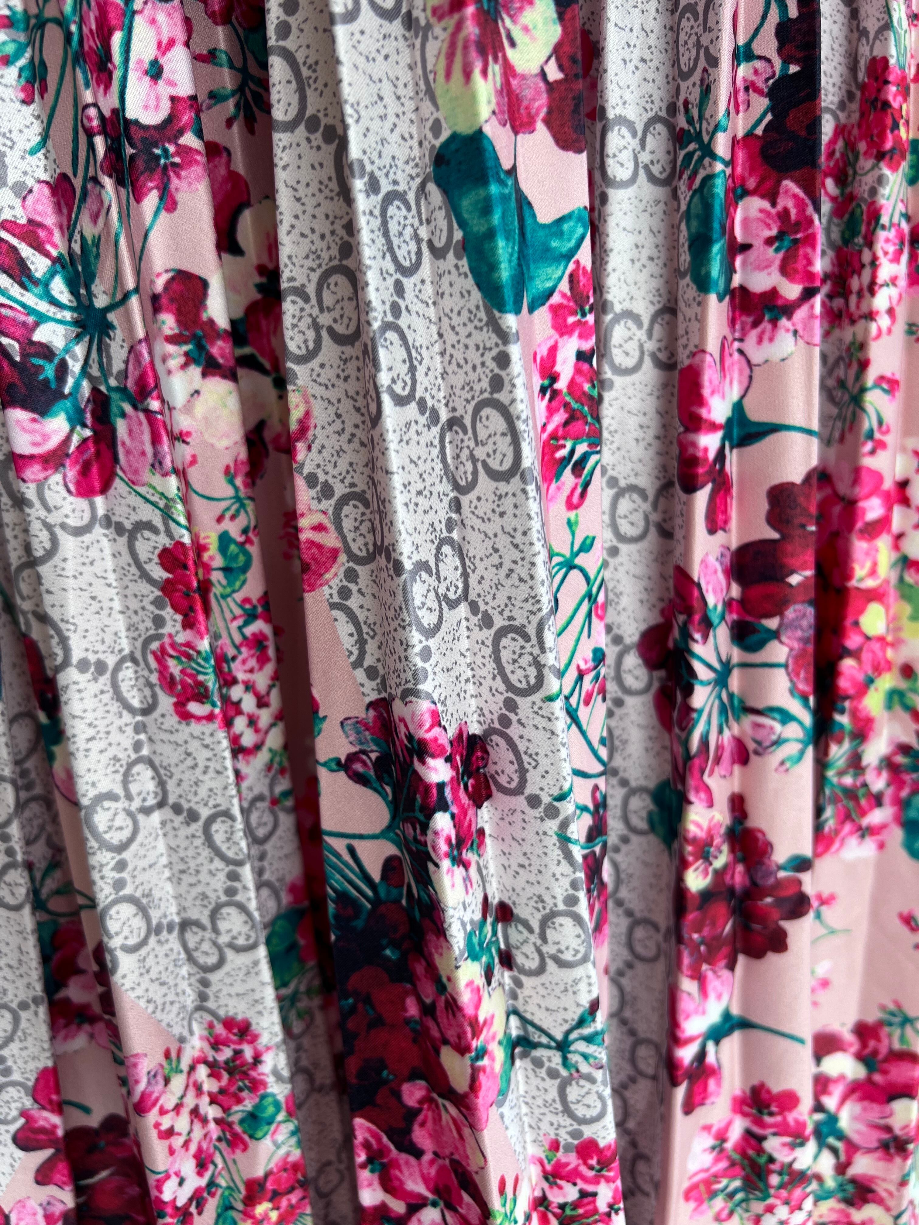 華やかなフラワー柄が目を引く、上品なピンクのワンピースです。