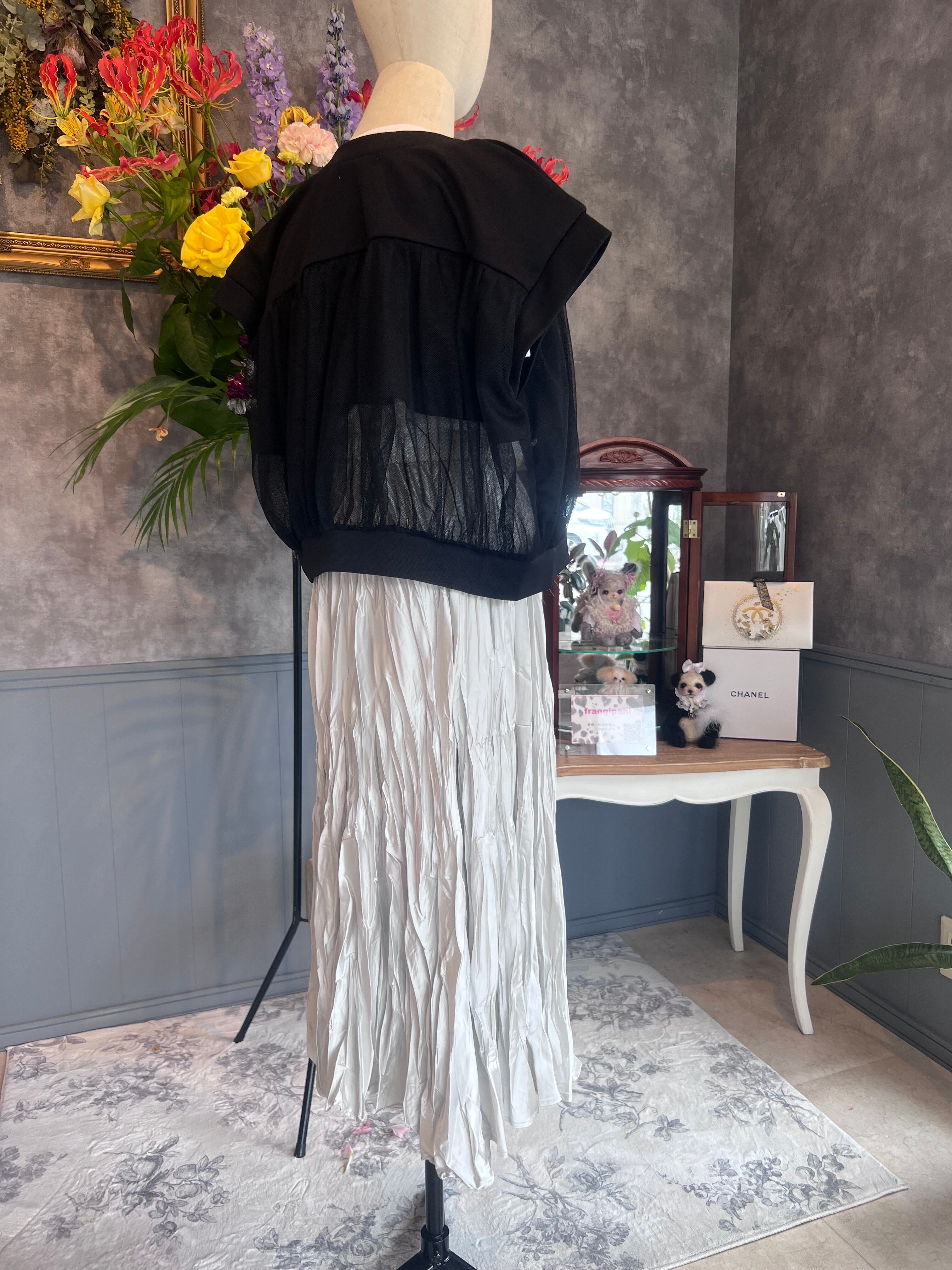 ・軽やかなチュールのトリミングが、シンプルながらも女性らしさを引き立て、さまざまなコーディネートに合わせやすいアイテムです。