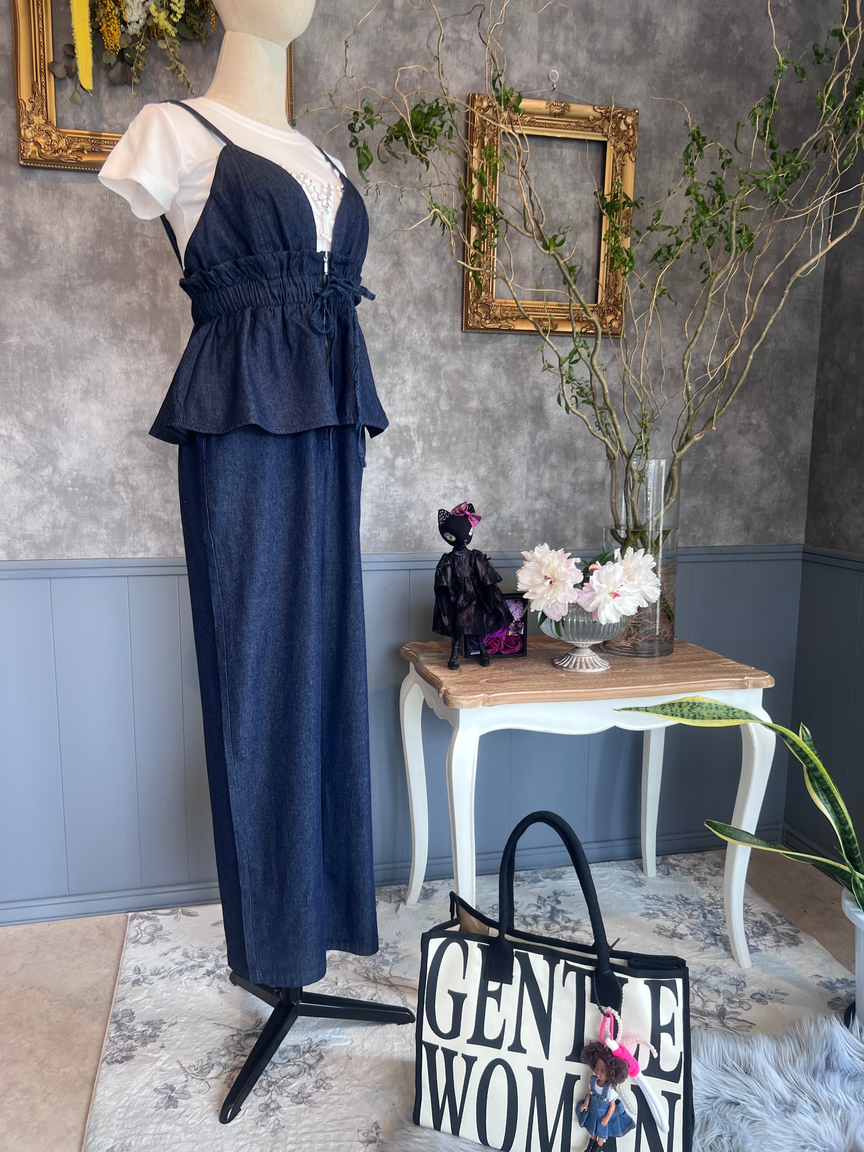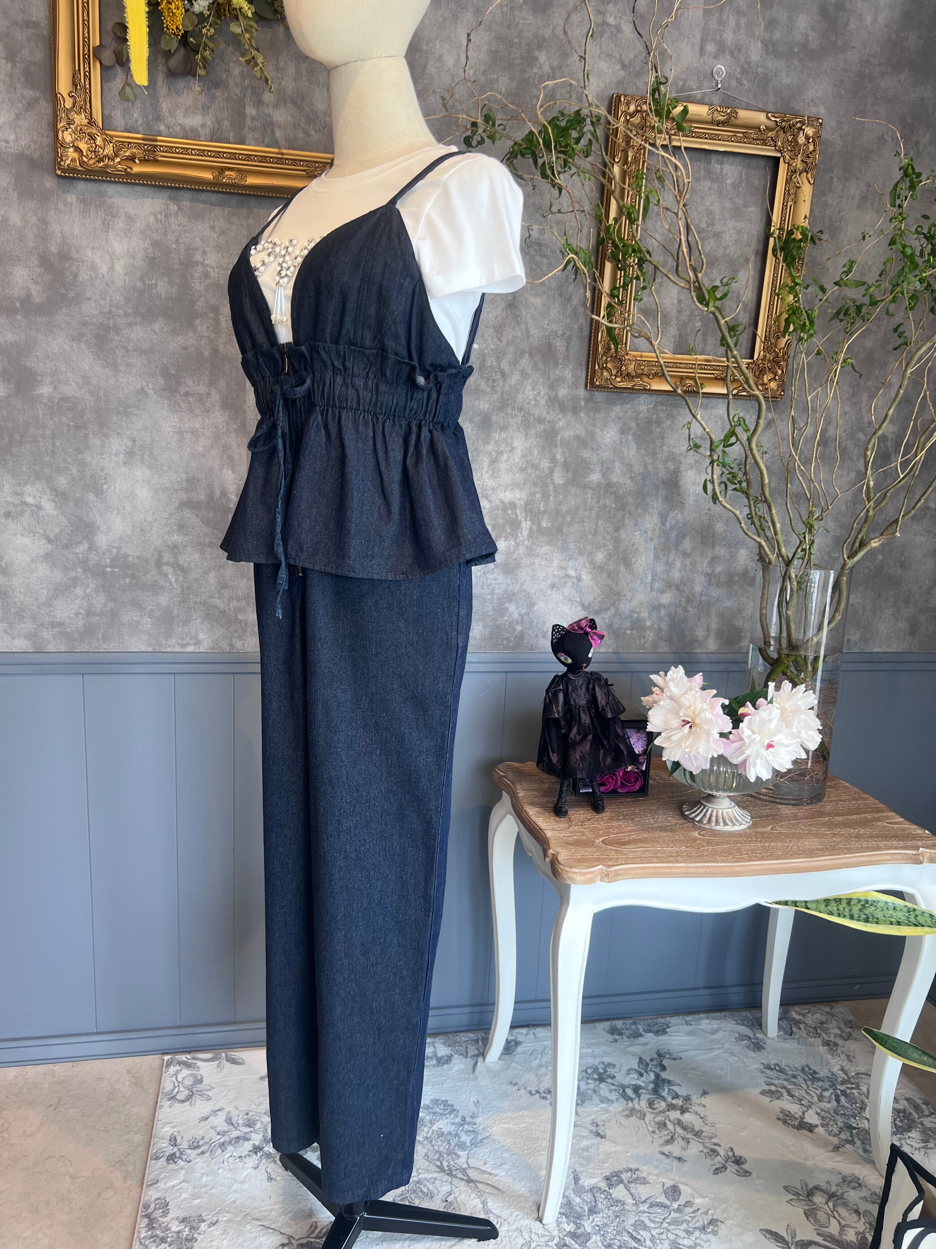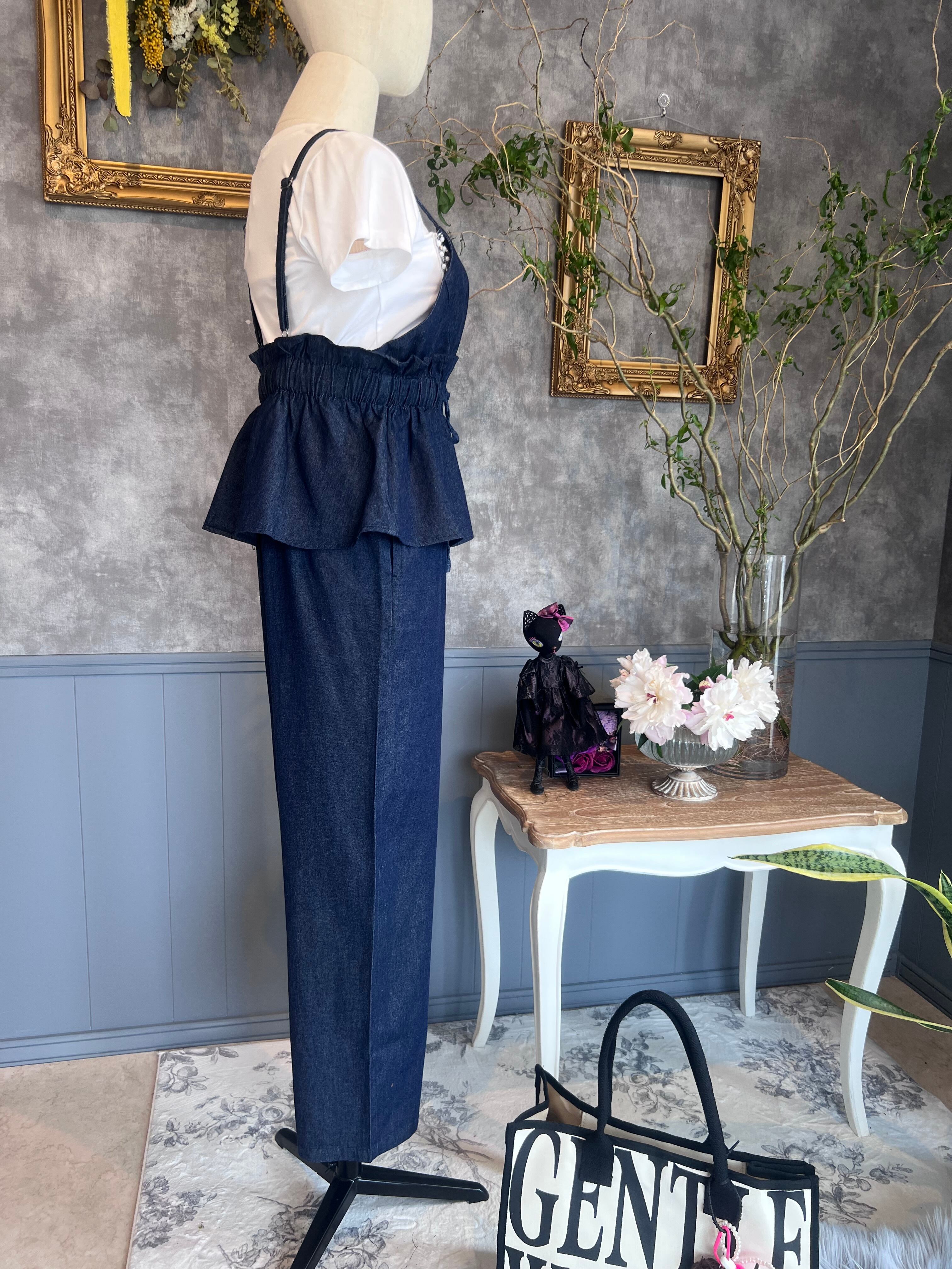 ペプラムフリルが目を引く、今っぽさ満点のデニムコンビネゾン。