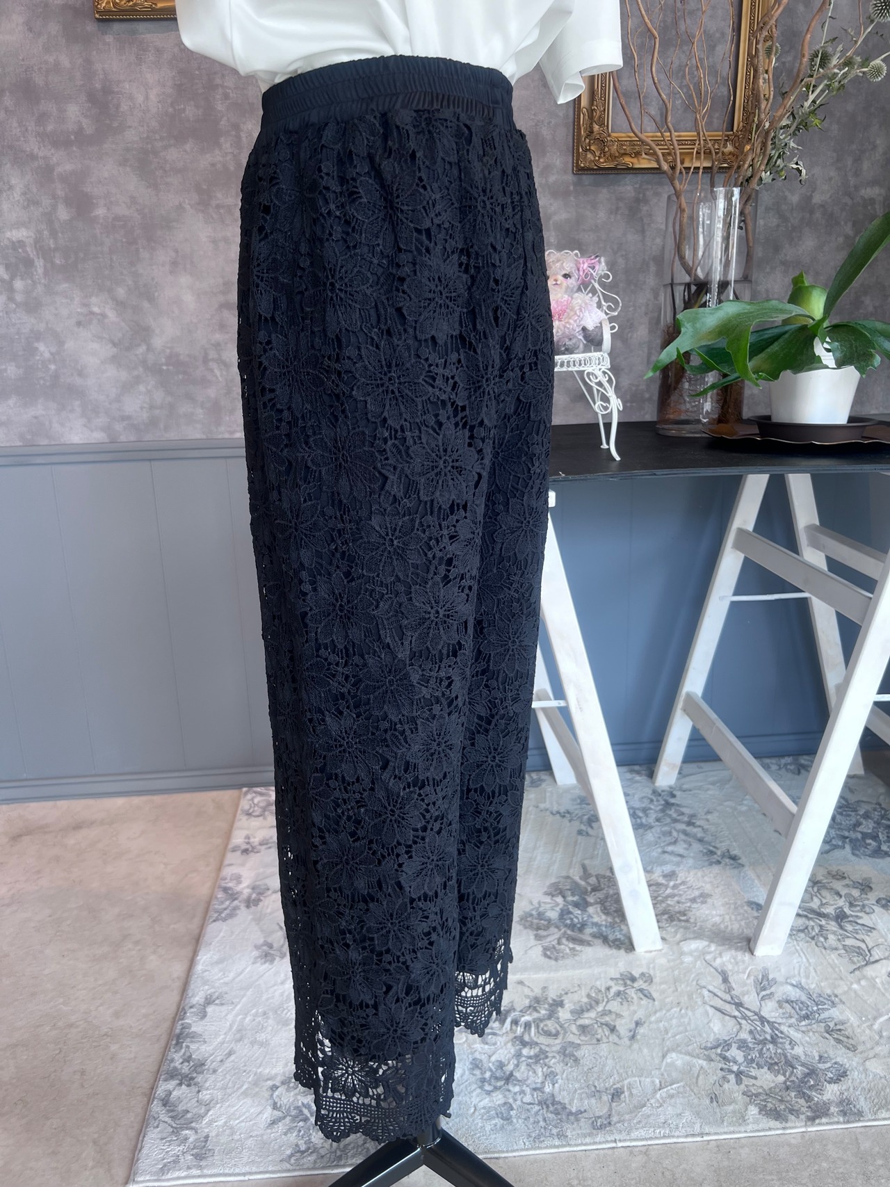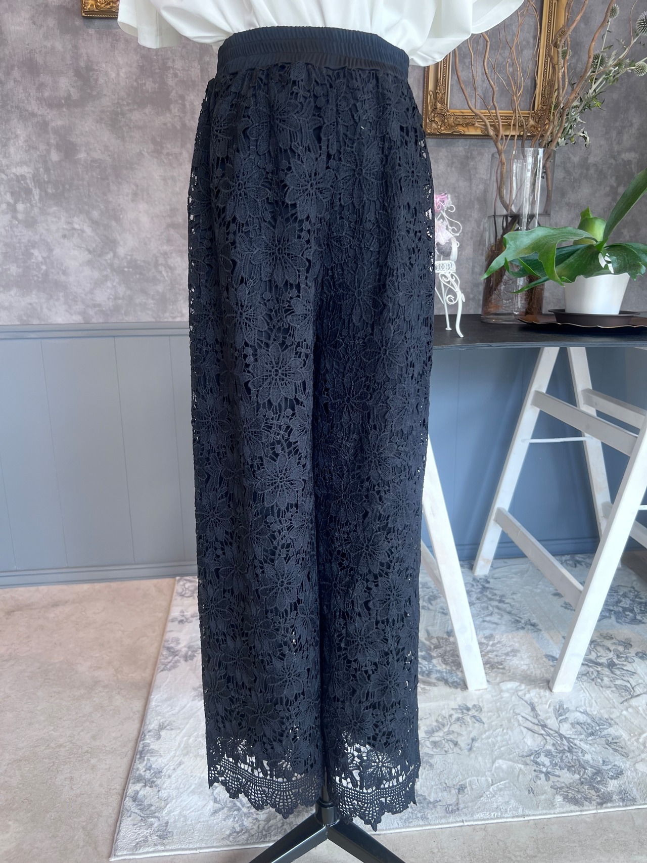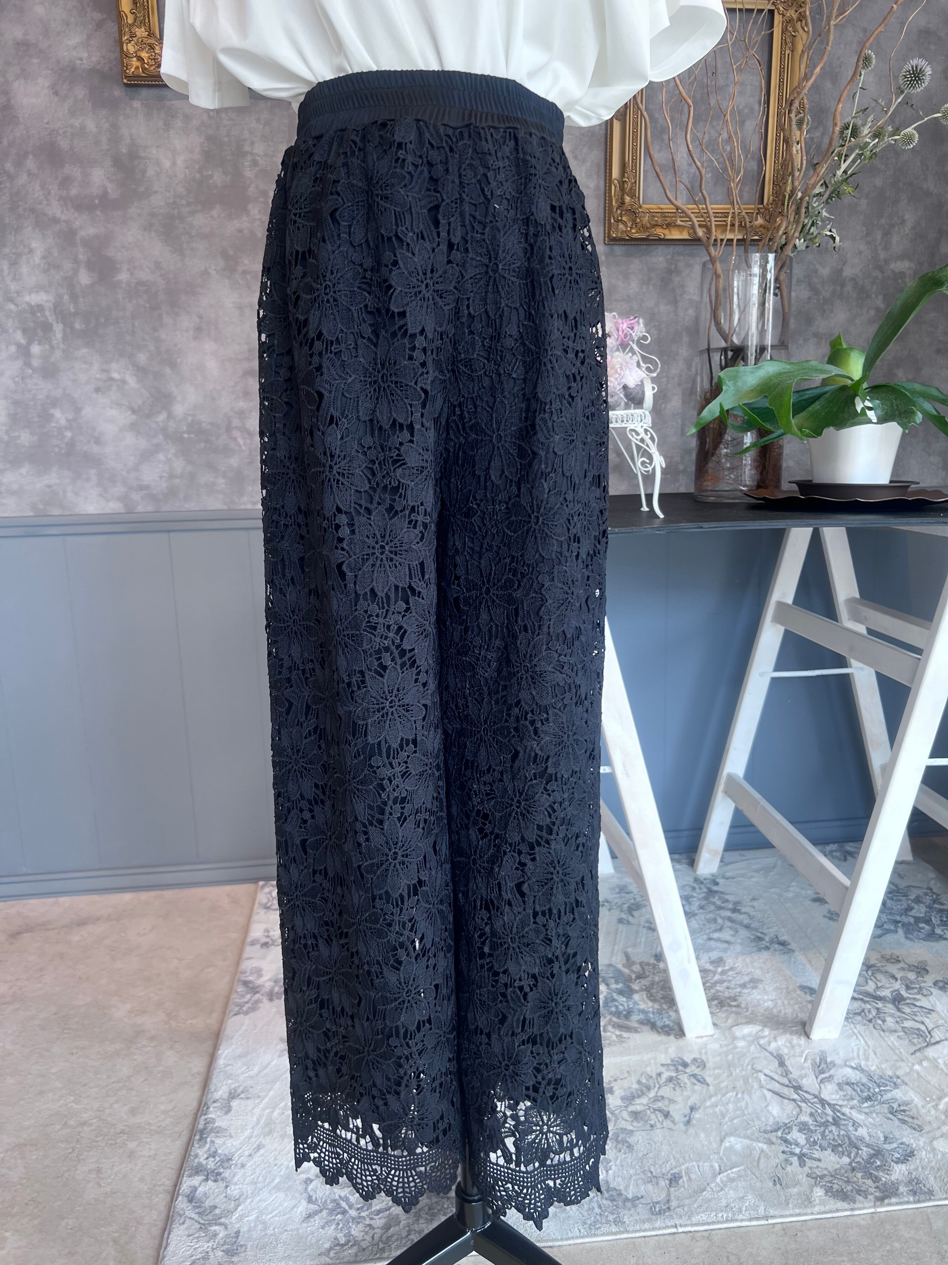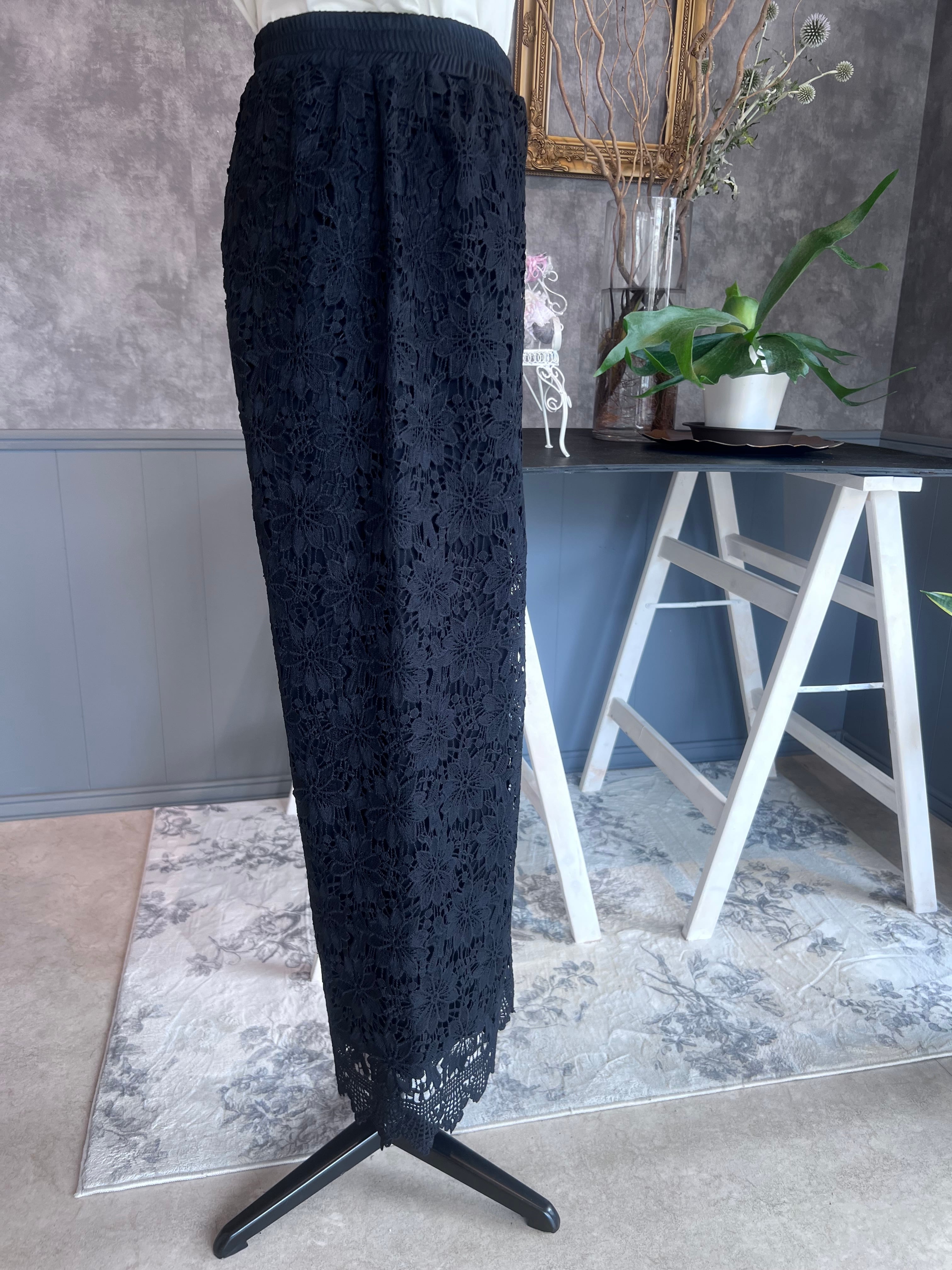 華やかでおしゃれな印象を与える、総レースデザインのパンツです。