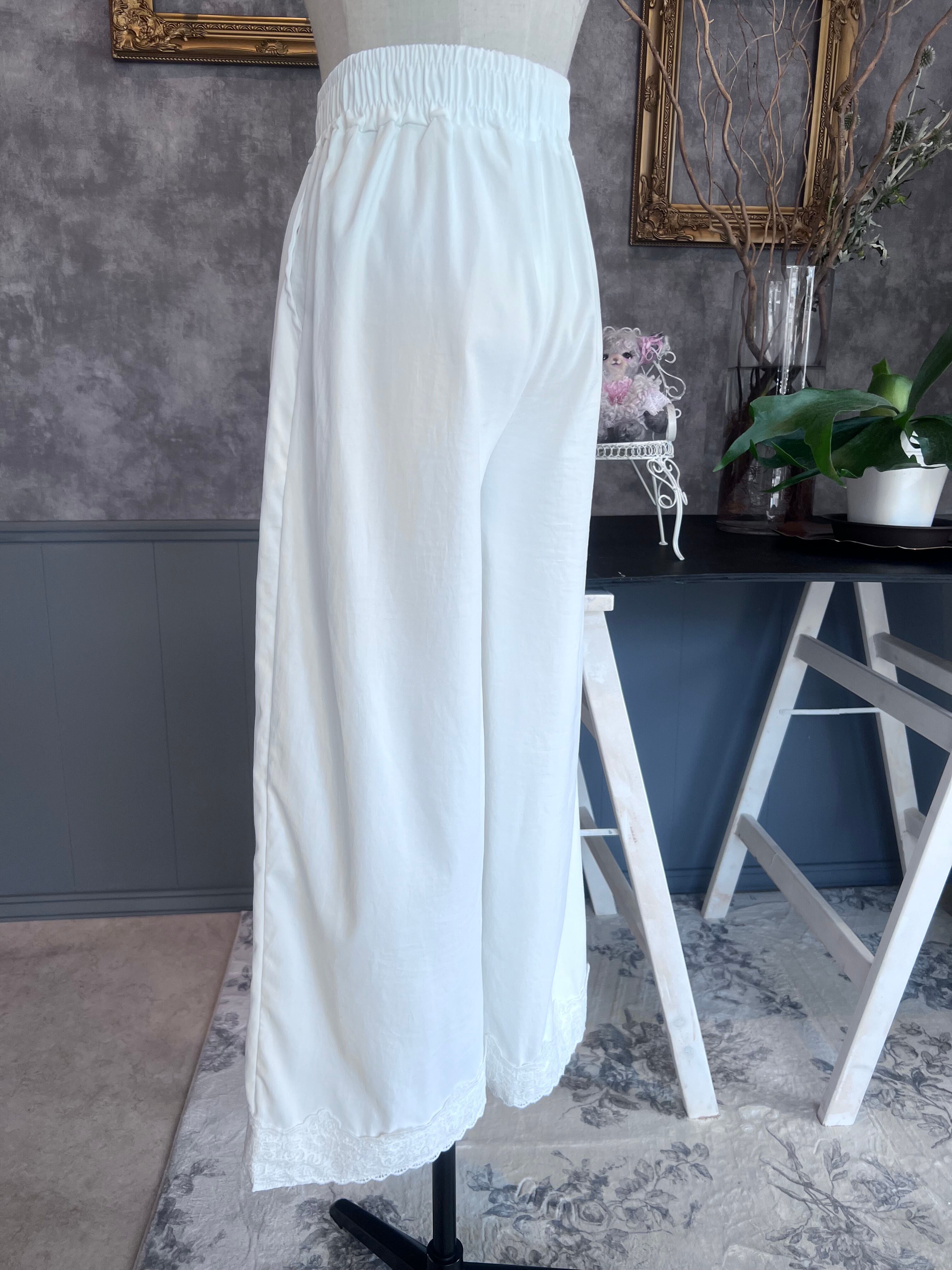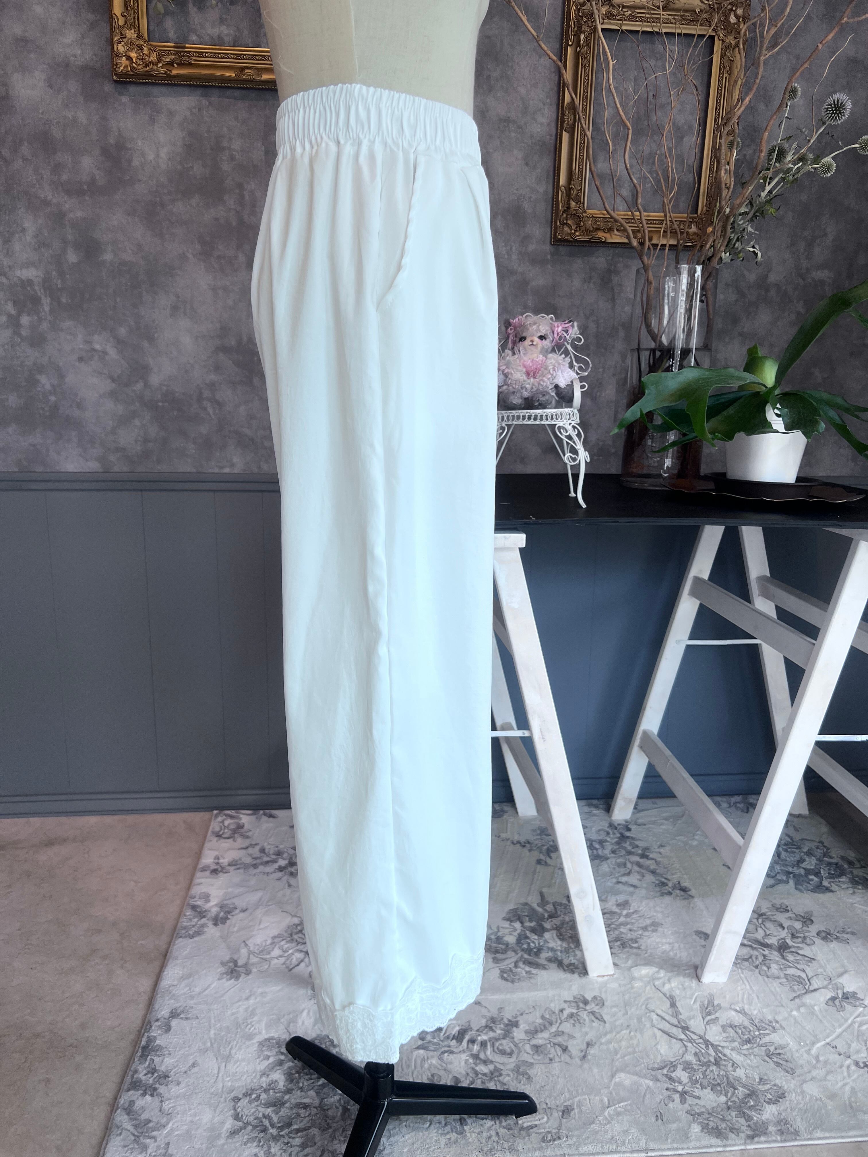 優しい白が涼しげな魅力を引き立てる、裾に繊細なレースが施されたリラックスパンツです。