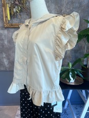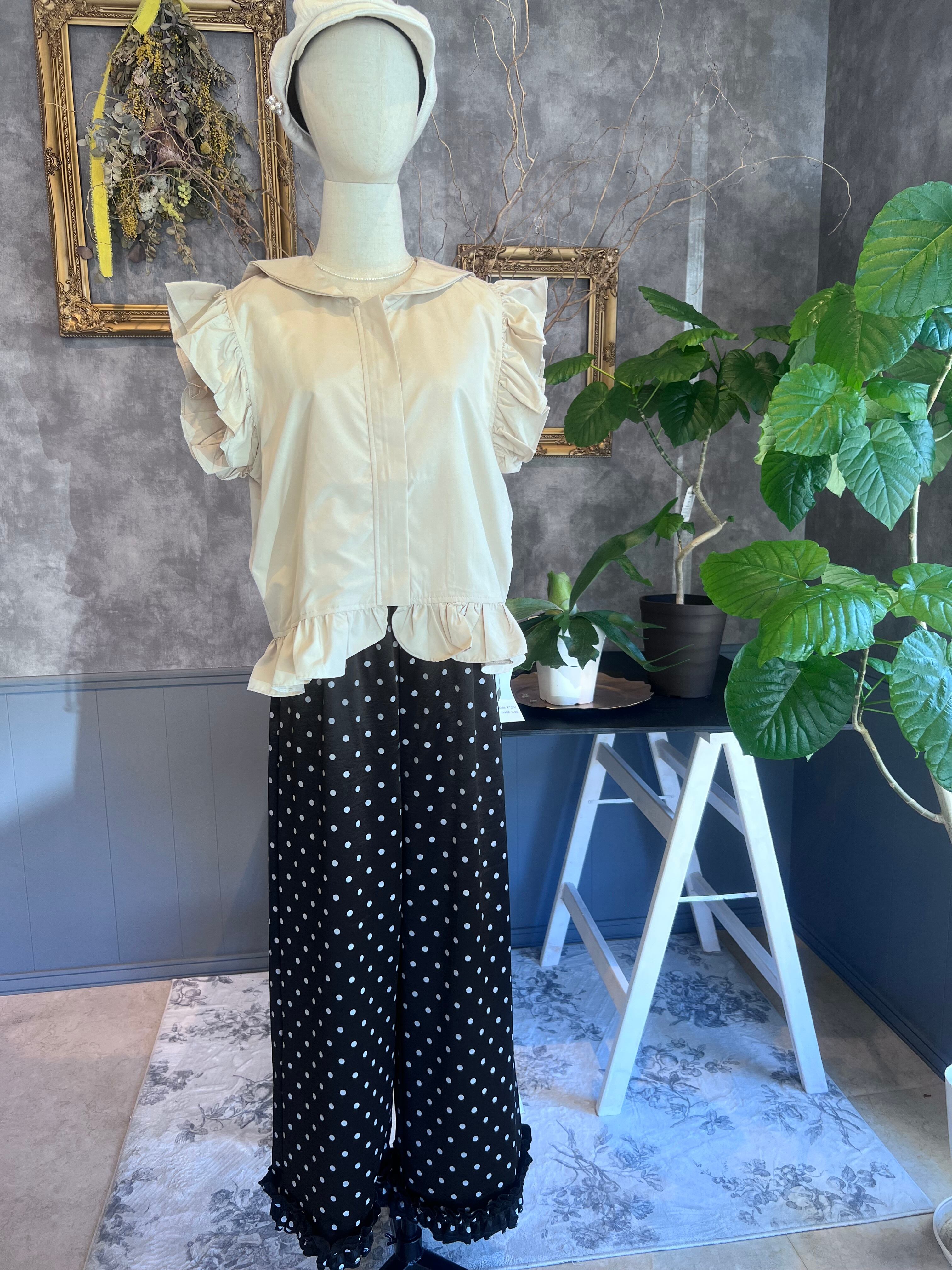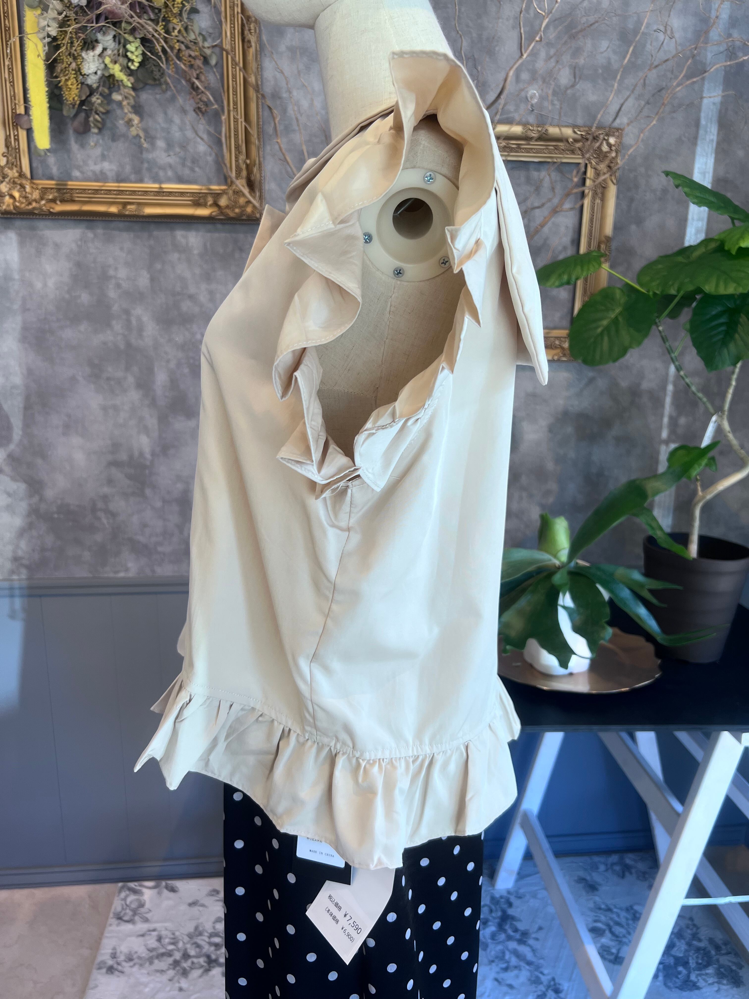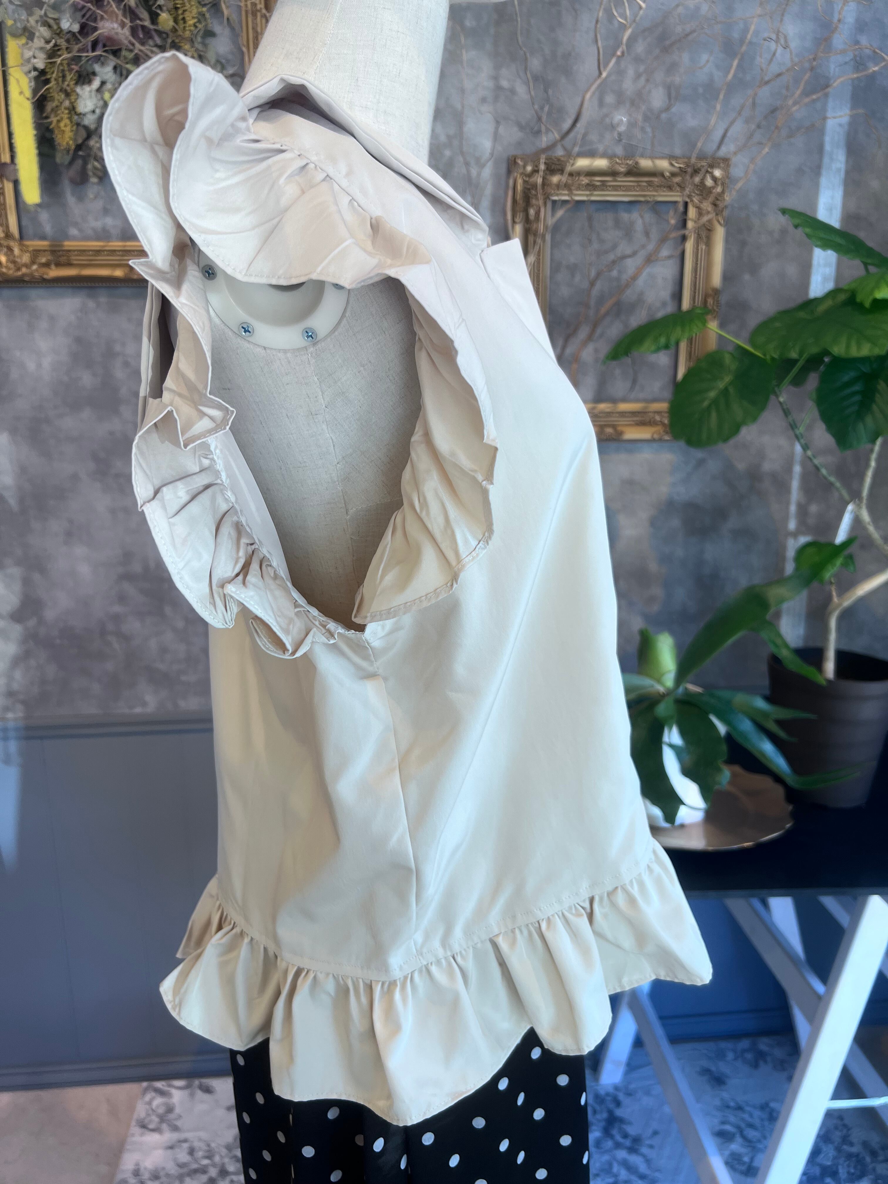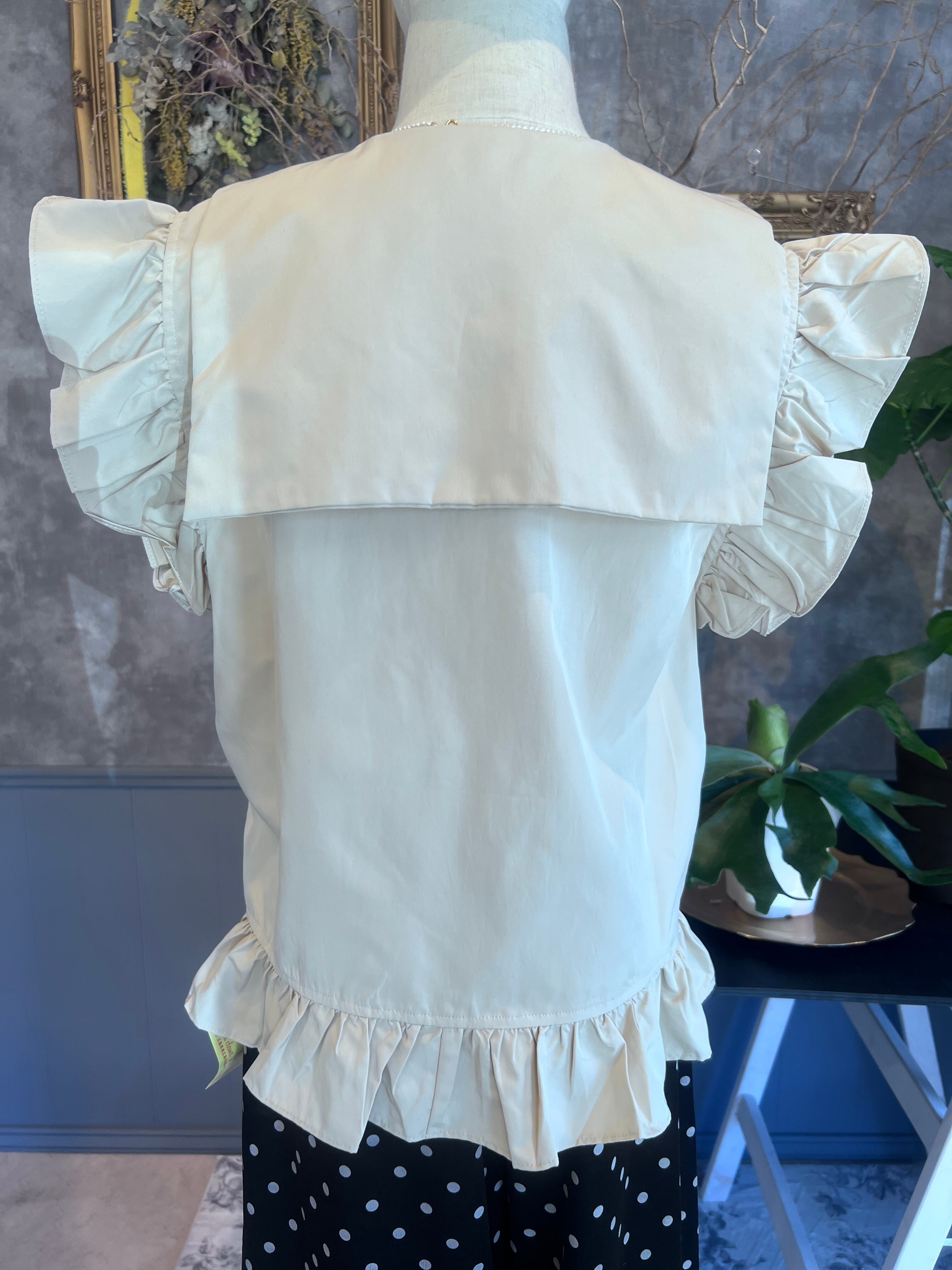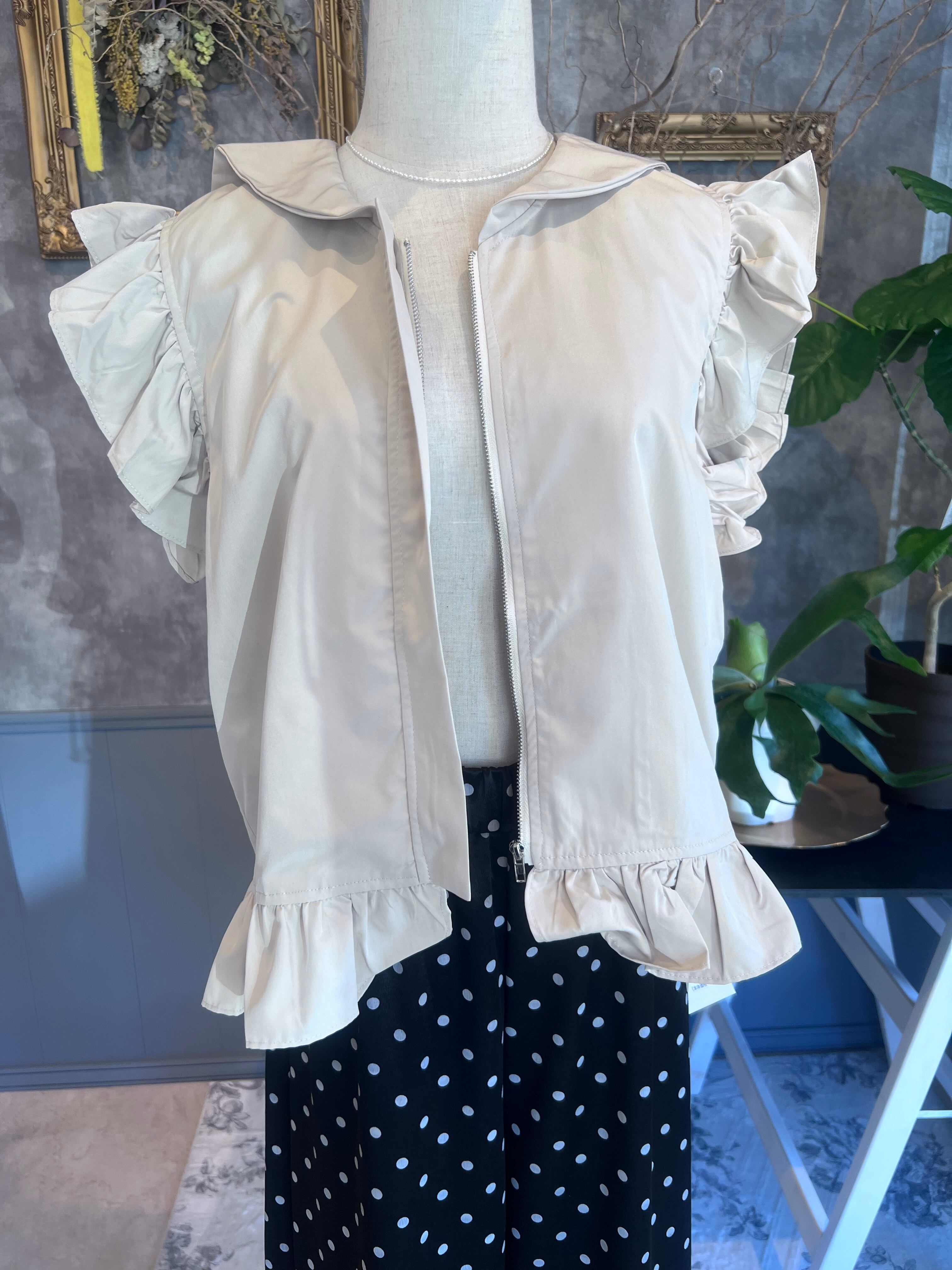 かわいらしさとおしゃれさを兼ね備えた「袖フリル ベスト」は、個性的なセーラー襟と裾・袖のフリルが特徴的なアイテムです。