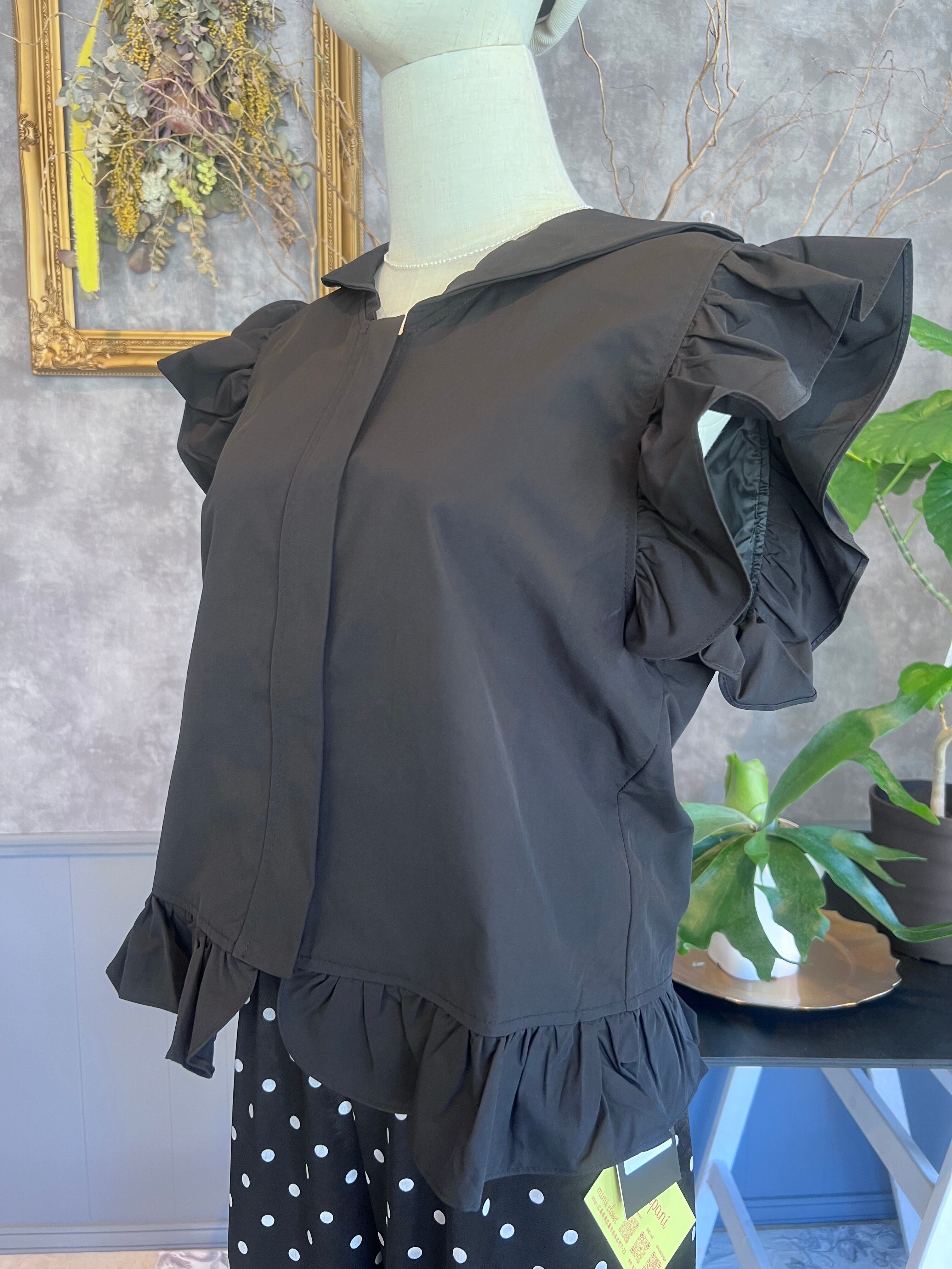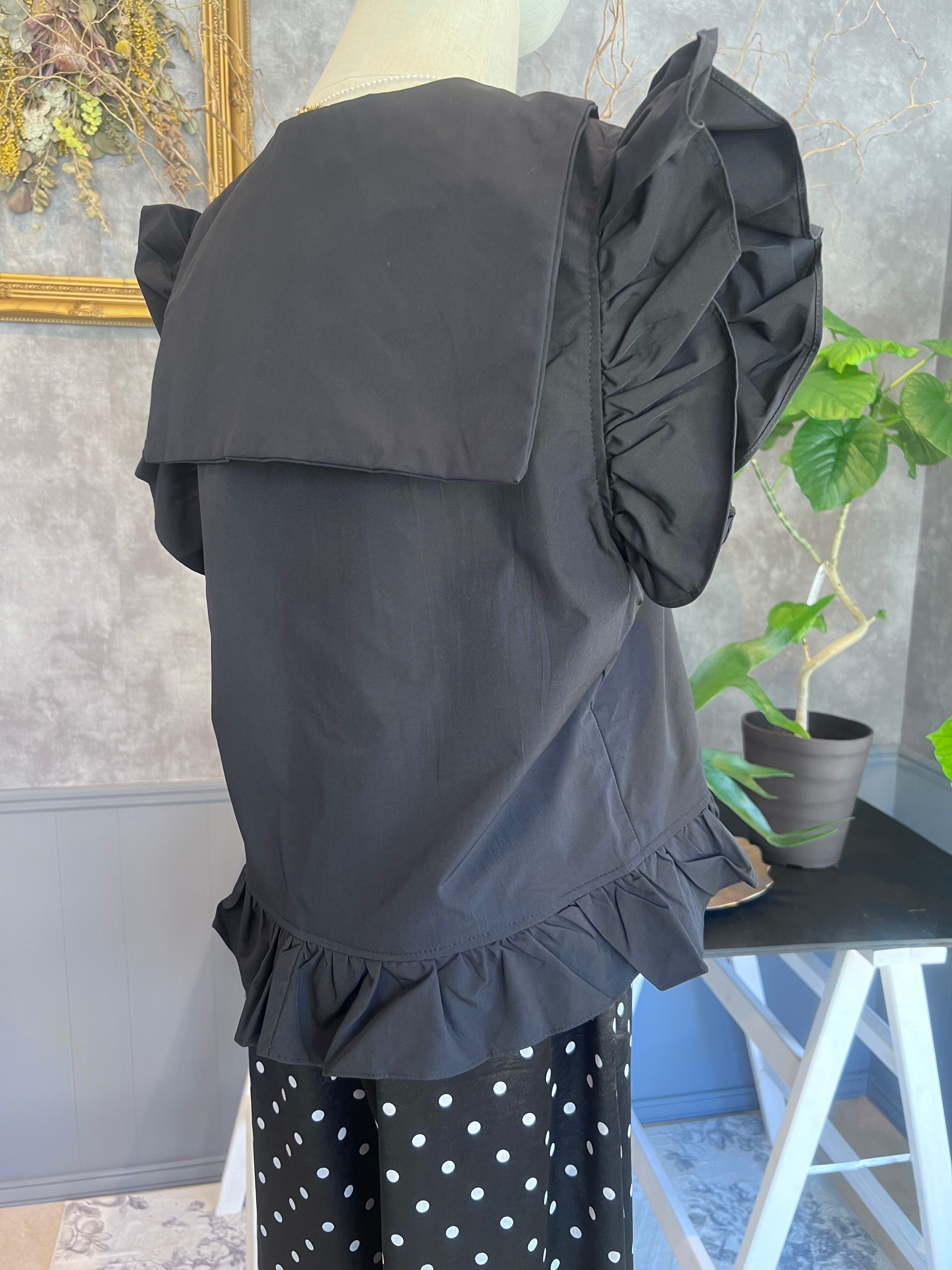 かわいらしさとおしゃれさを兼ね備えた「袖フリル ベスト」は、個性的なセーラー襟と裾・袖のフリルが特徴的なアイテムです。
