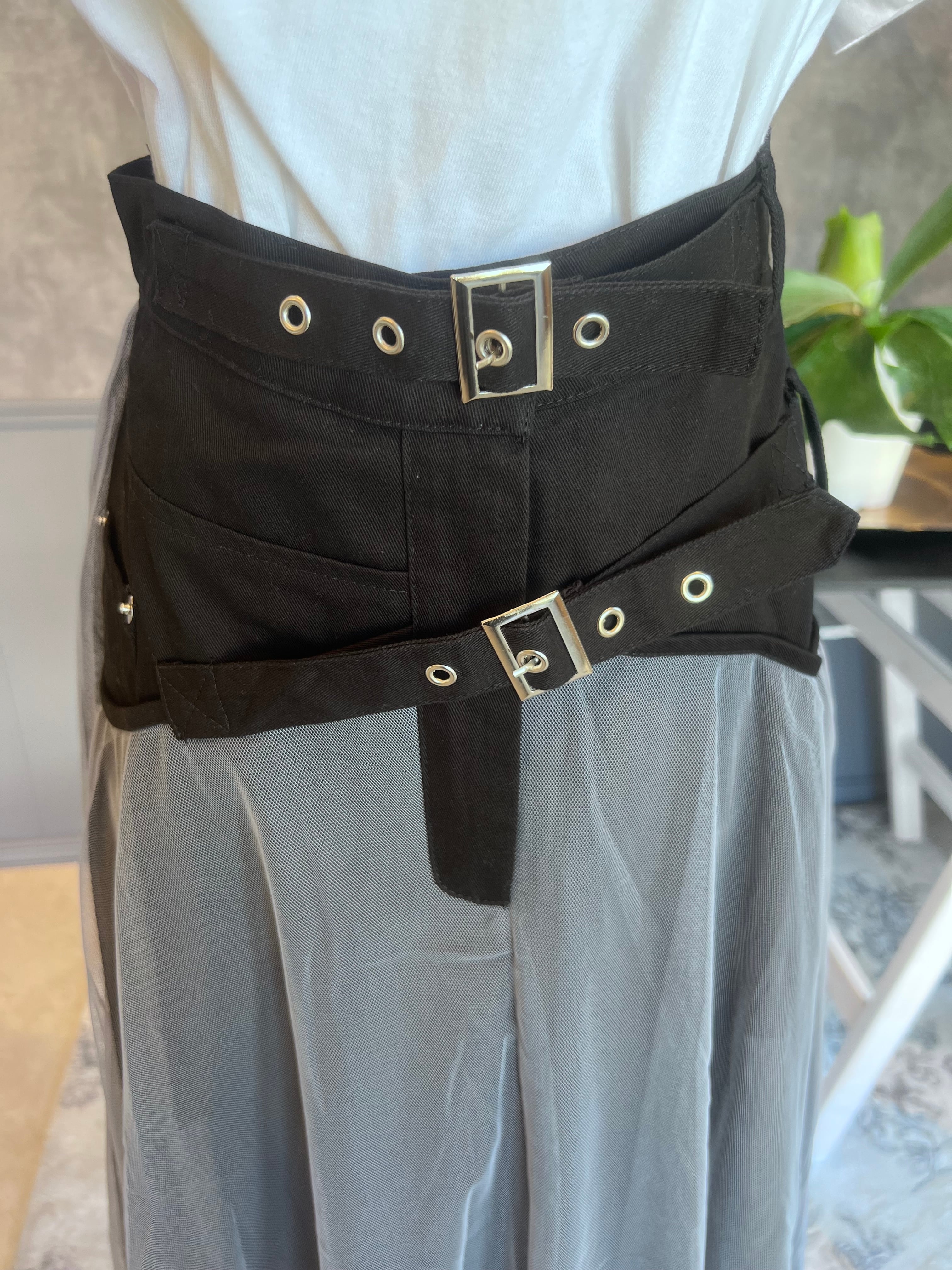 ダブルベルトと切り替えデザインがスタイルに個性を加え、軽やかなチュール素材が優雅さを引き立てます。