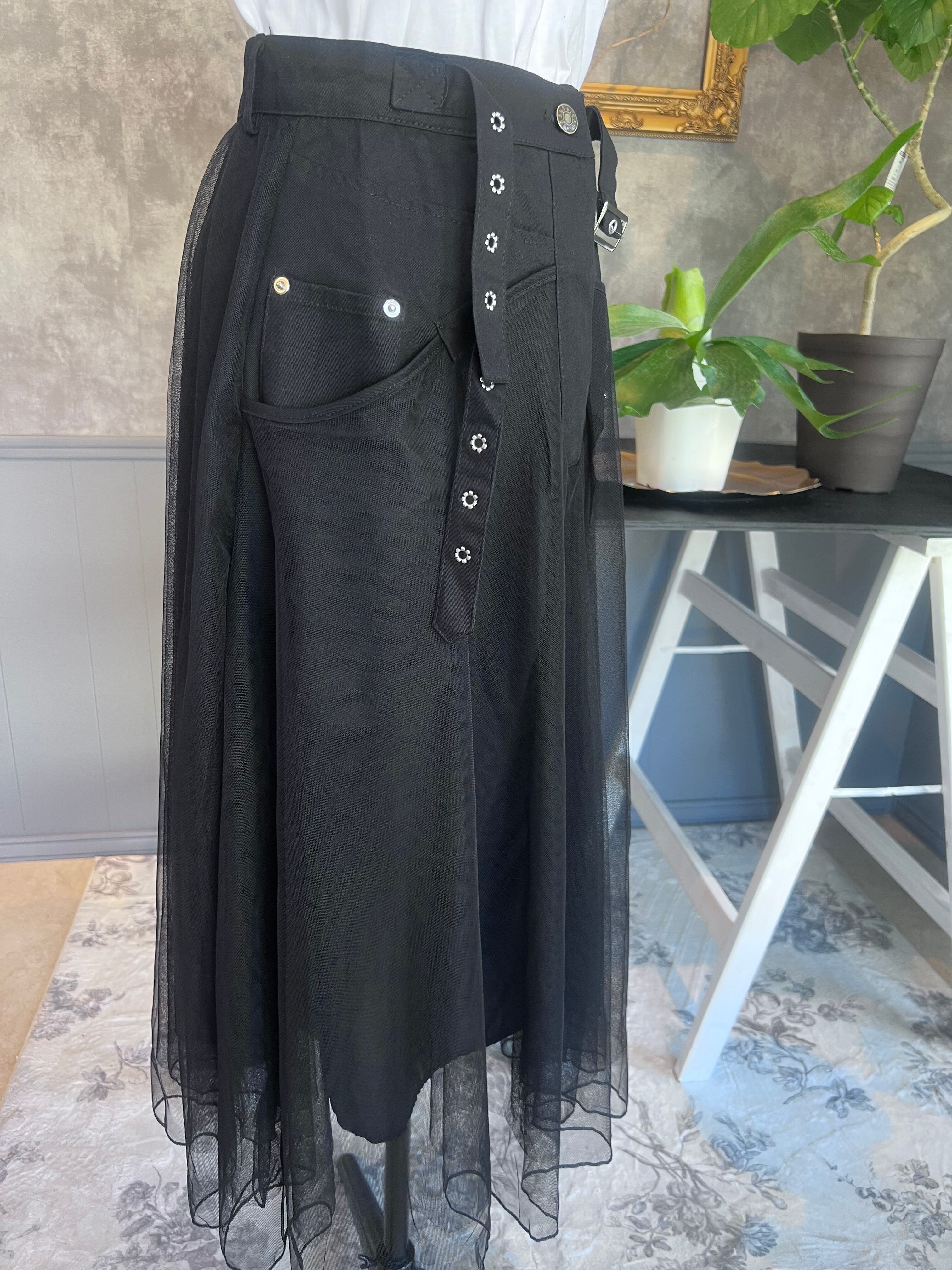 ダブルベルトと切り替えデザインがスタイルに個性を加え、軽やかなチュール素材が優雅さを引き立てます。