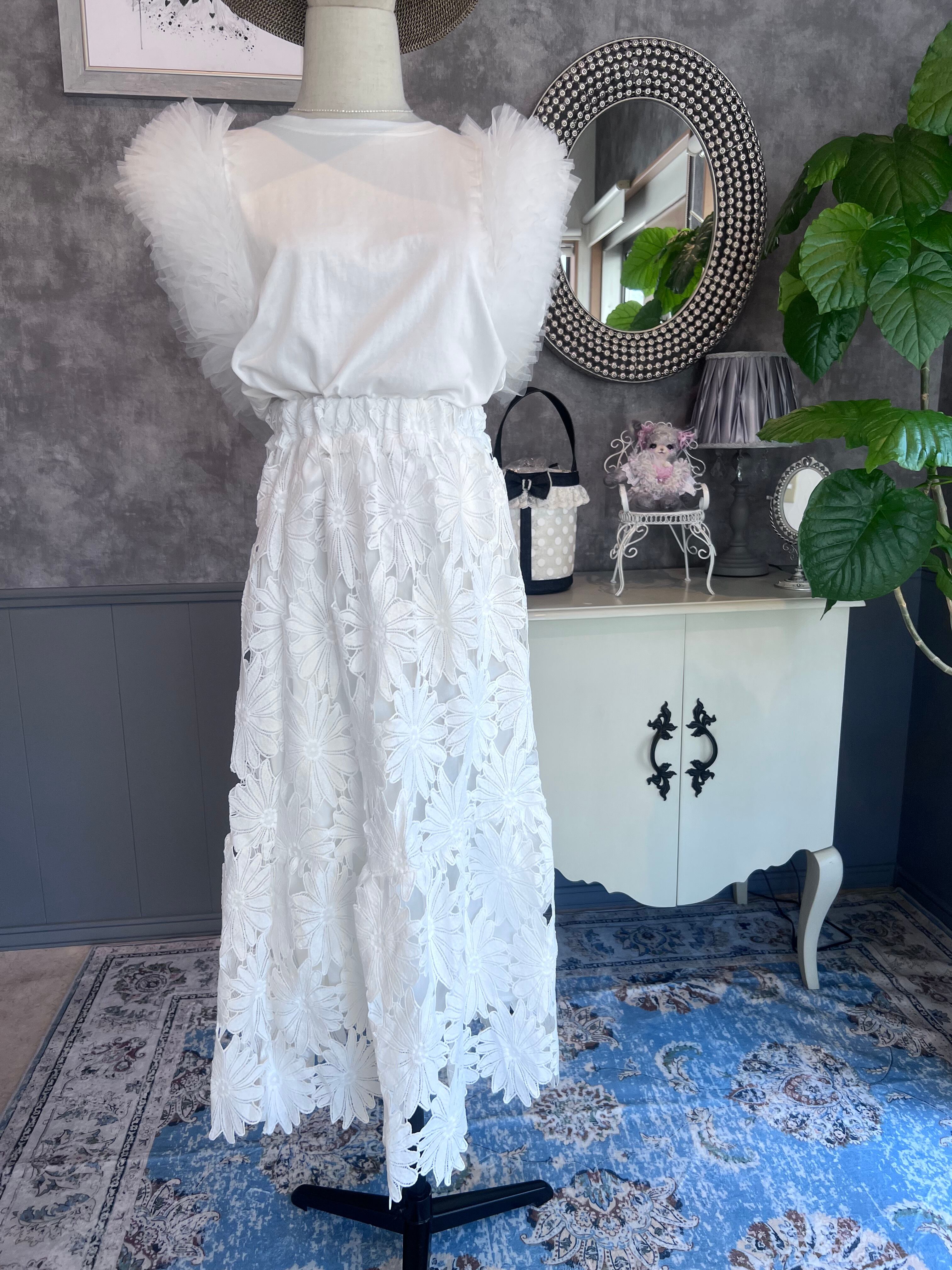 大人の女性にぴったりな「フラワーカットレース スカート White」は、大胆なレースデザインが魅力的なアイテムです。