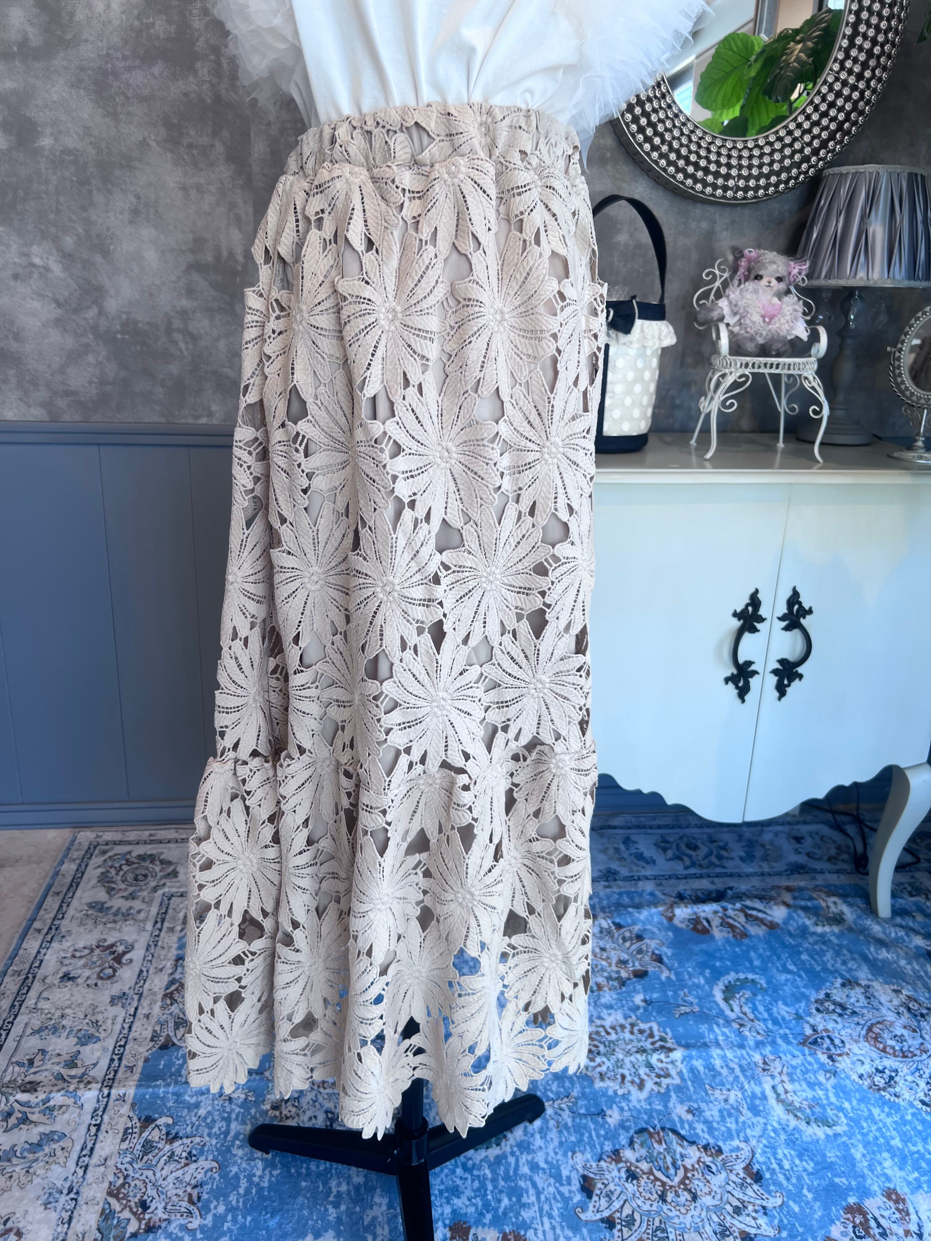 大人の女性にぴったりな「フラワーカットレース スカート beige」は、大胆なレースデザインが魅力的なアイテムです。