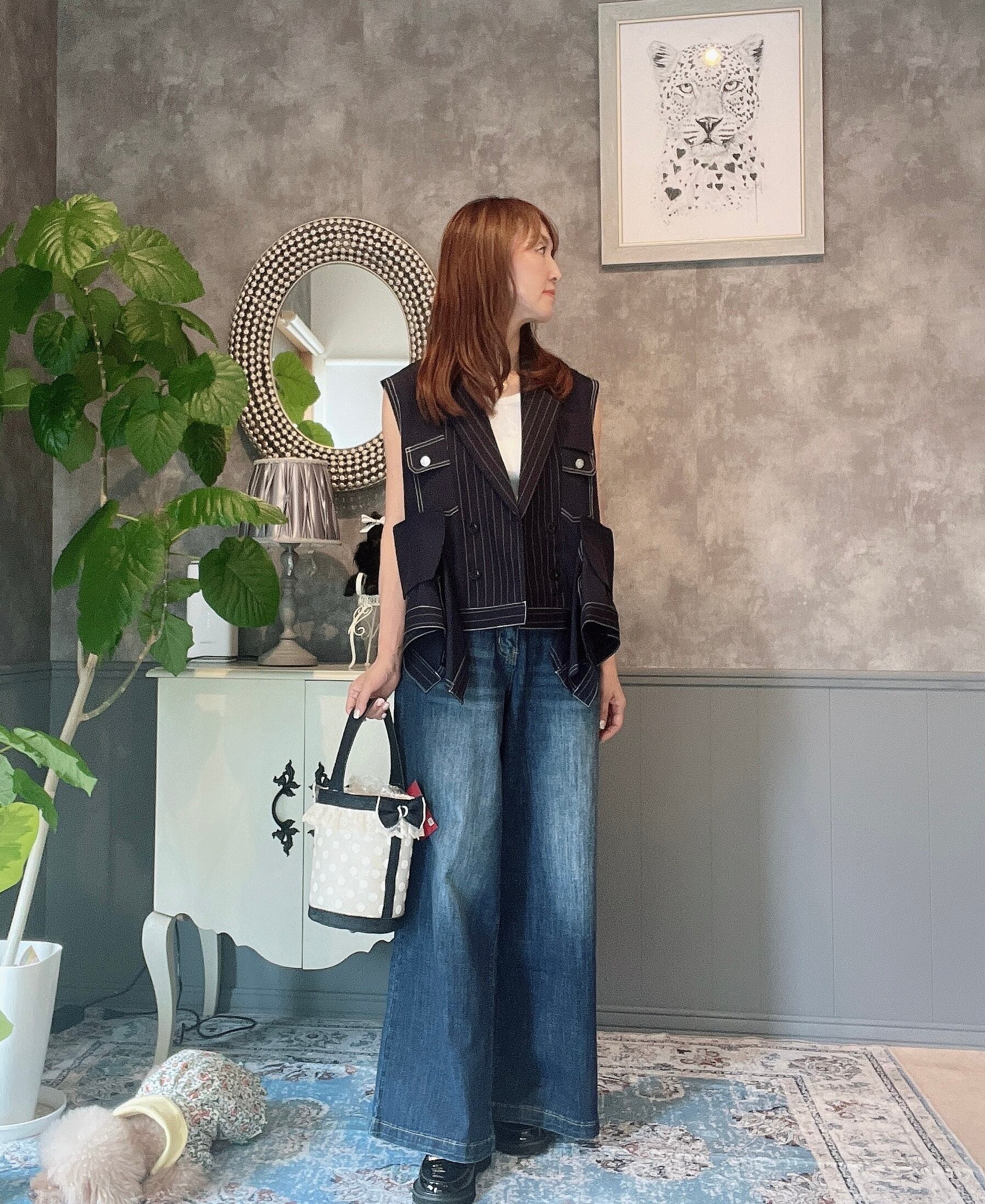 やや腰上のハイウエストでウエスト周りをすっきりと見せつつ、脚長効果も◎