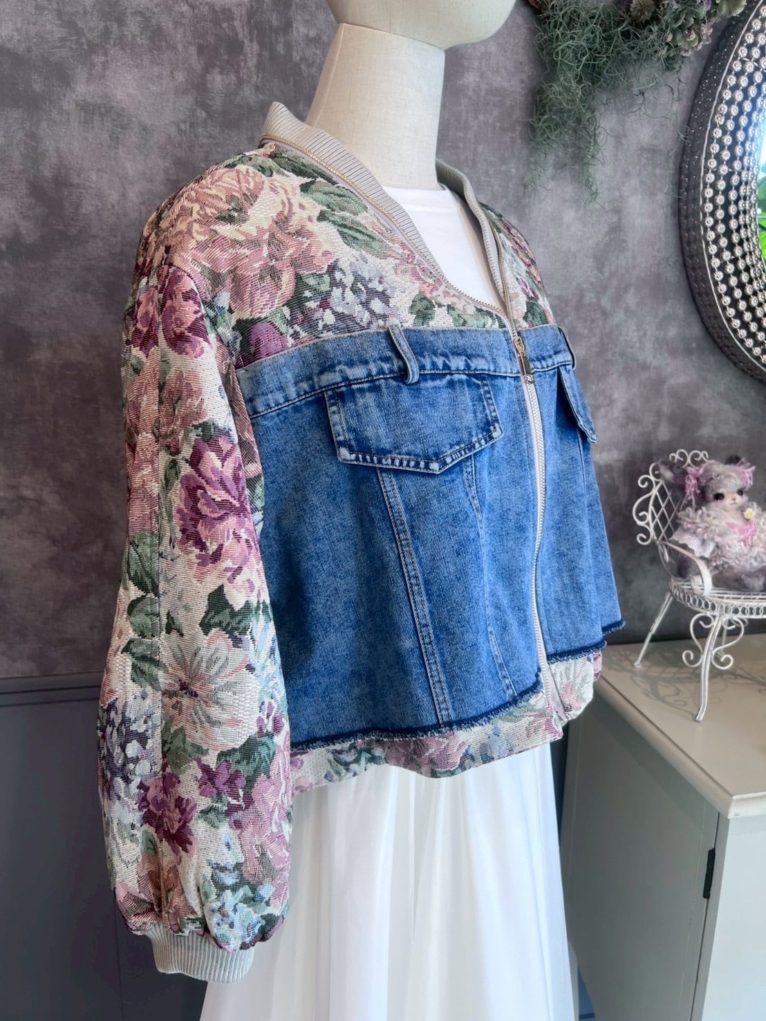 ●おしゃれなゴブランとデニムのドッキングが魅力のショート丈ジャケットです。