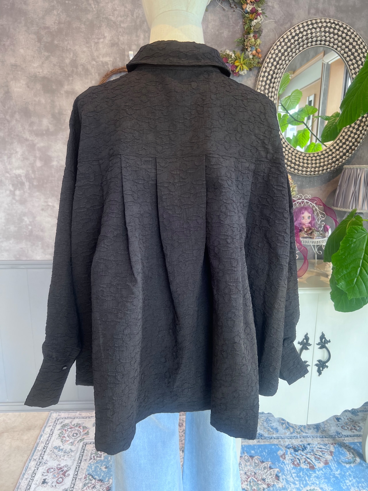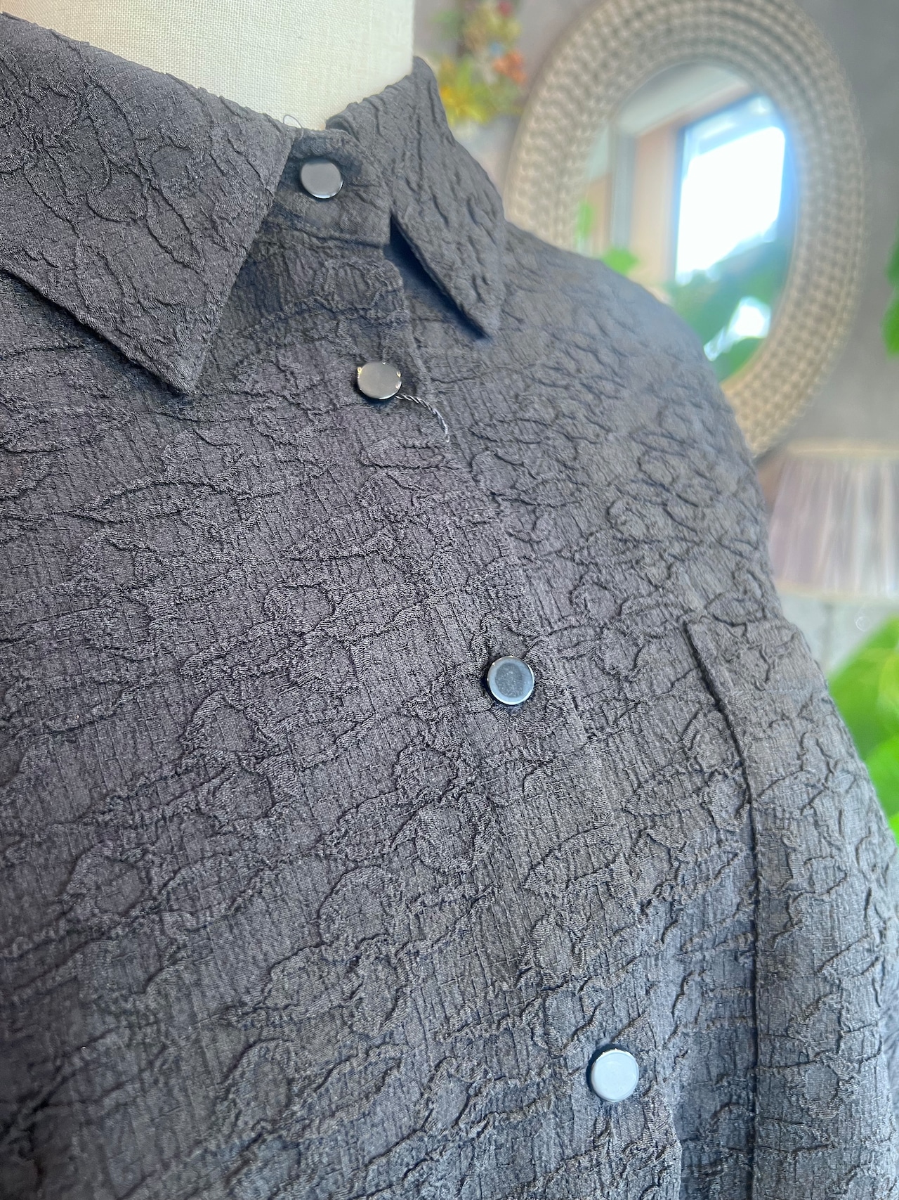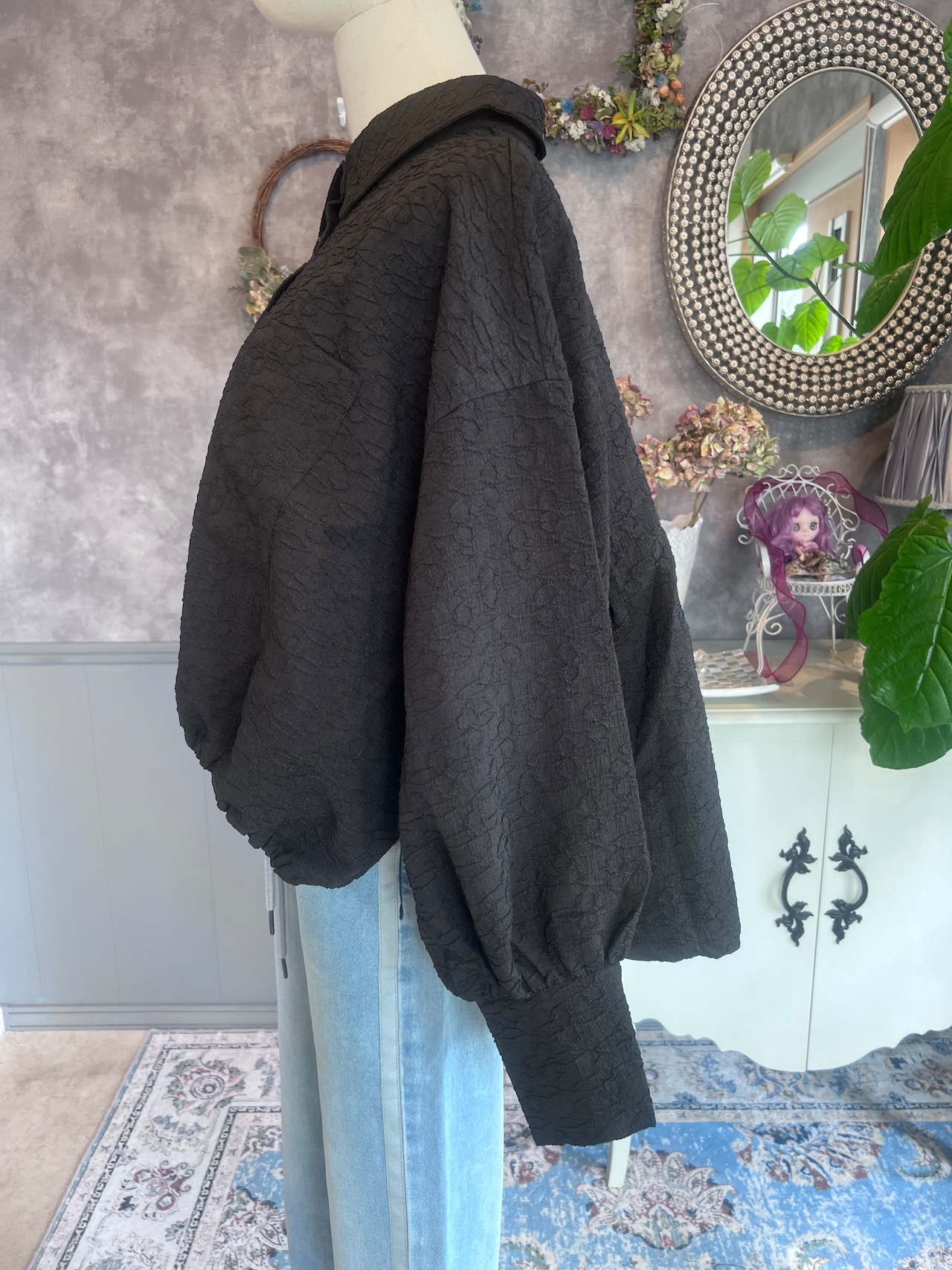 ・柔らかなジャガード素材を使用したショート丈のシャツで、軽やかな着心地とスタイルアップを実現します。