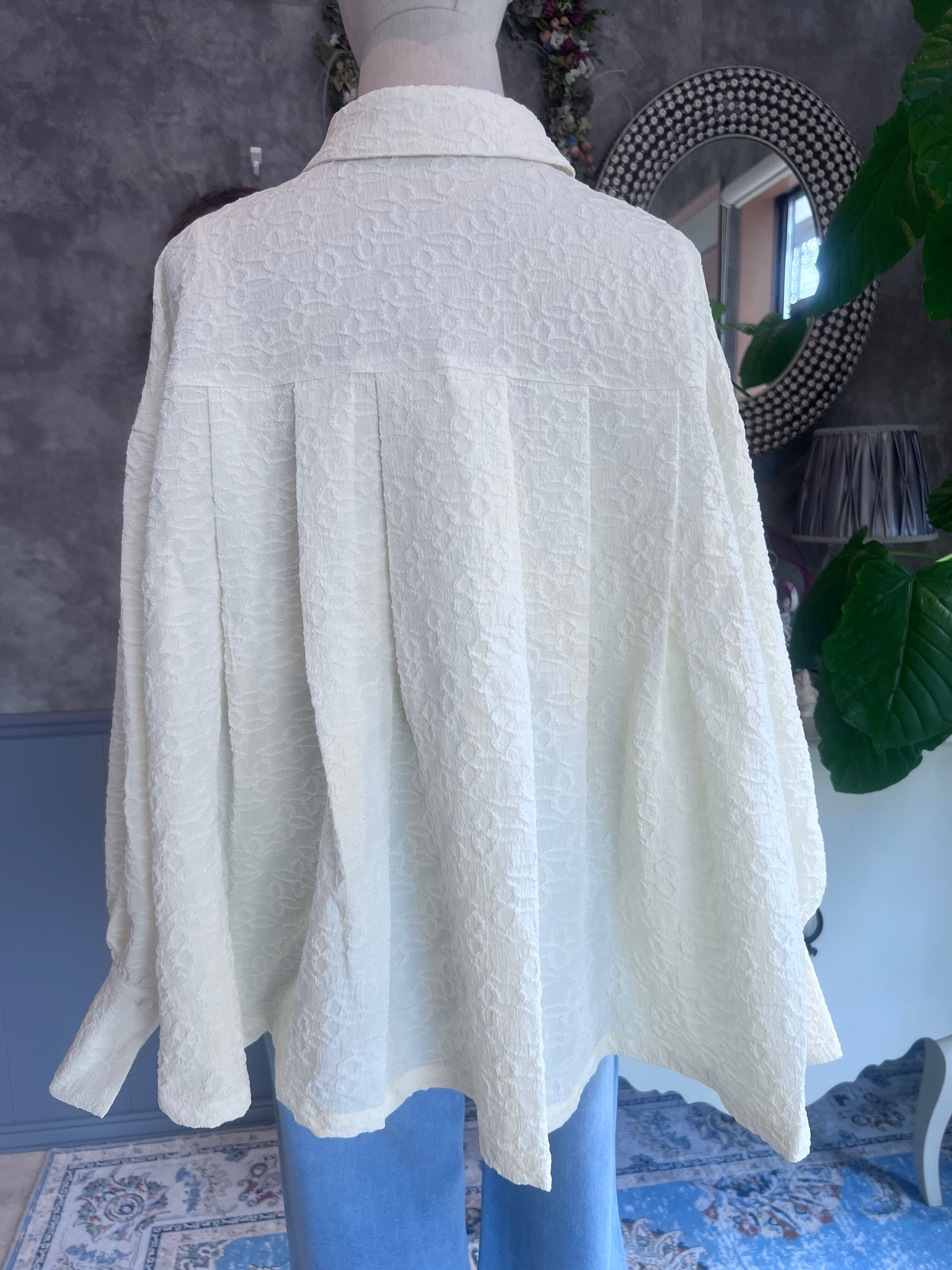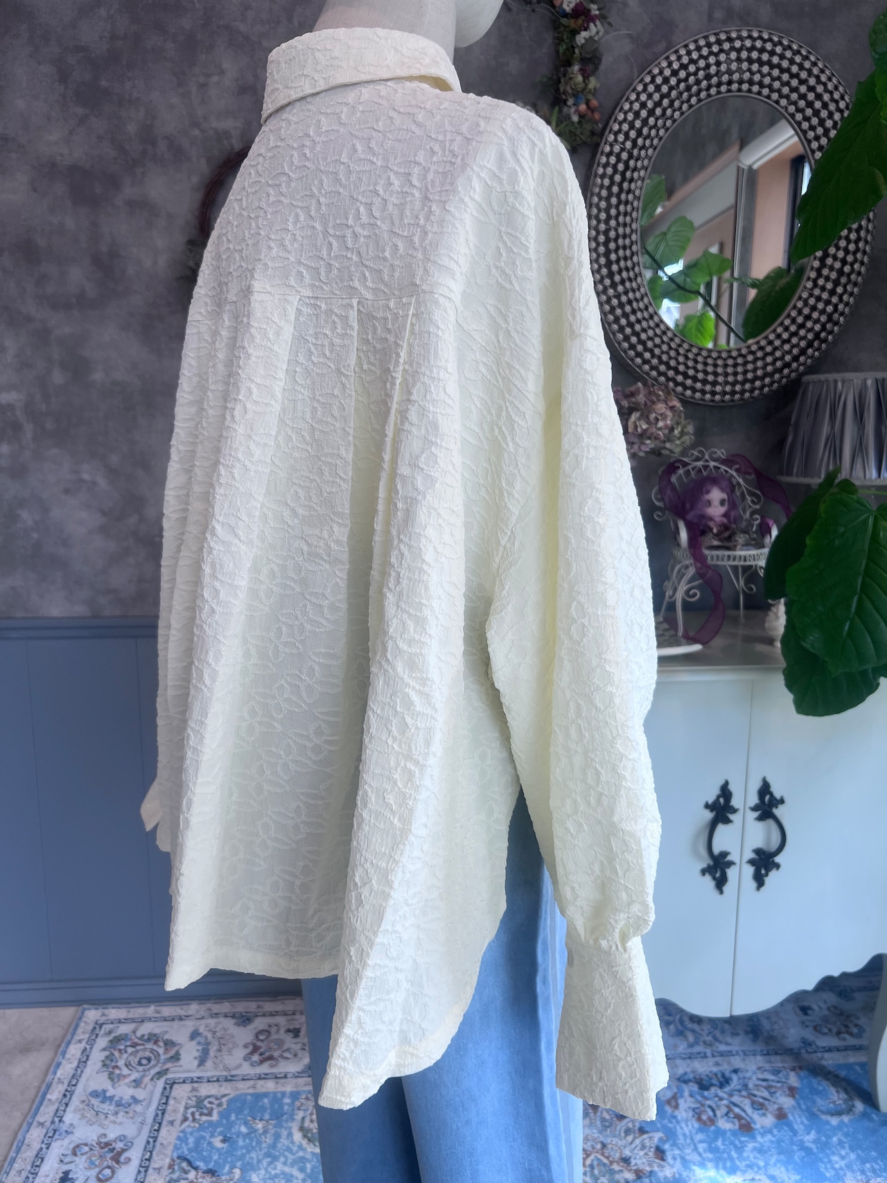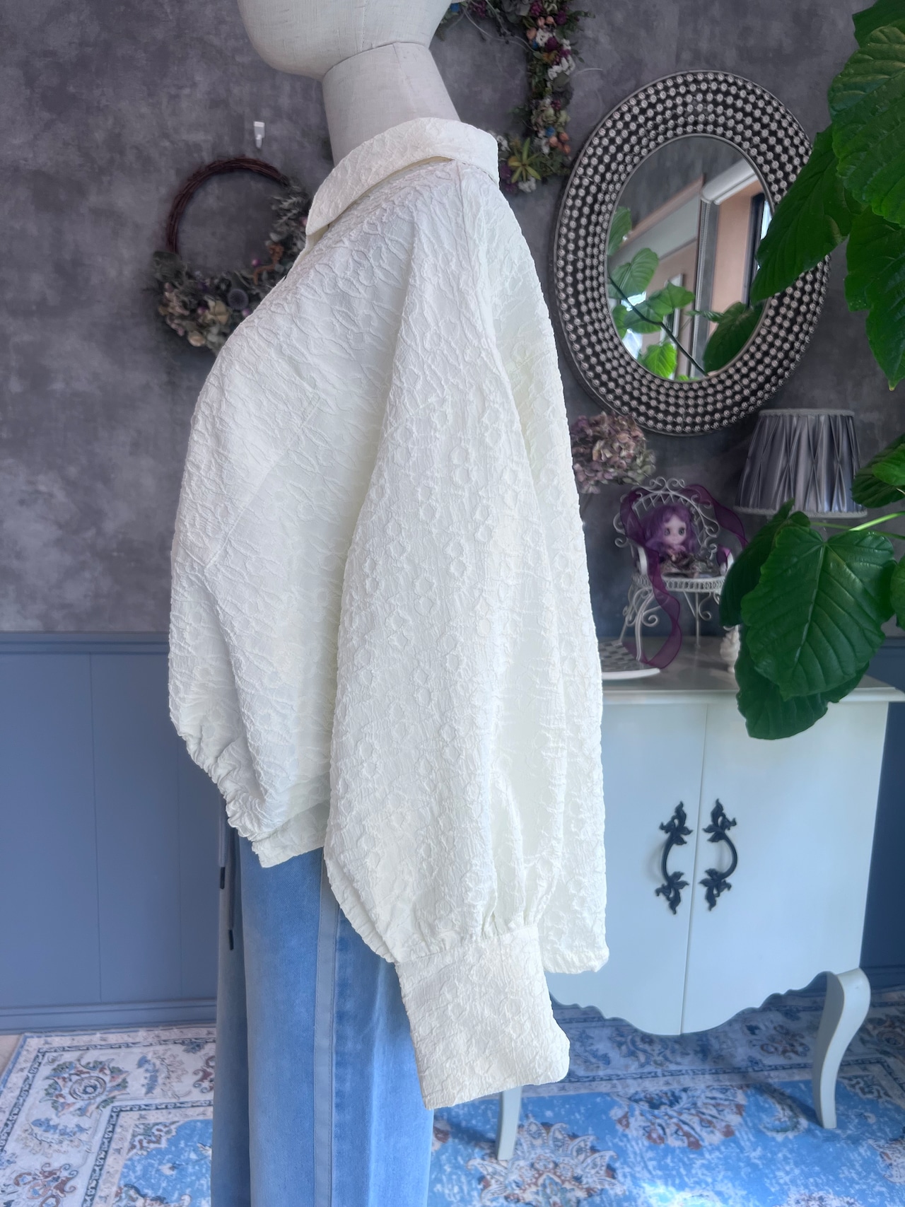 ・柔らかなジャガード素材を使用したショート丈のシャツで、軽やかな着心地とスタイルアップを実現します。