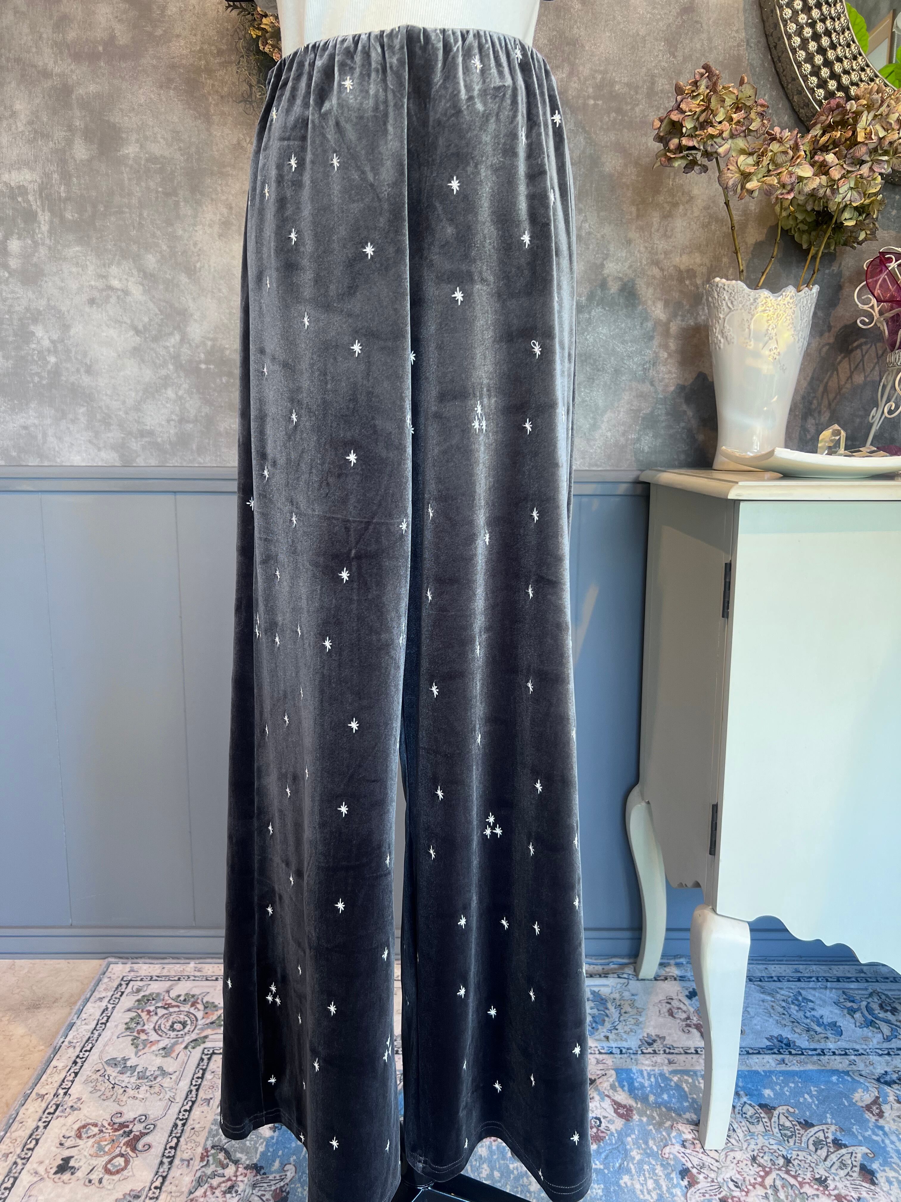 ・かわいらしい刺繍が施されたベロア素材のおしゃれなパンツです。
