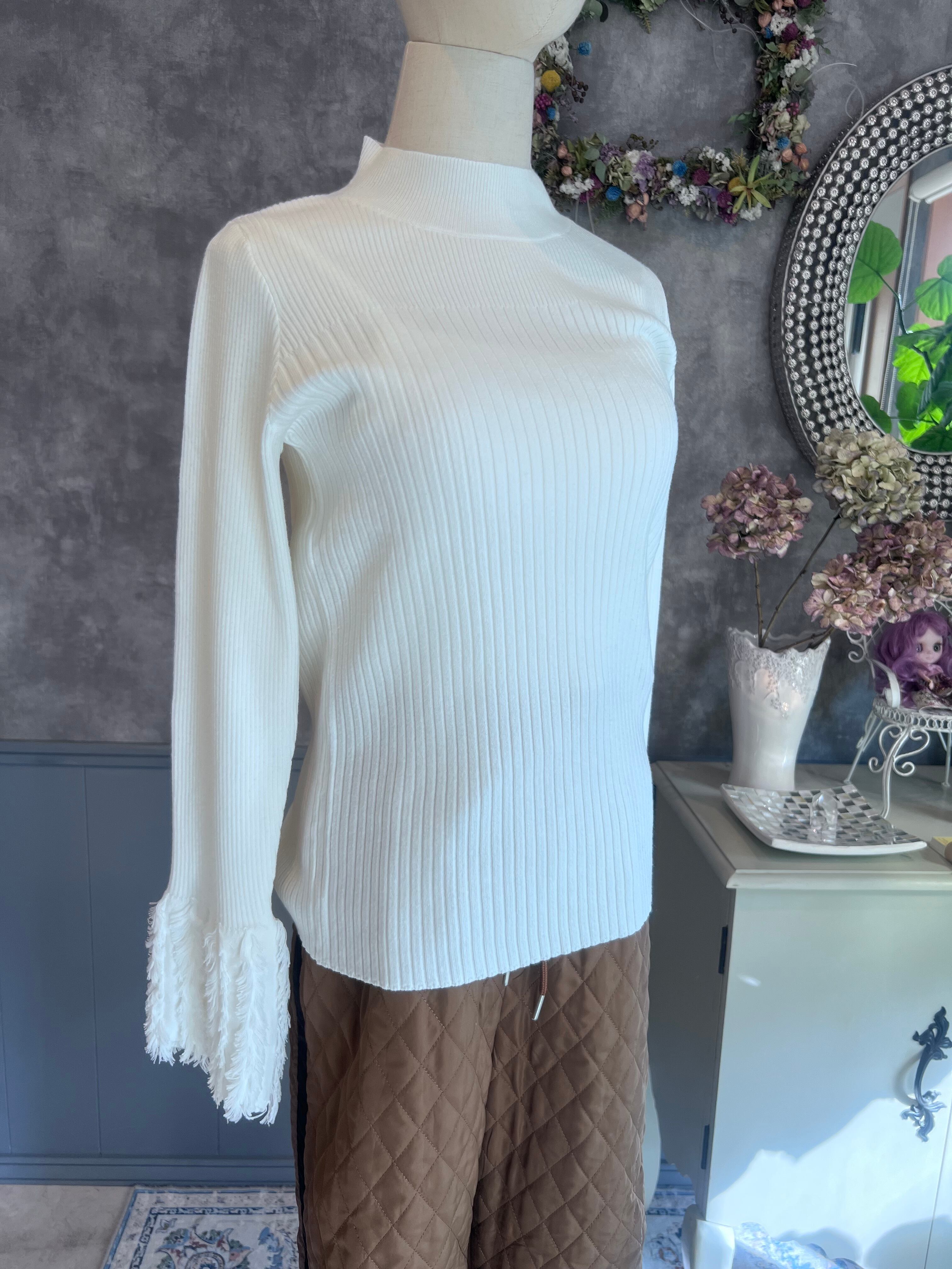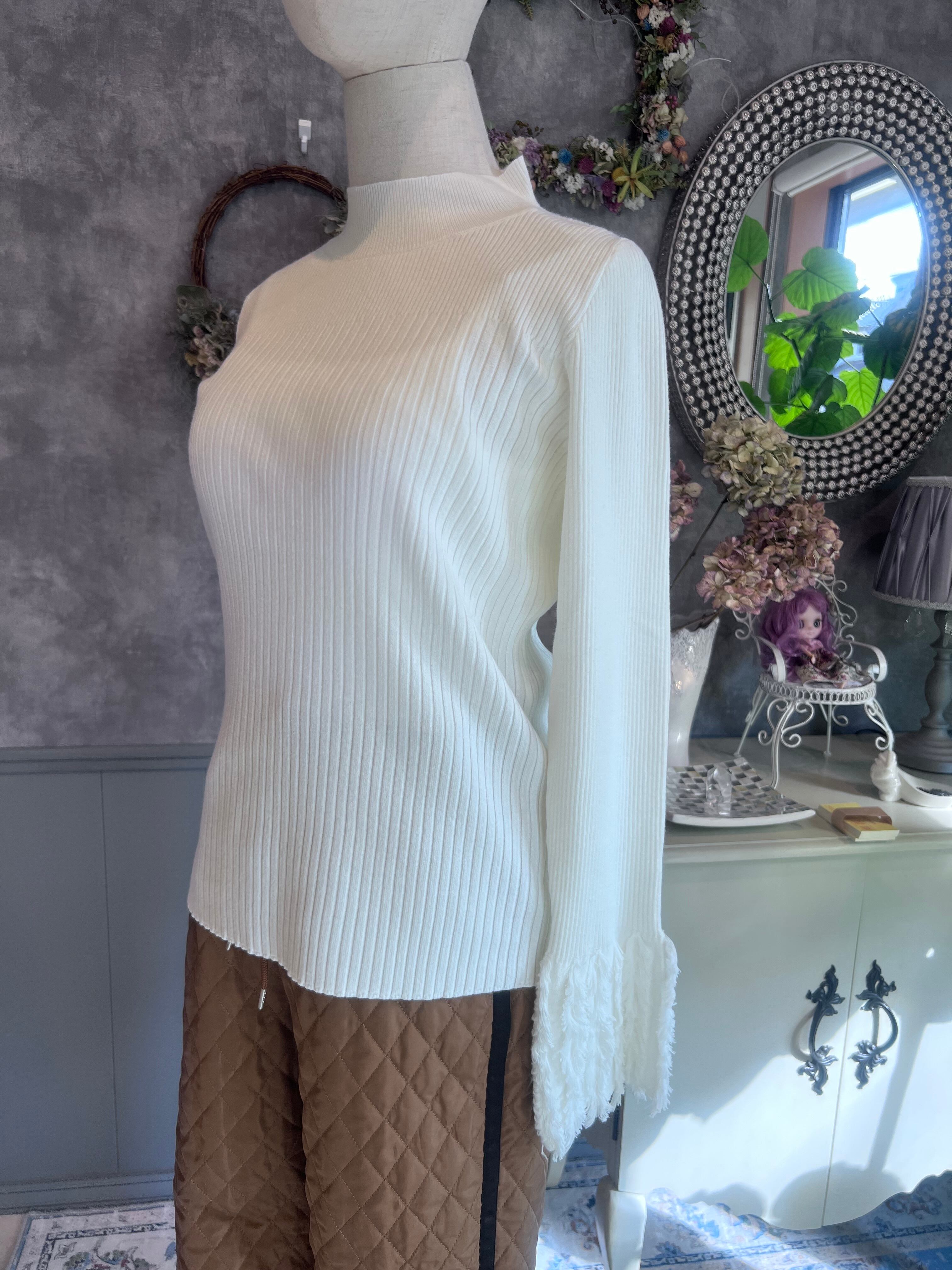 かわいらしいフリンジカフスが魅力的なリブニット。