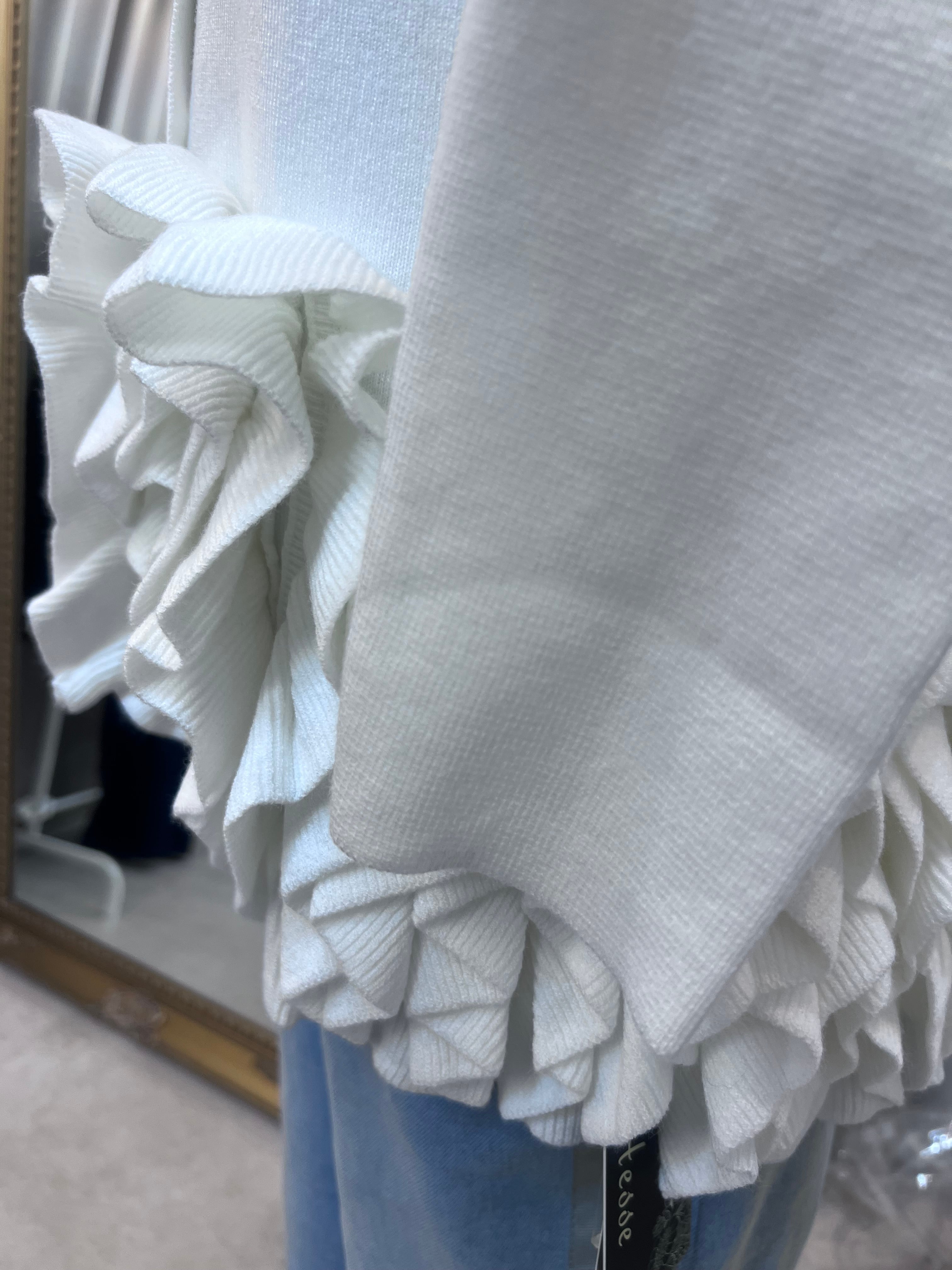 このカーディガンは、ふんわりとした裾のフリルが魅力的で、一枚でおしゃれな印象を与えてくれます。