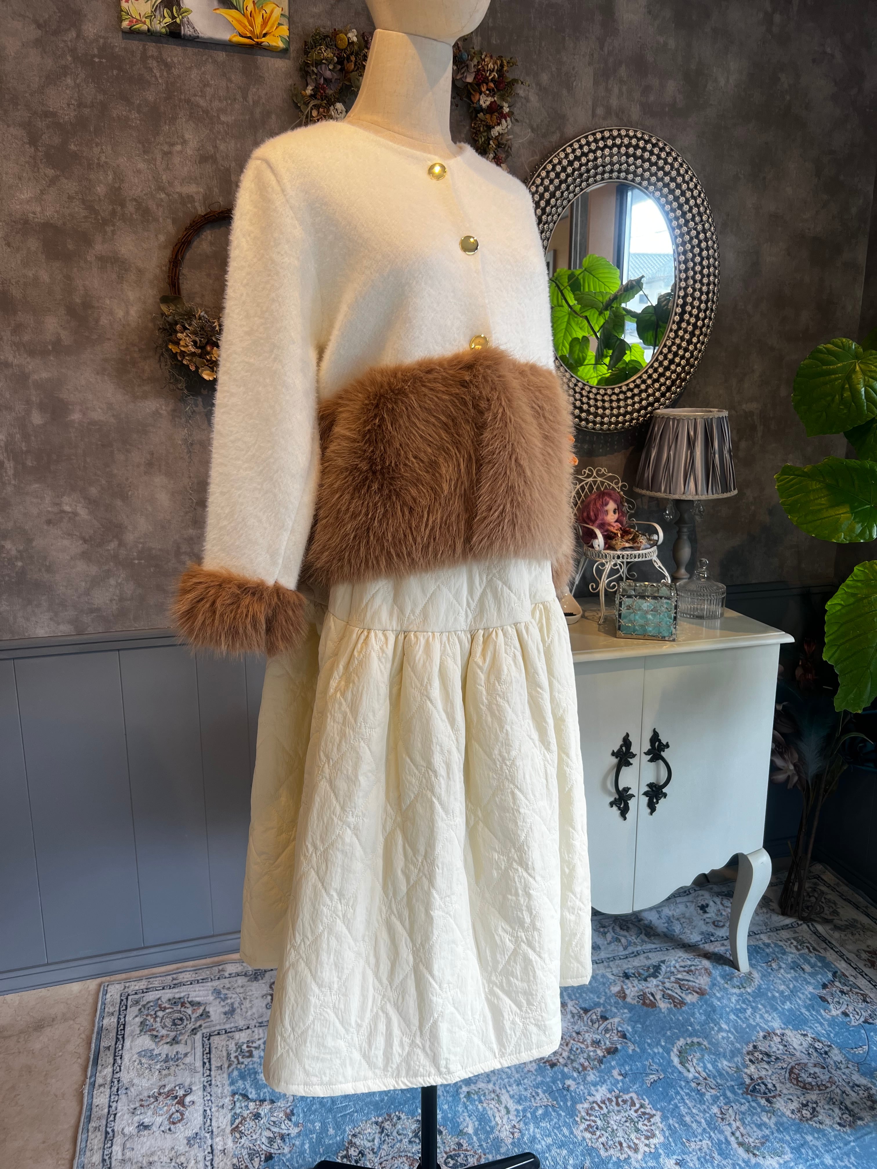ふんわりとしたファーが裾と袖口に施されており、かわいらしさを引き立てます。