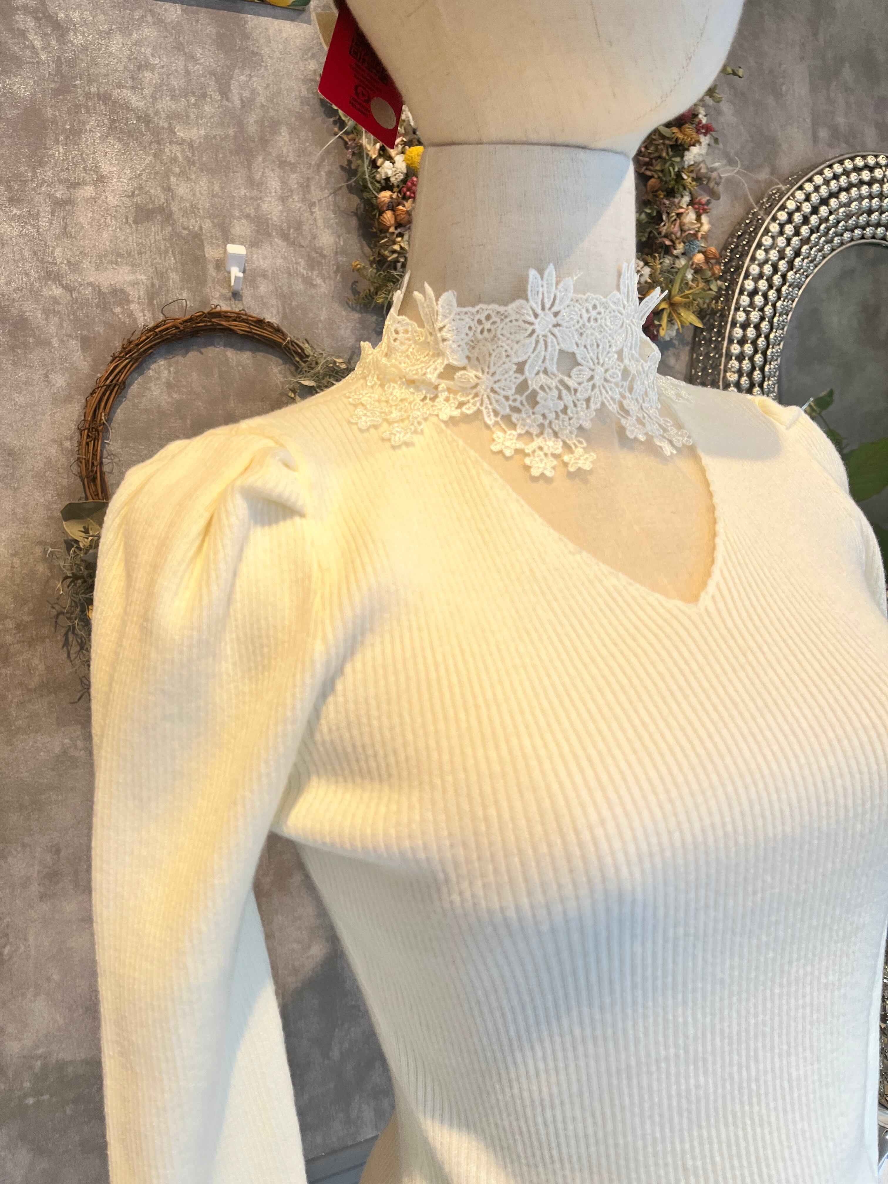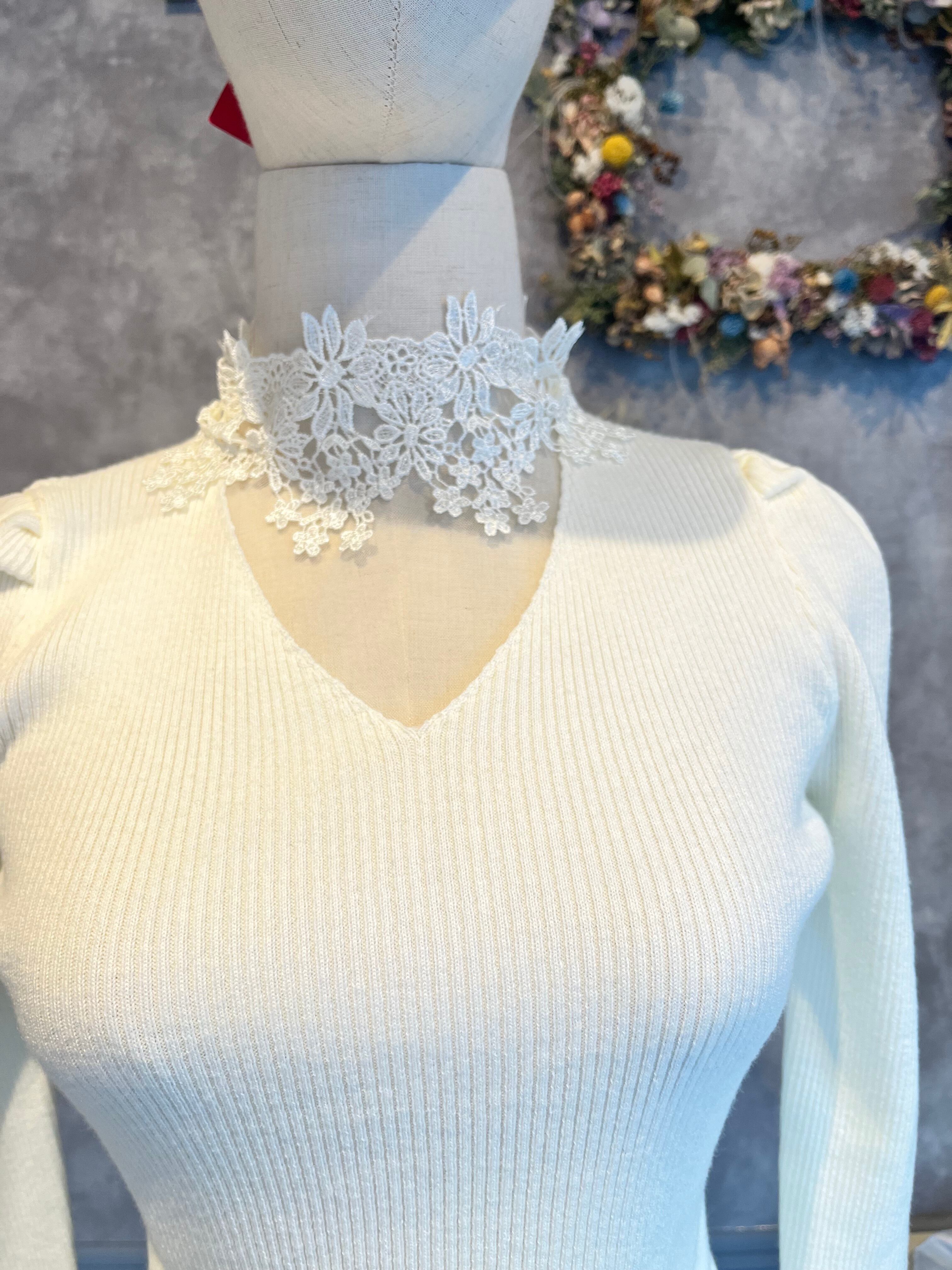 首元と手首に施されたレースが、女性らしさを引き立ててくれます。