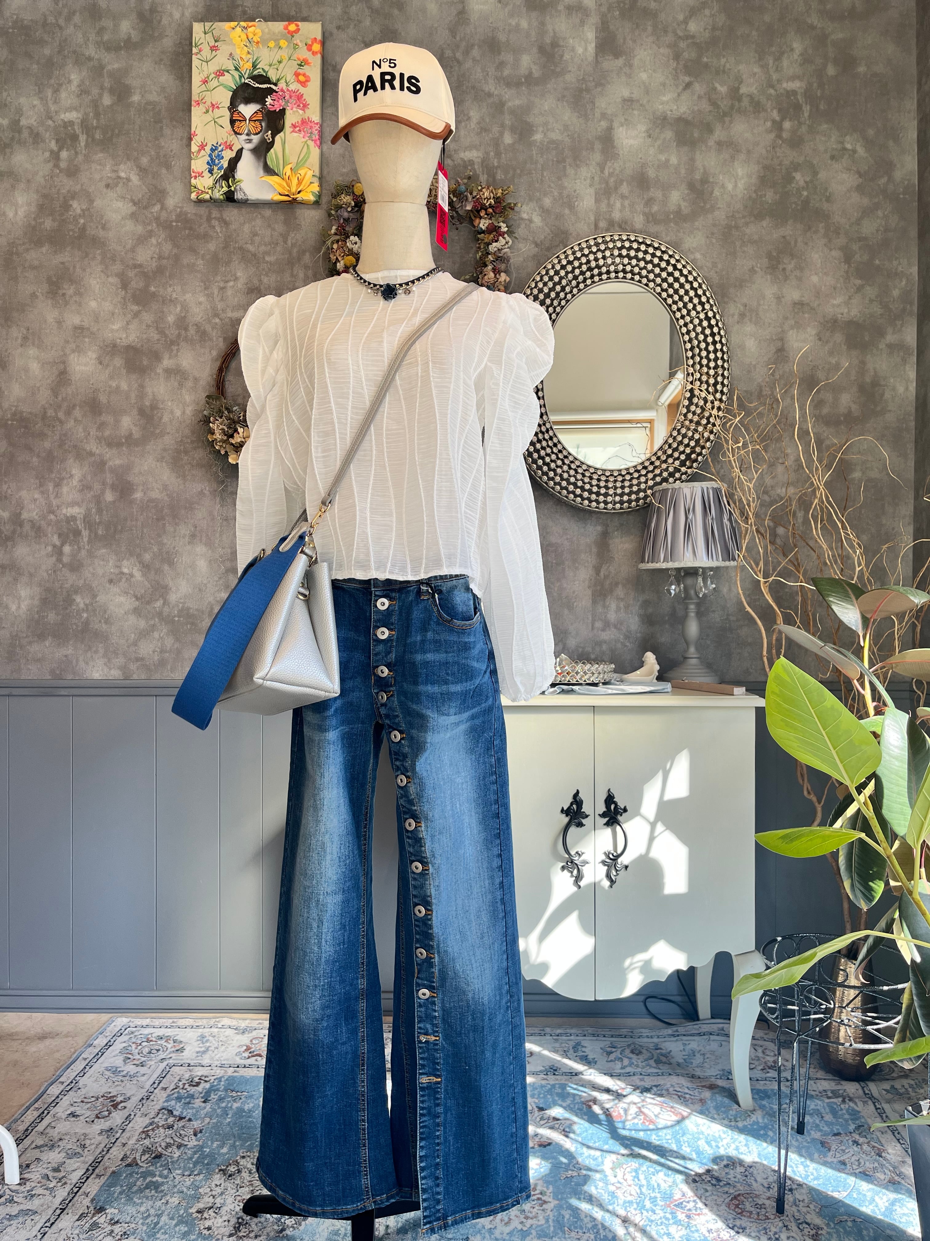 フロントに縦に並んだボタンが、美脚ラインを演出します。