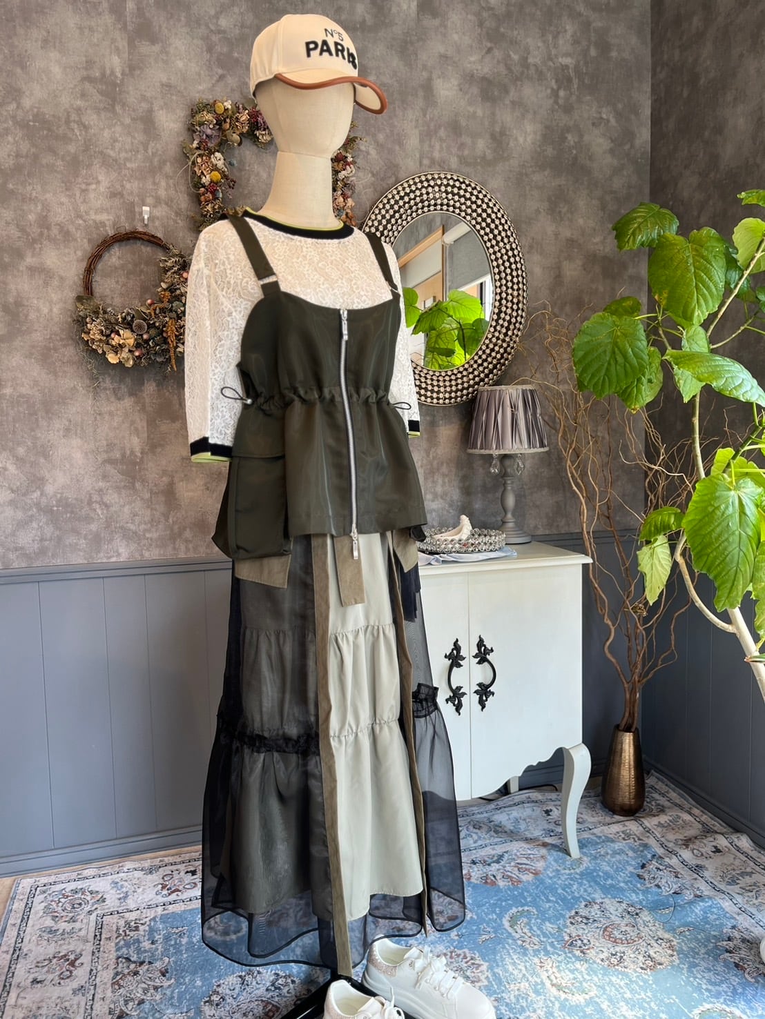 異素材を重ねたレイヤードデザインが印象的なロングスカート。