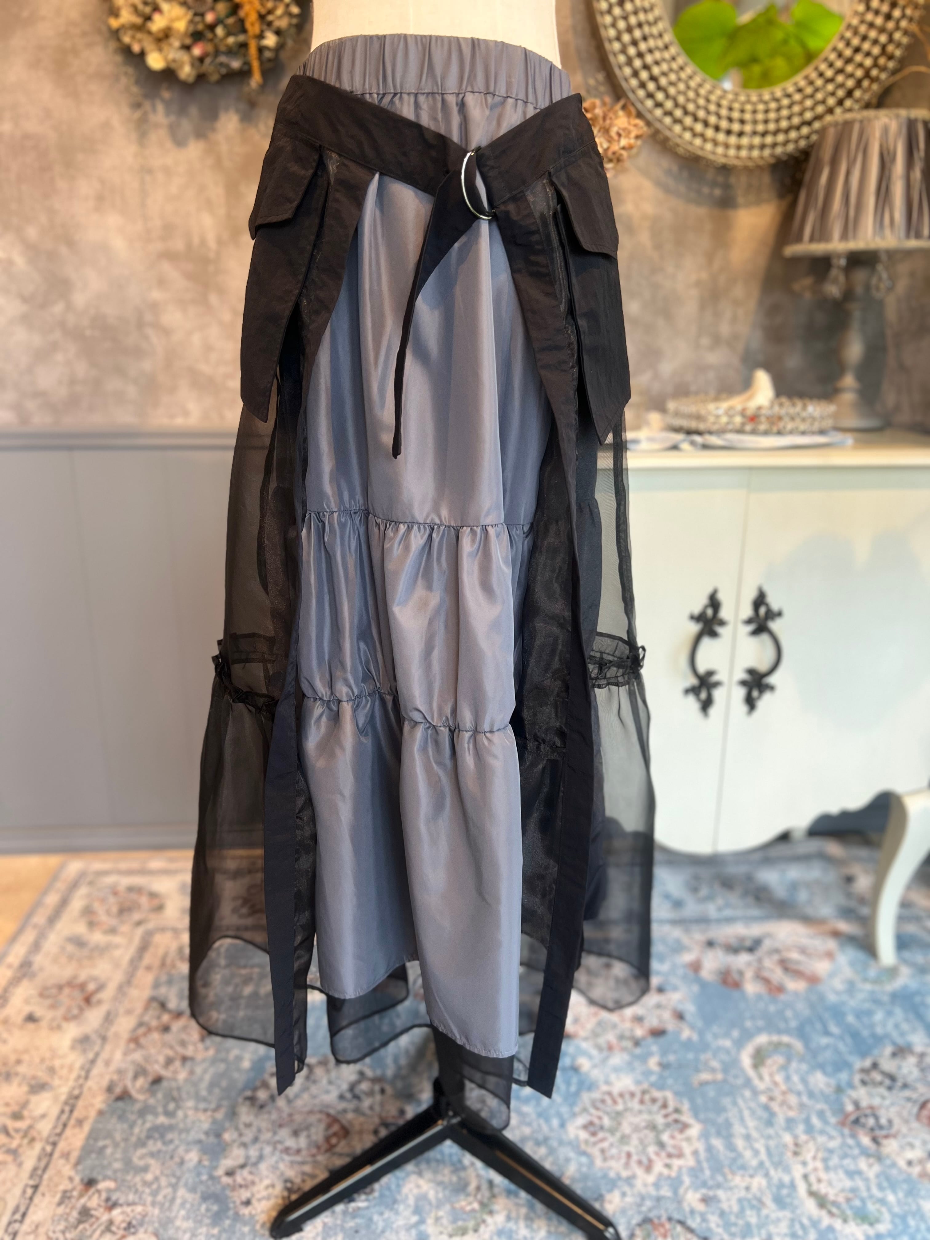 異素材を重ねたレイヤードデザインが印象的なロングスカート。