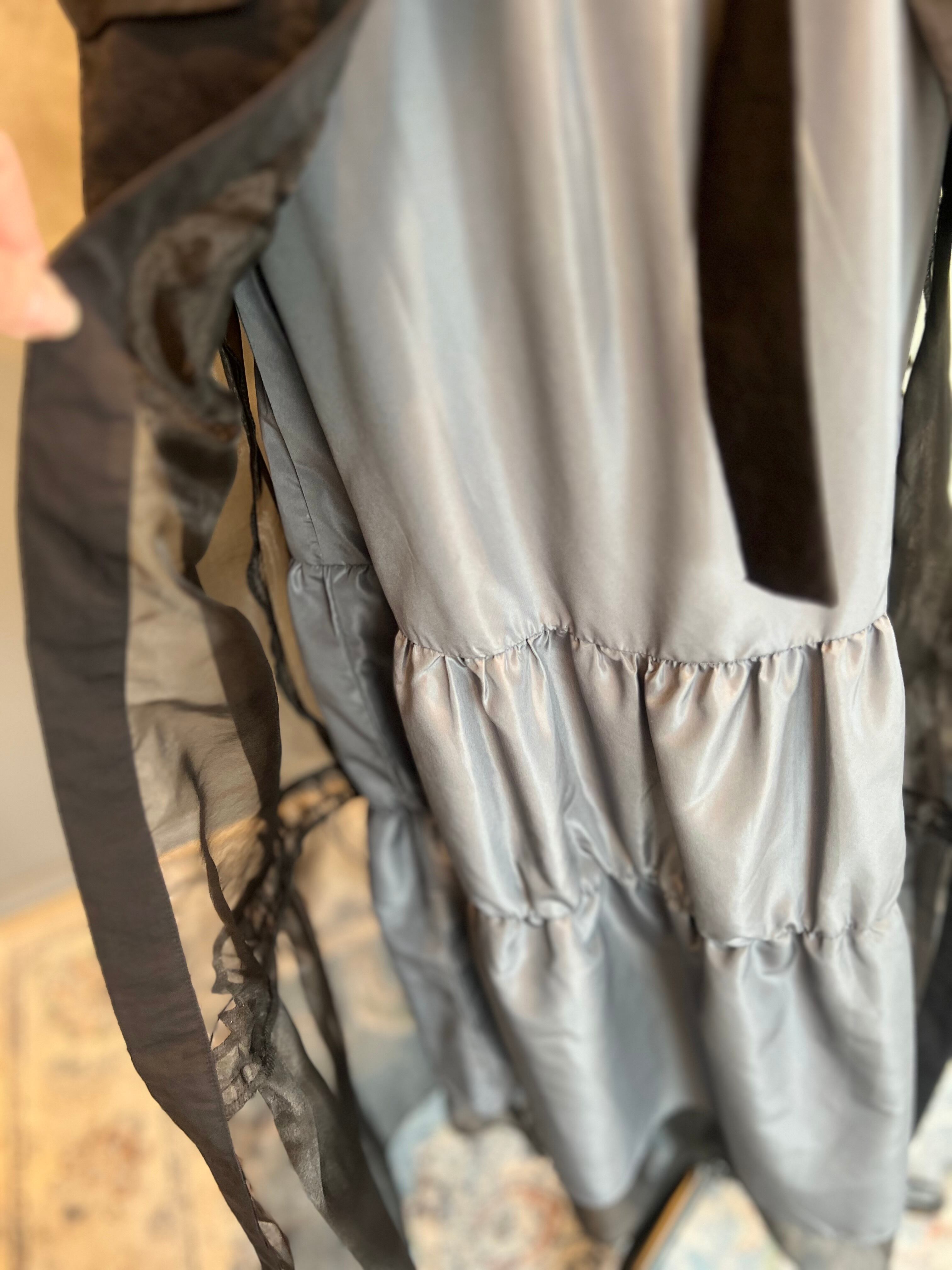 透け感のあるチュール素材と、センターに配された別布が立体的な表情を生み出し、動くたびにニュアンスのあるシルエットを演出します。