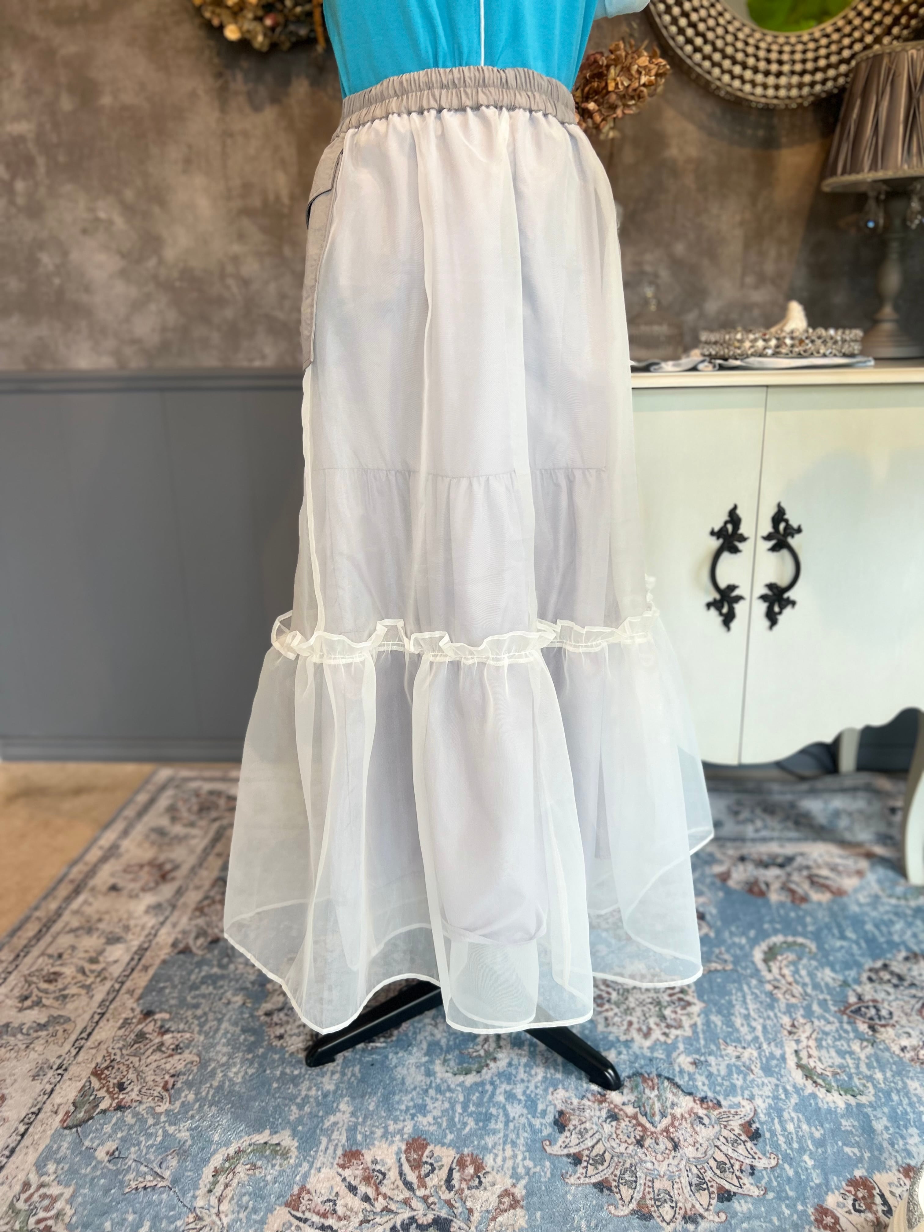 透け感のあるチュール素材と、センターに配された別布が立体的な表情を生み出し、動くたびにニュアンスのあるシルエットを演出します。