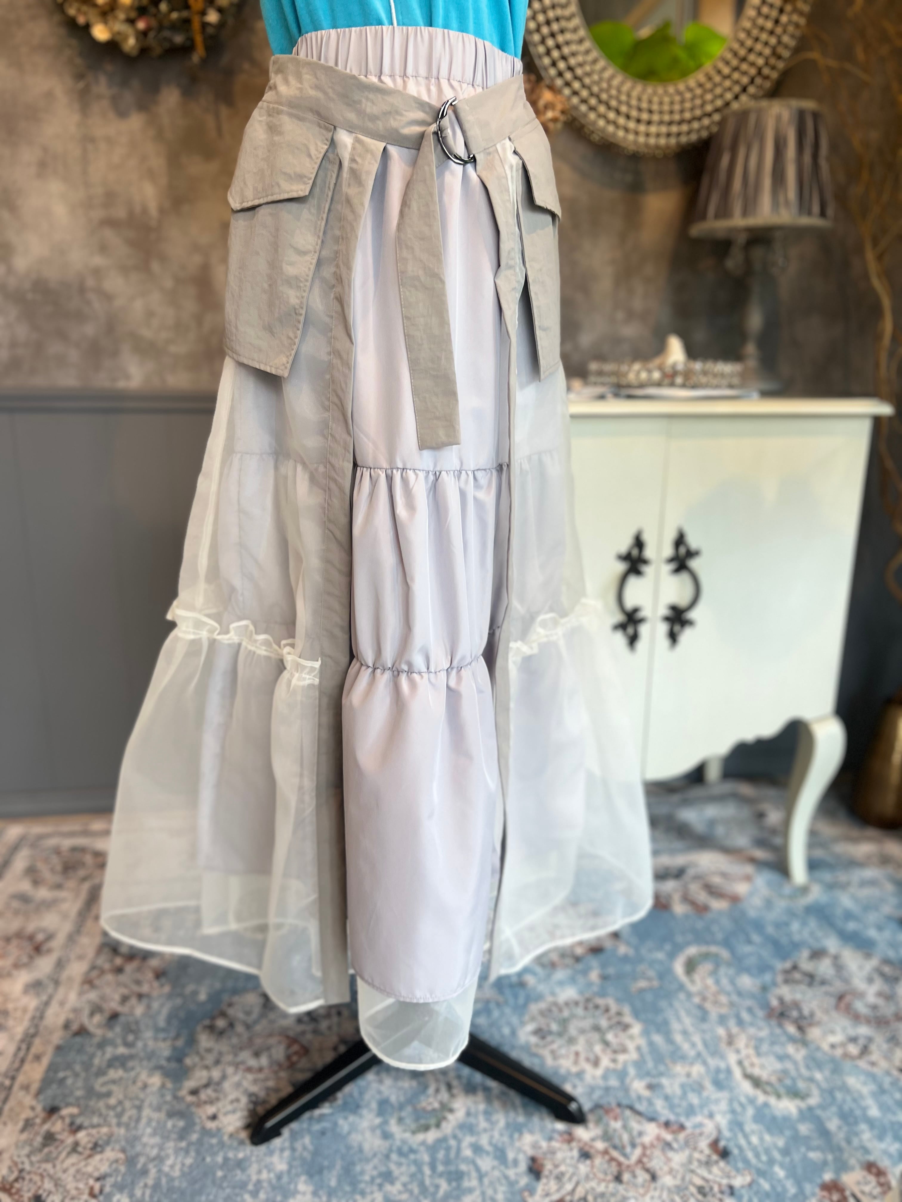 異素材を重ねたレイヤードデザインが印象的なロングスカート。
