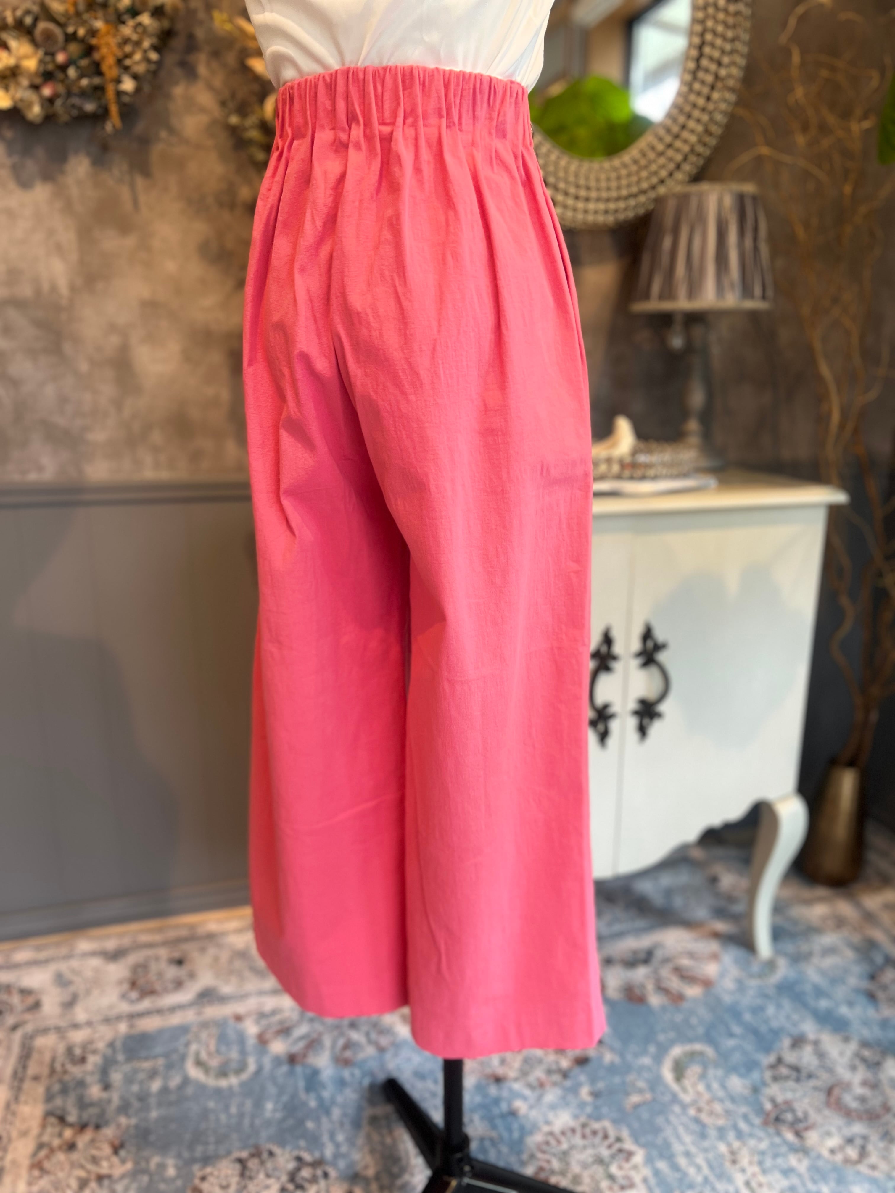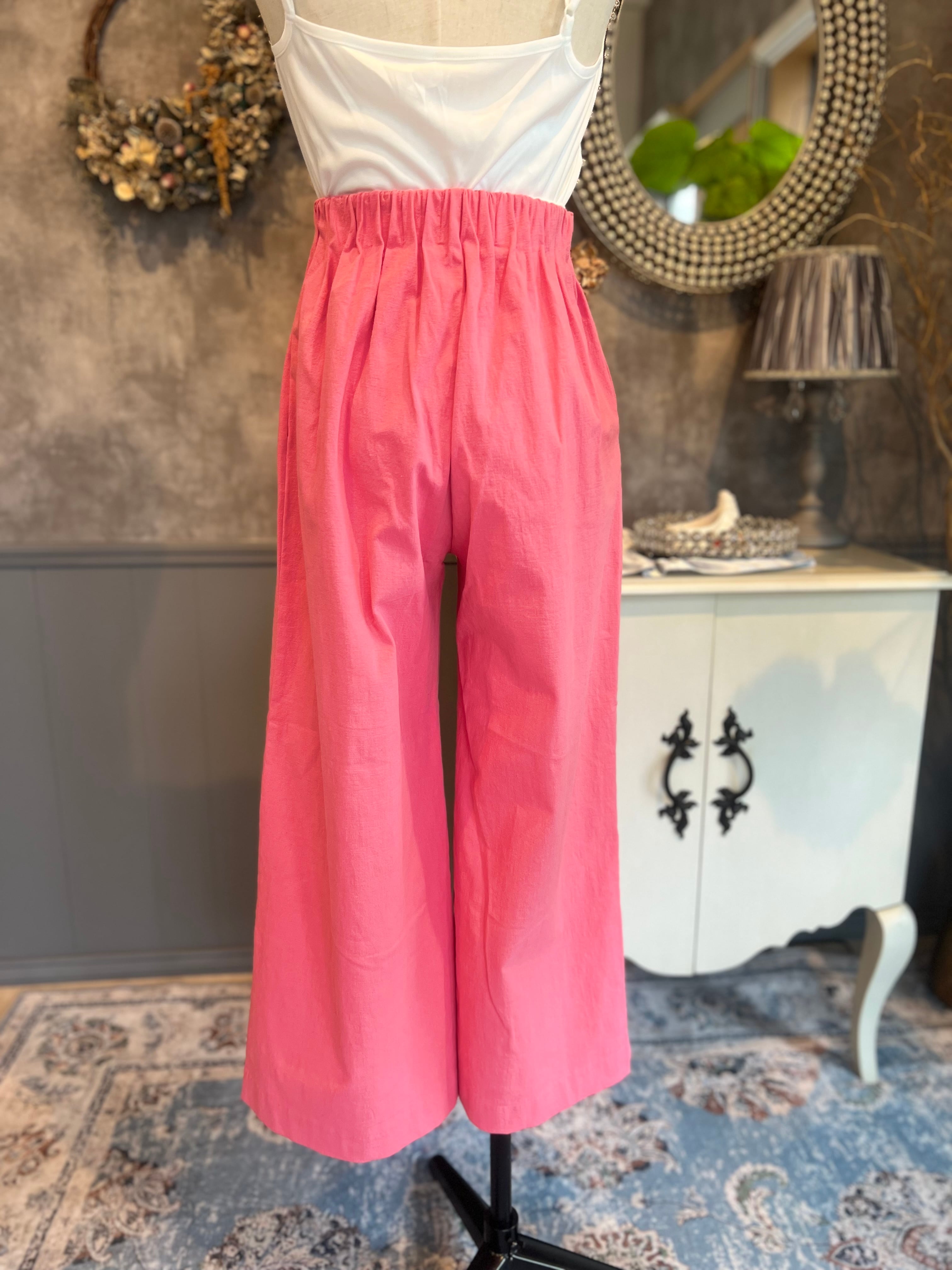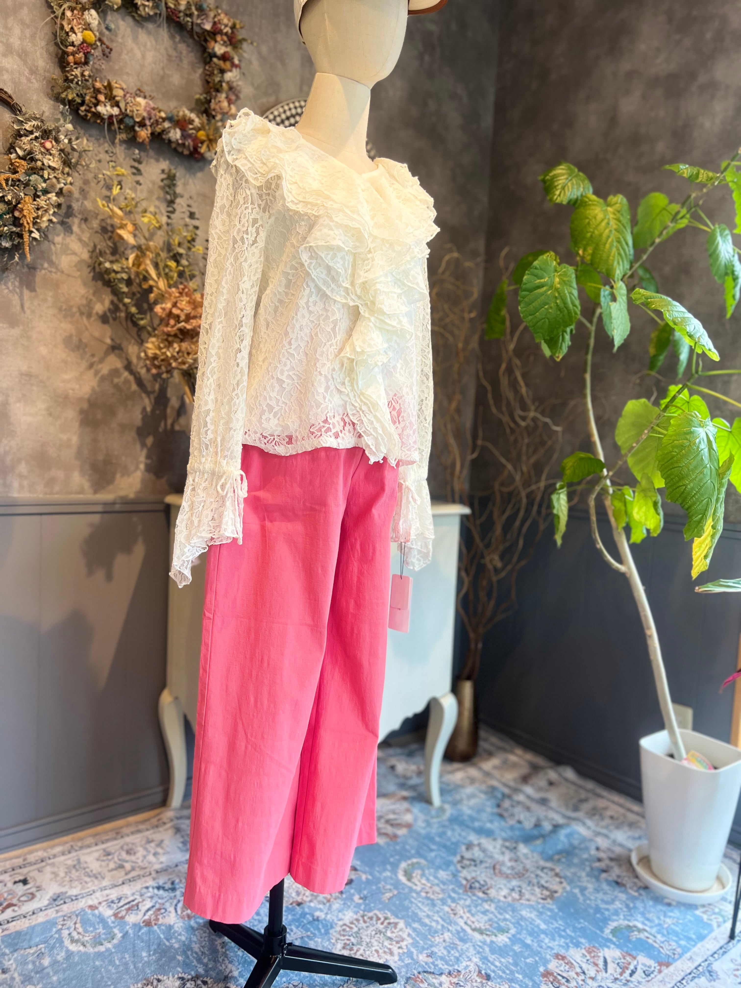 シンプルながらもウエストギャザーを施す事で立体感を出し、ストレッチ+ゆったりワイドシルエットで動きやすく快適な履き心地に。