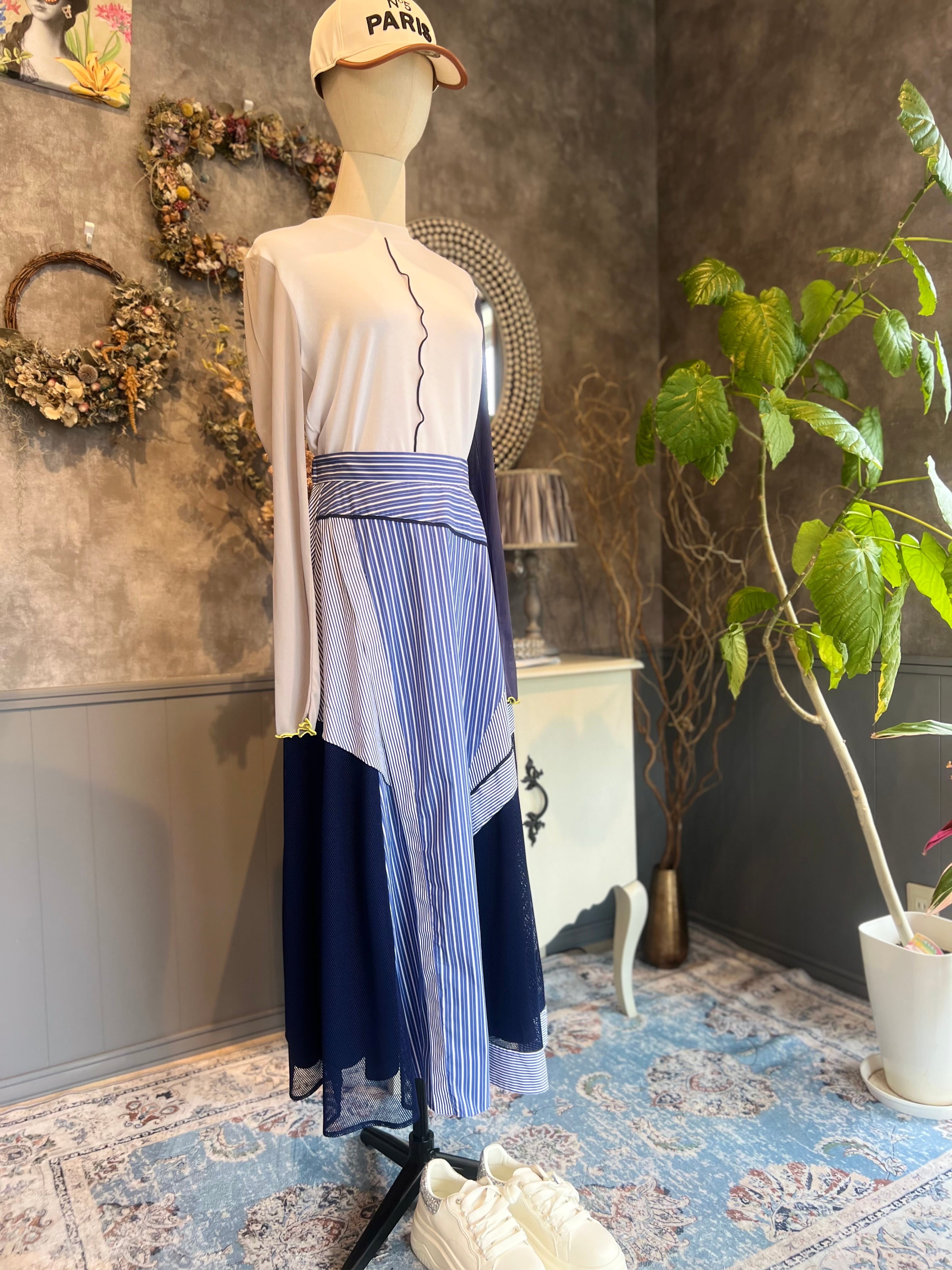 メッシュとストライプの異素材を組み合わせ、アシンメトリーなシルエットが洗練された印象を与えます。