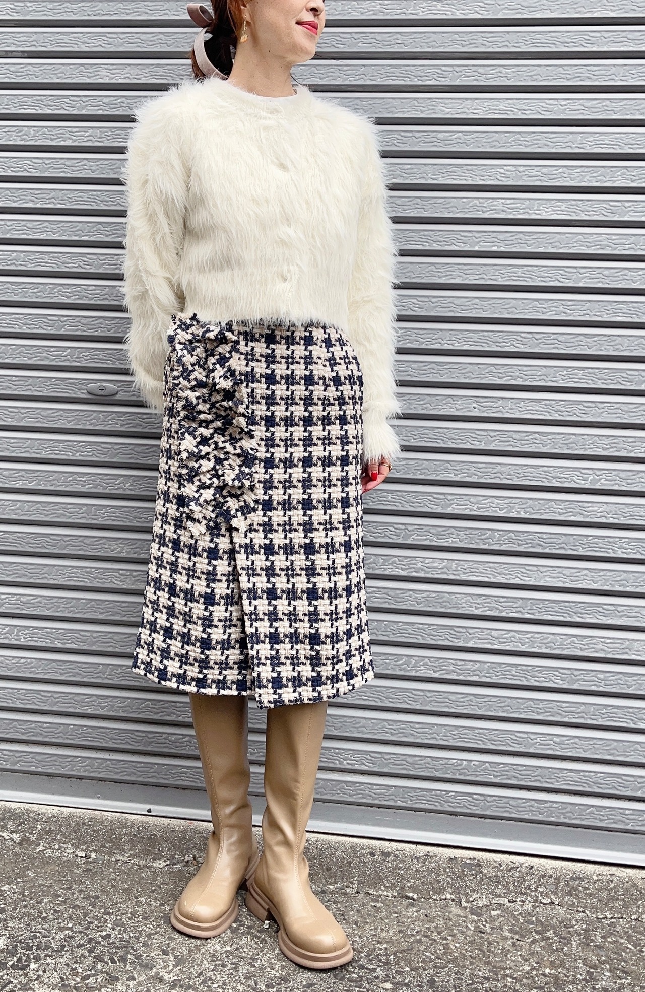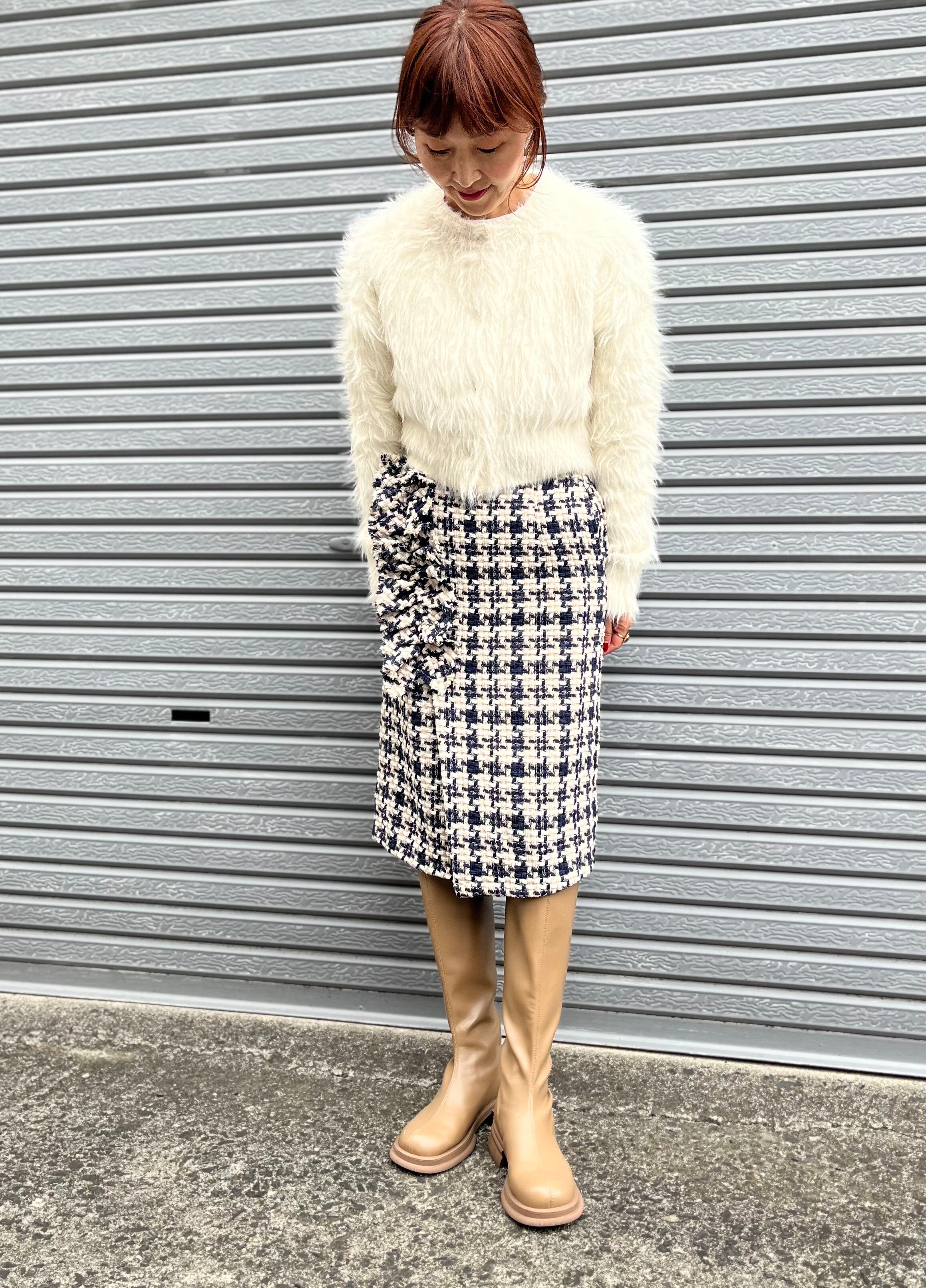 明るいカラーのミックスツイードでお作りしたスカートは、、秋冬コーデに華やか、着映えする1着となりそうです。