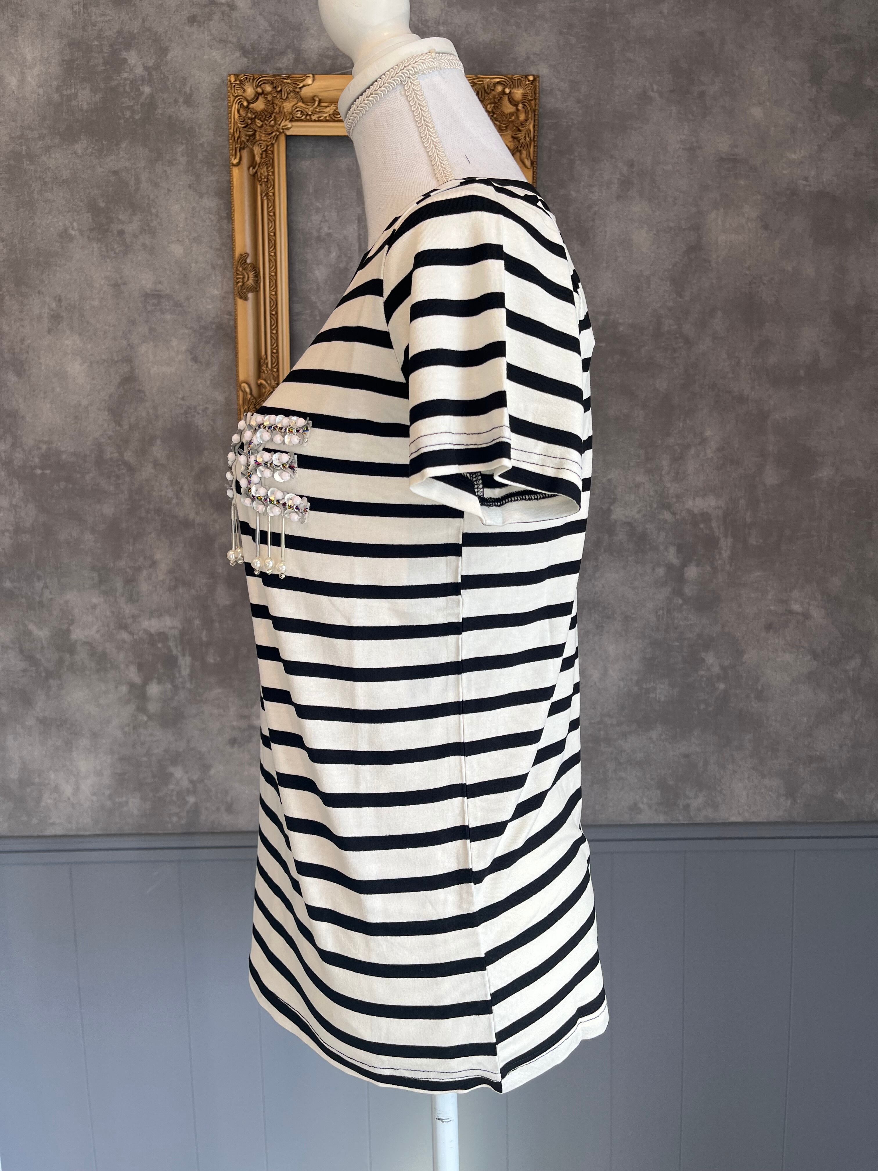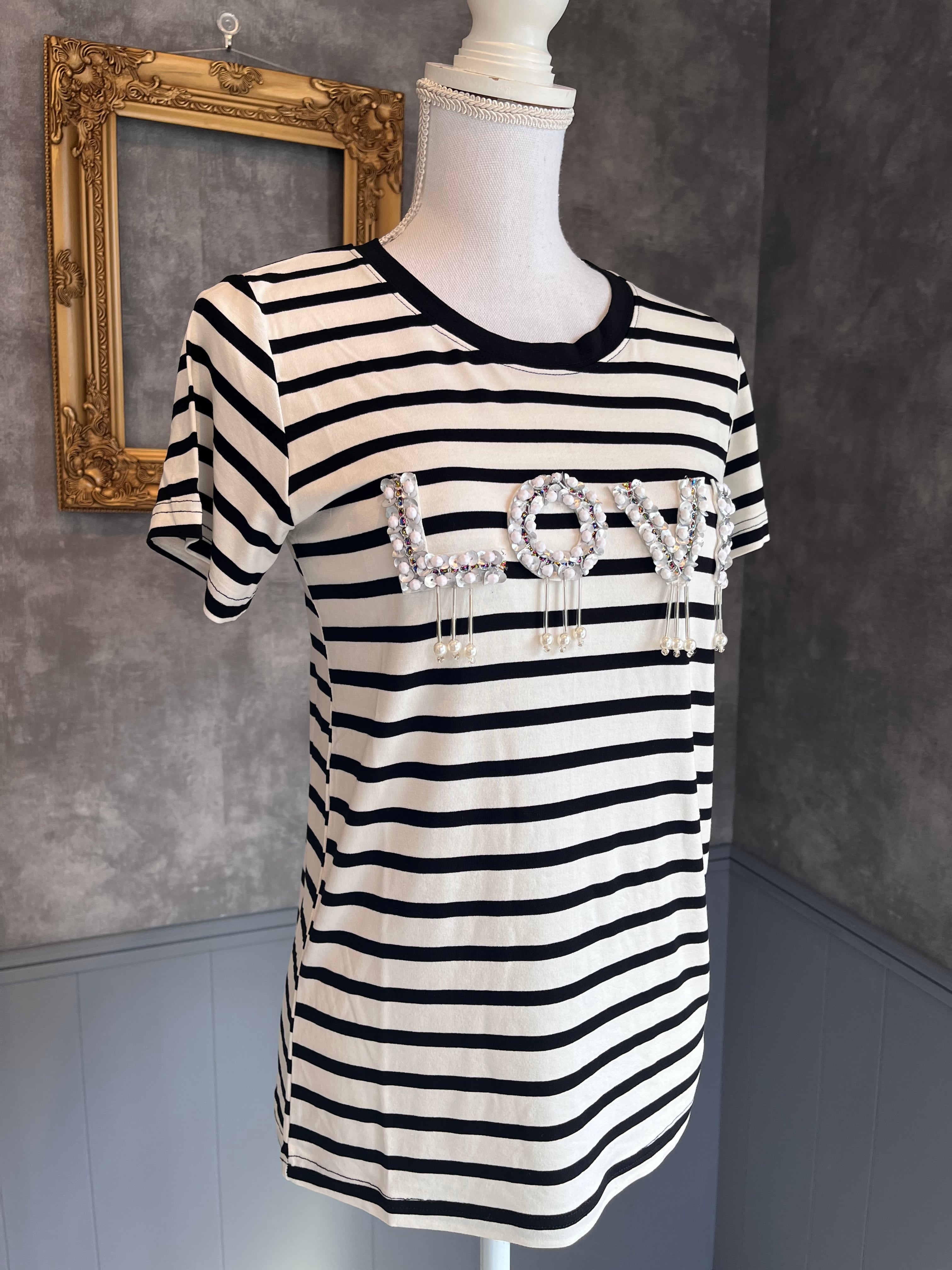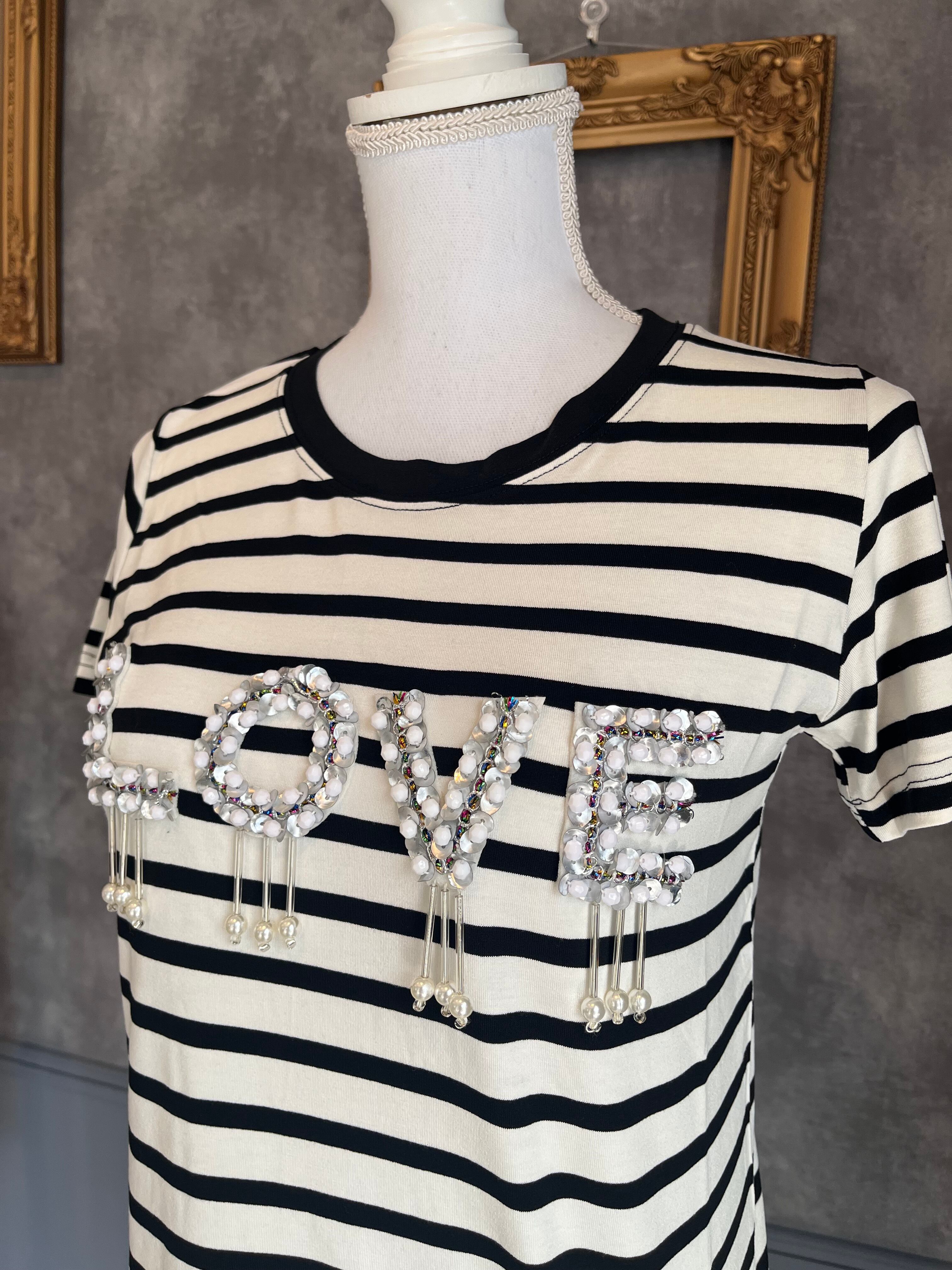 スパンコールやパールなどでデコっているLOVE Tシャツです。