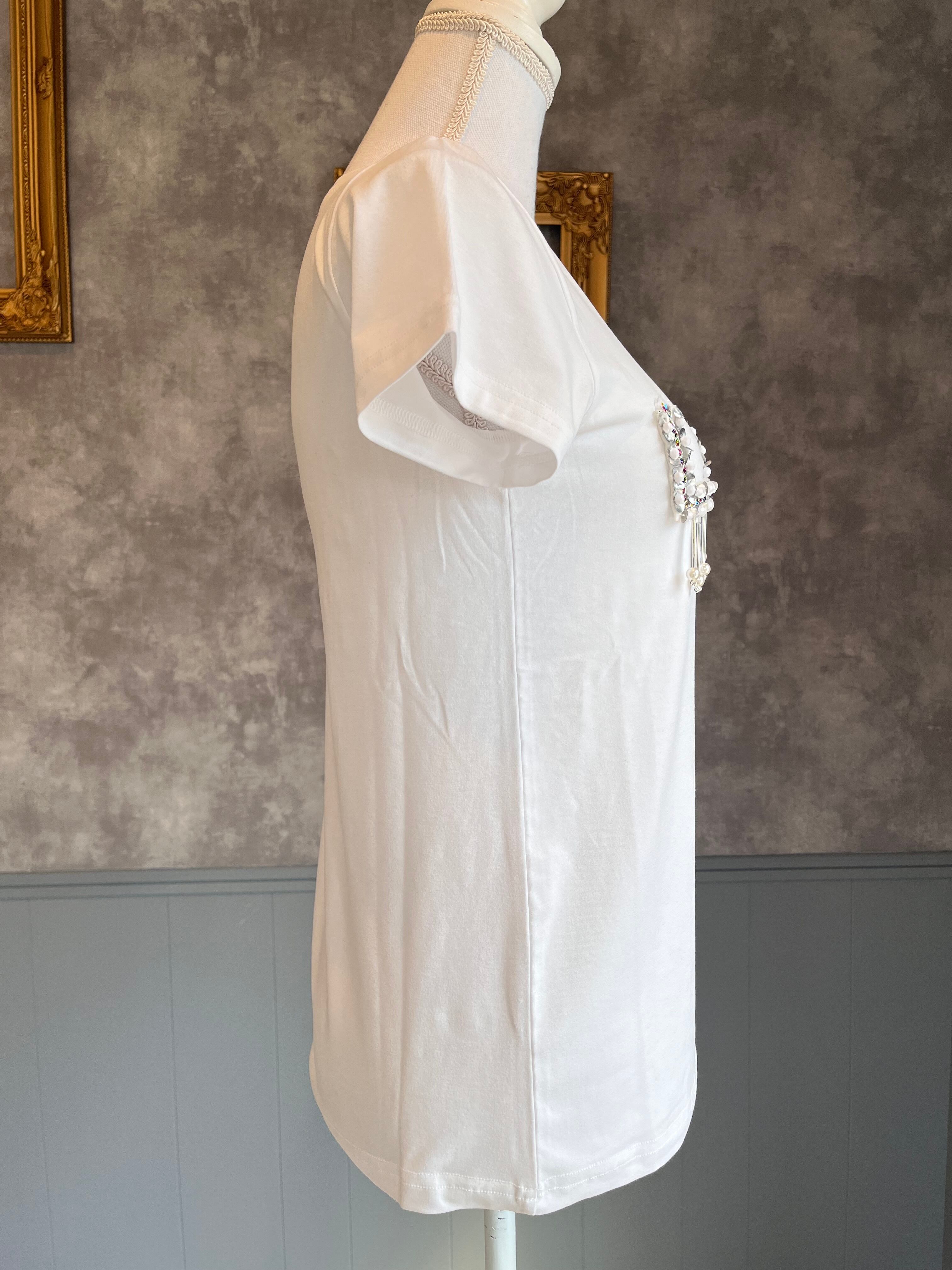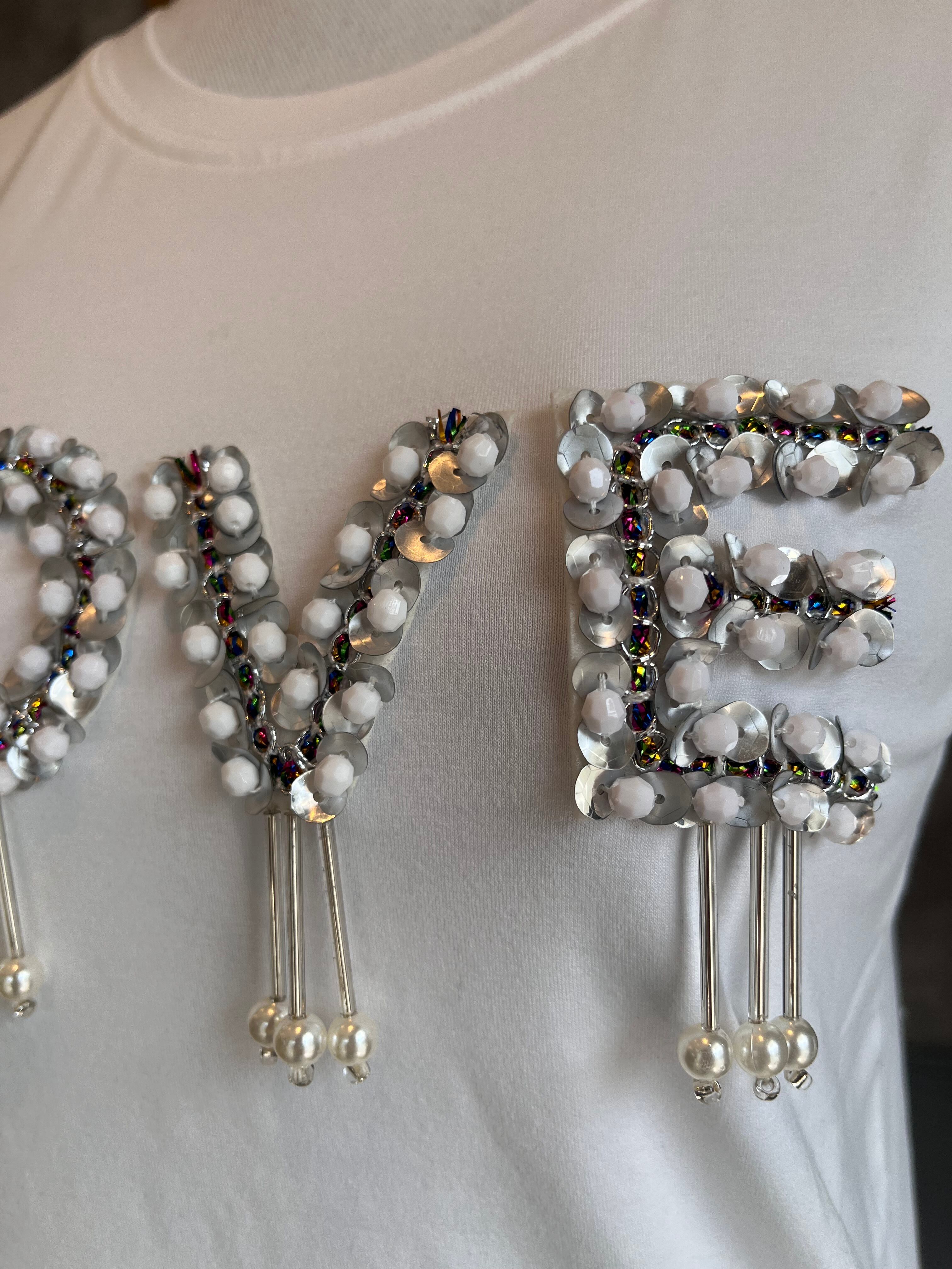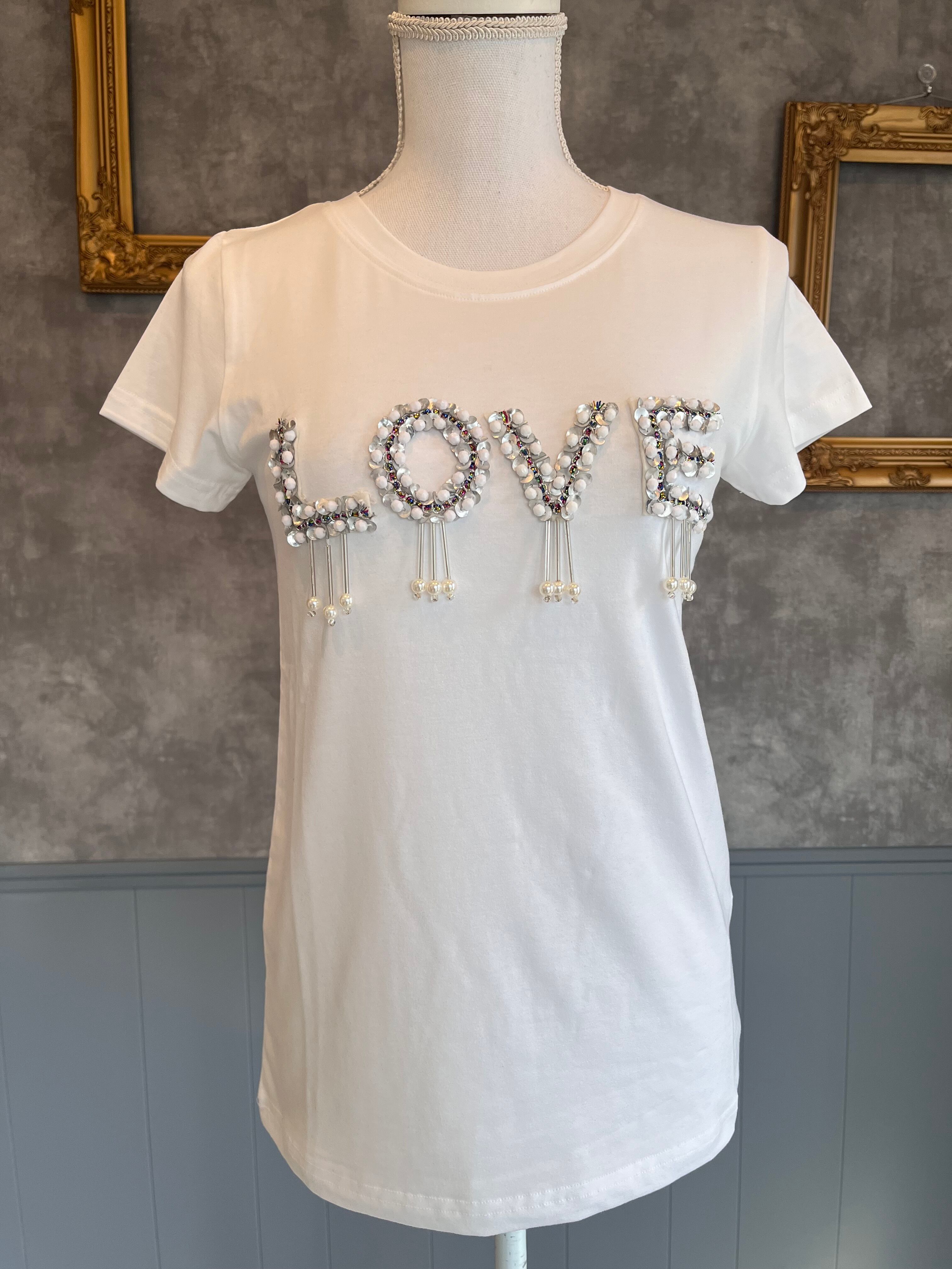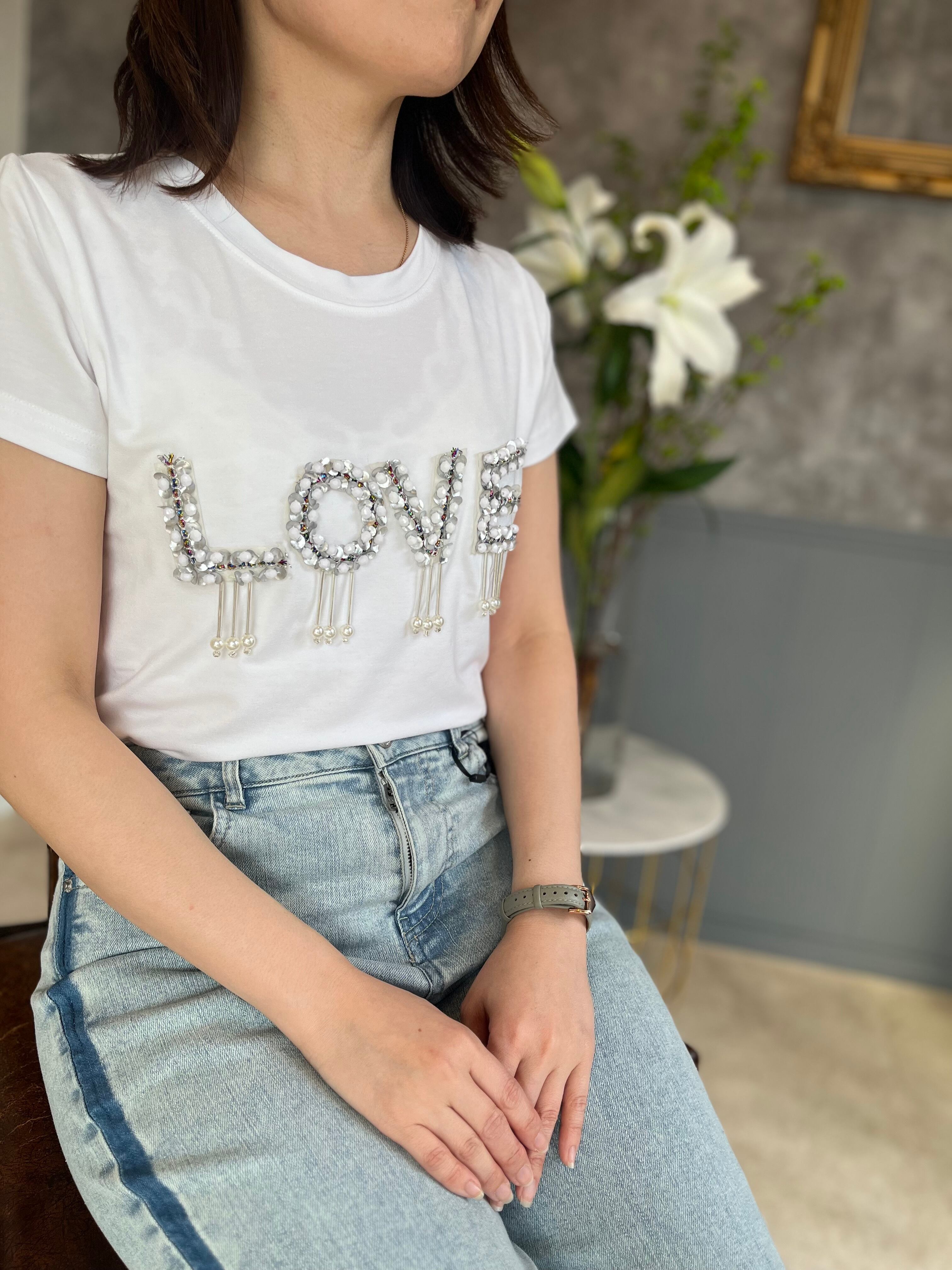 スパンコールやパールなどでデコっているLOVE Tシャツです。