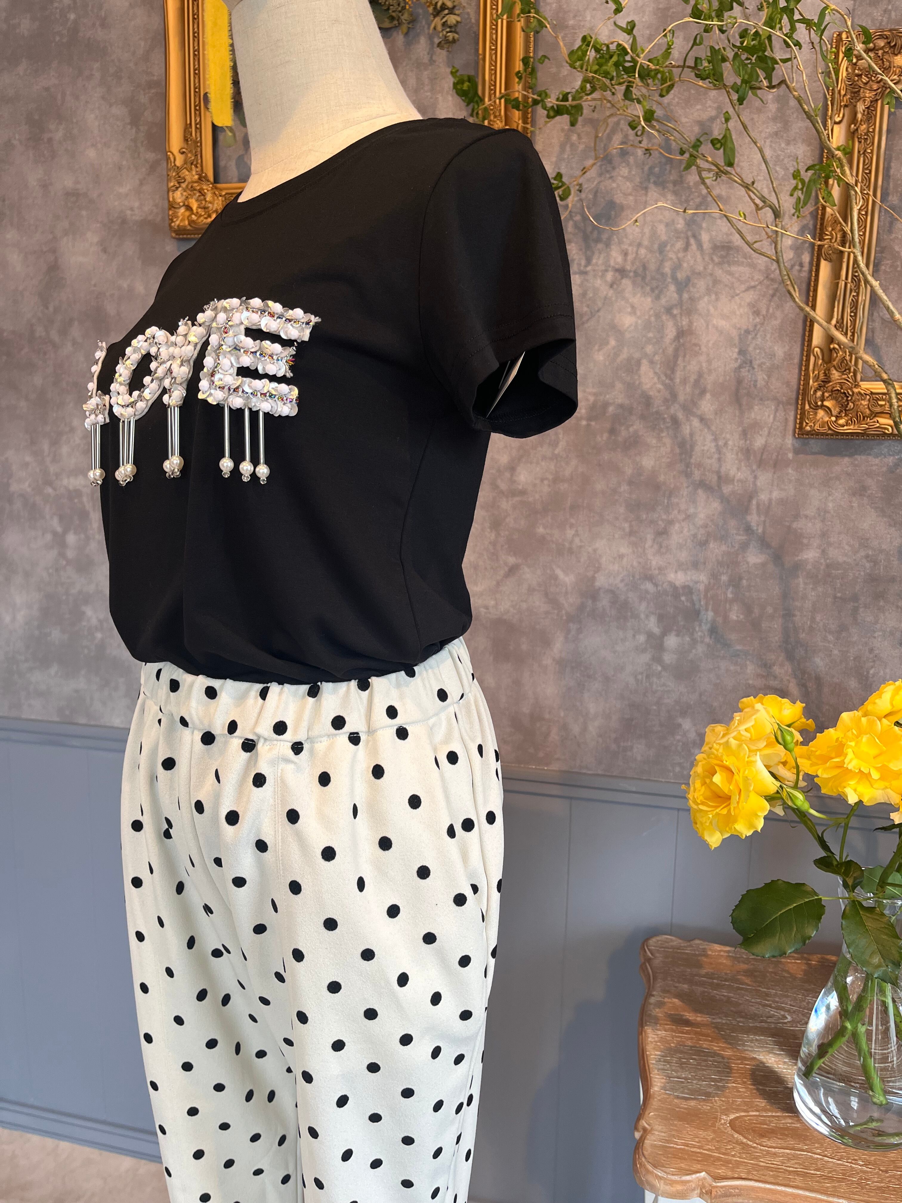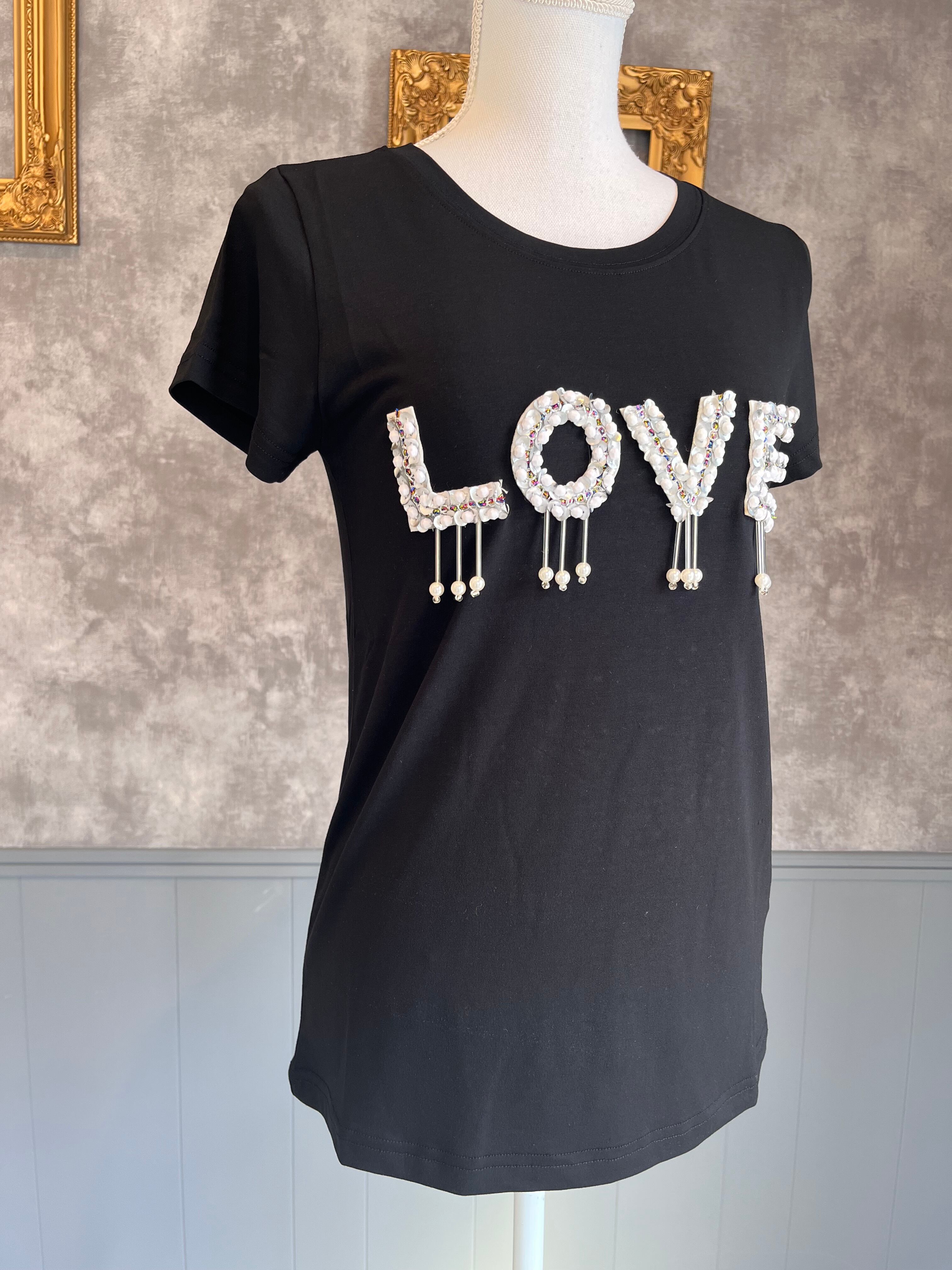 スパンコールやパールなどでデコっているLOVE Tシャツです。