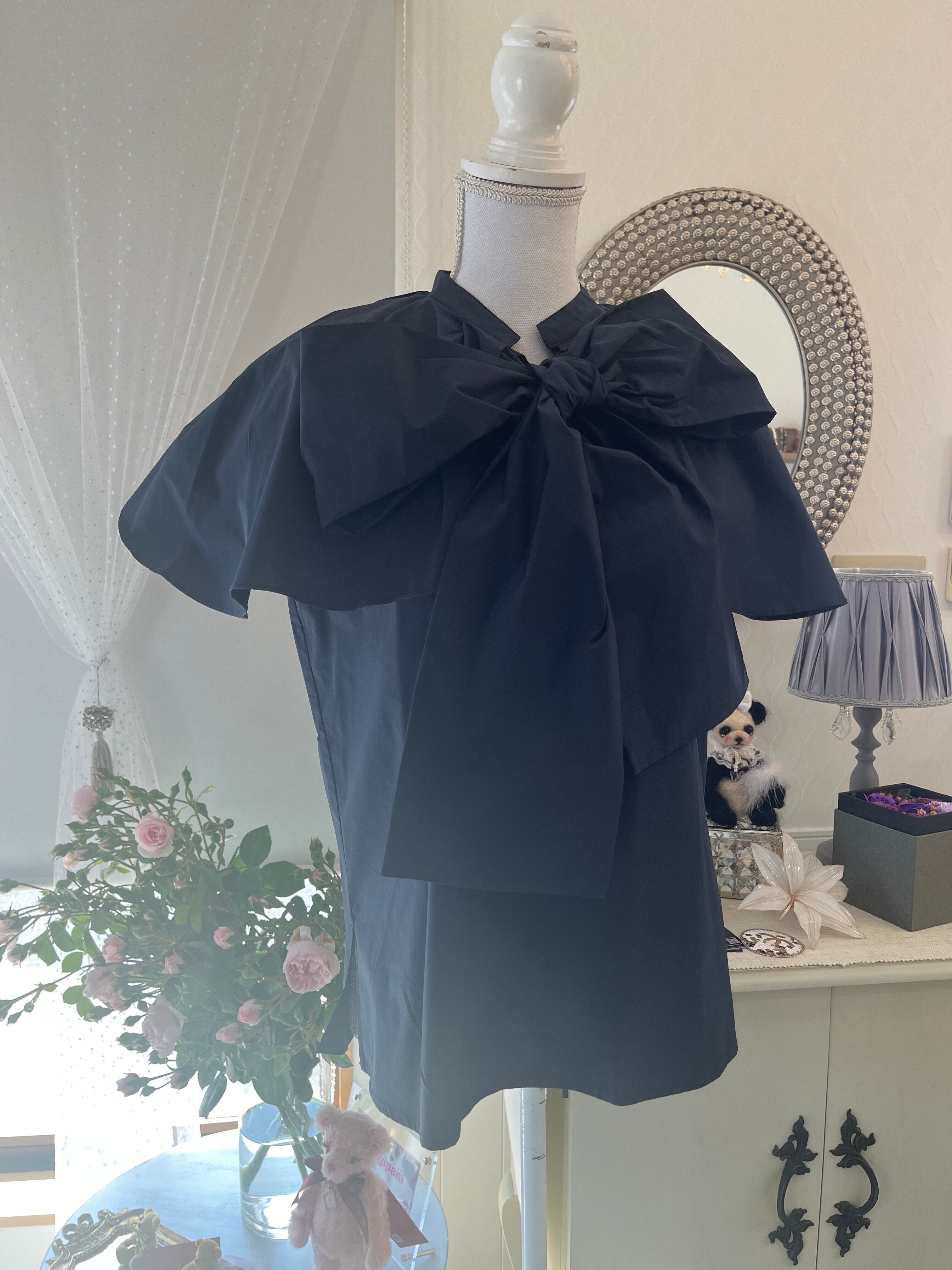 こちらのシャツはケープのように肩を覆ったデザインになっており、襟元の帯をリボン結びで結んで頂くアイテムです。
