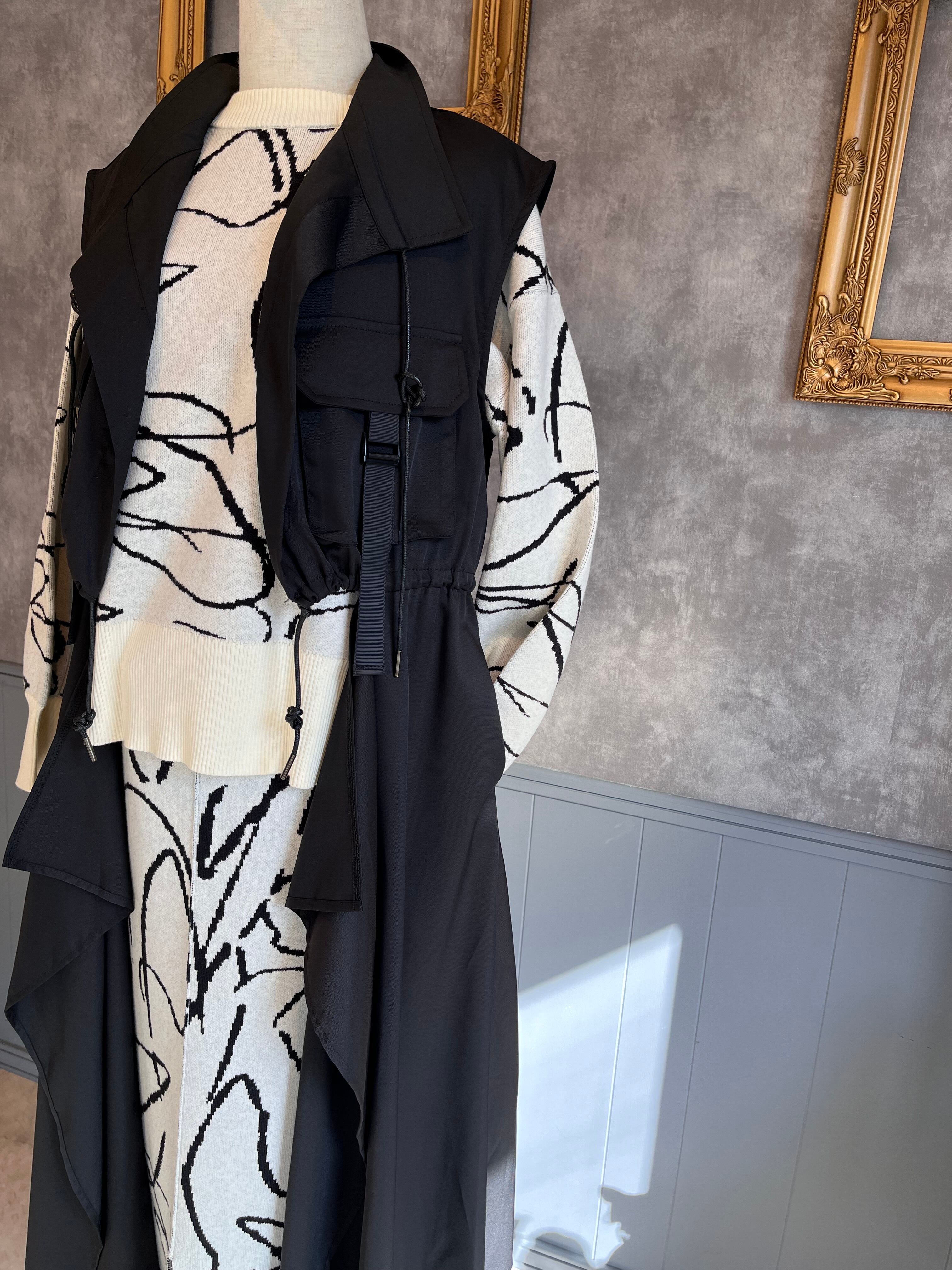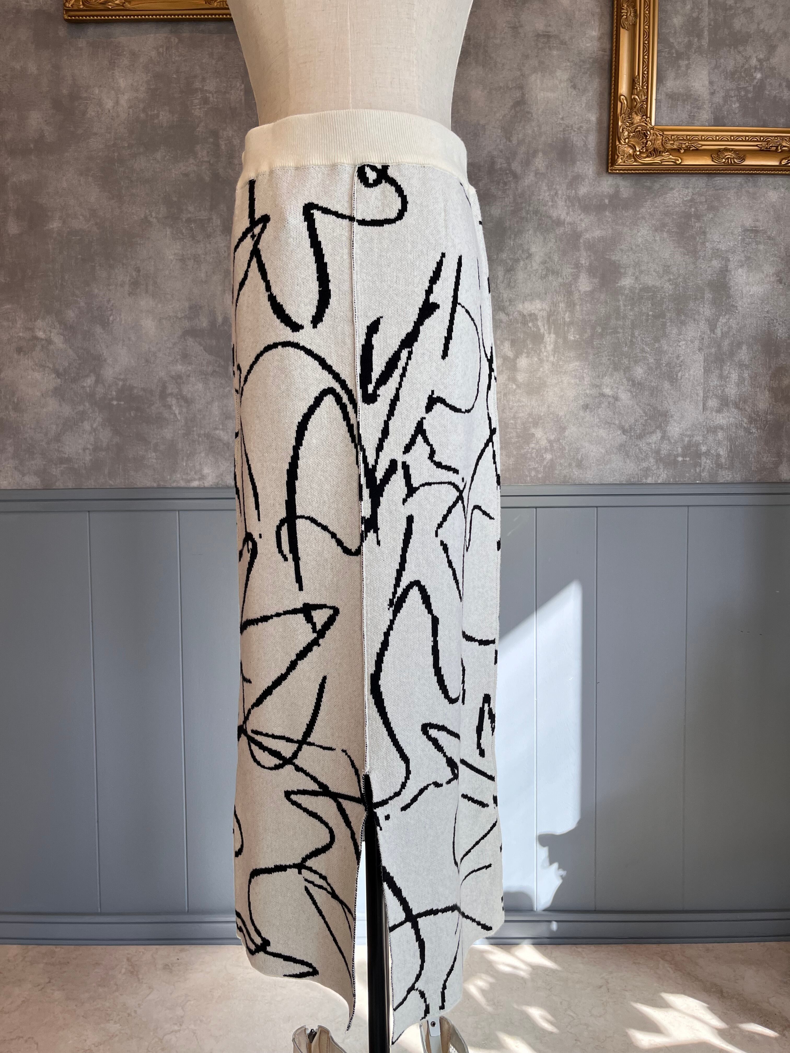 個性的なアート柄とジャガード編みが魅力のニットスカートで、シンプルながらも印象的なスタイルを演出します。