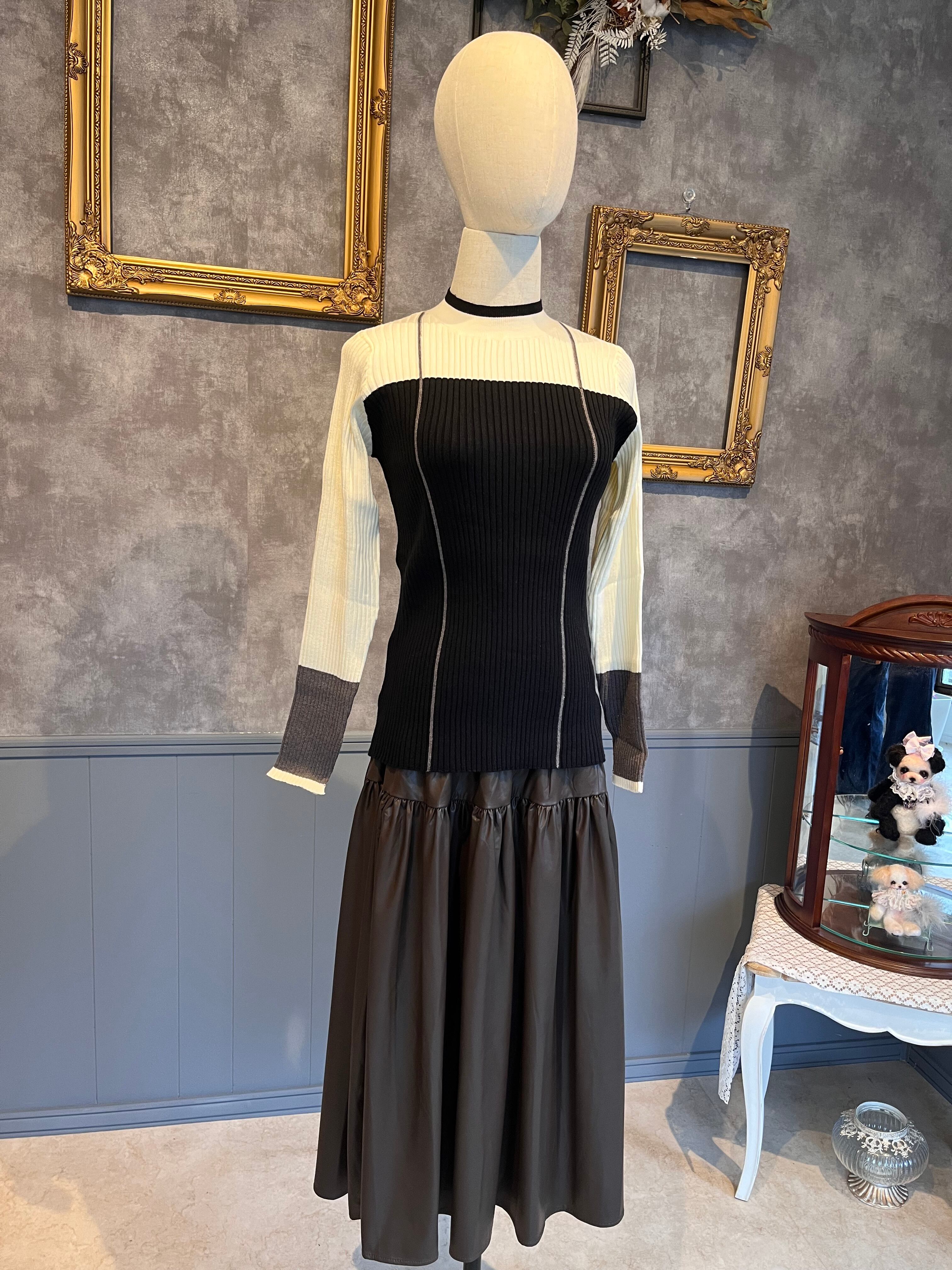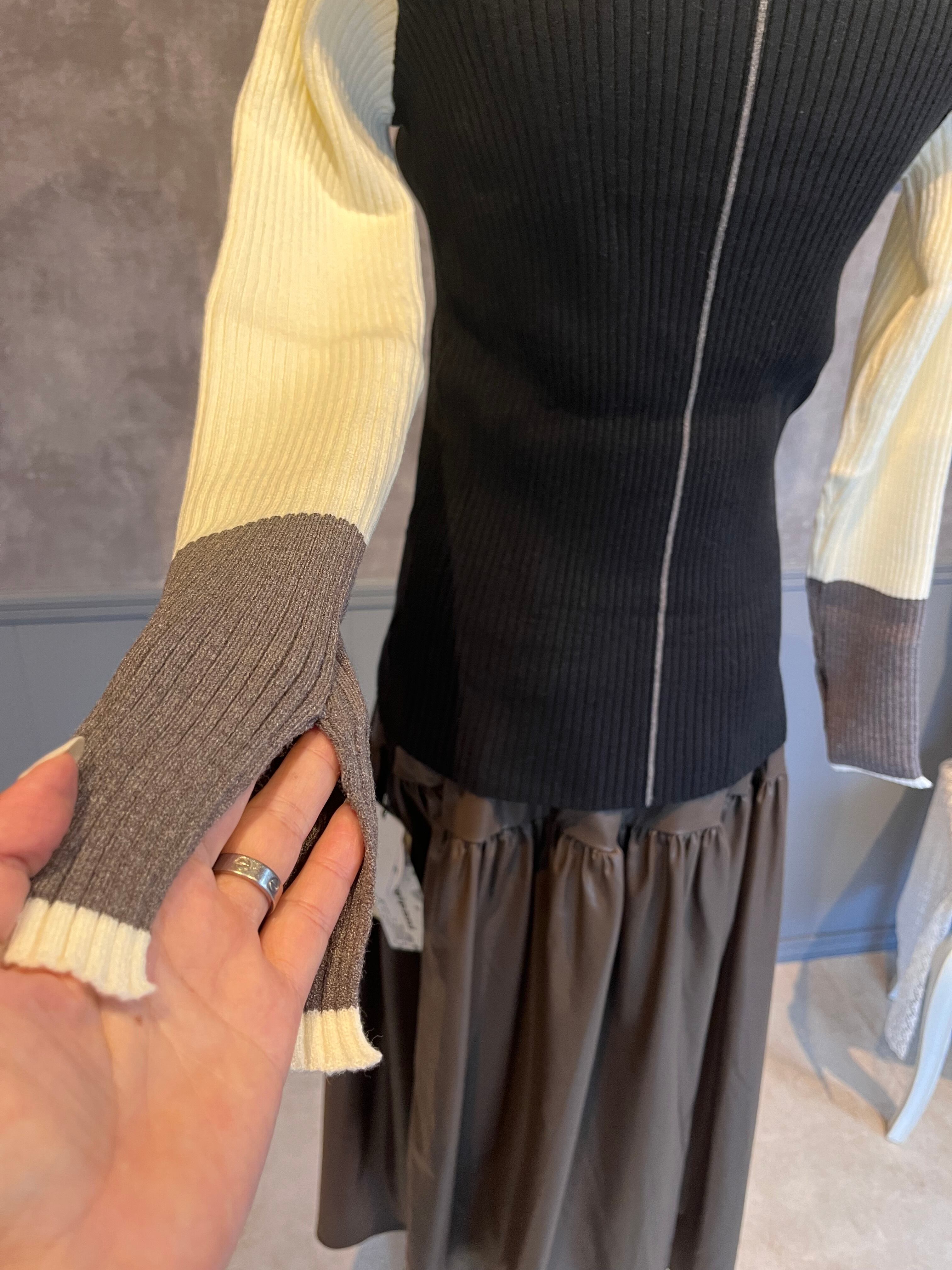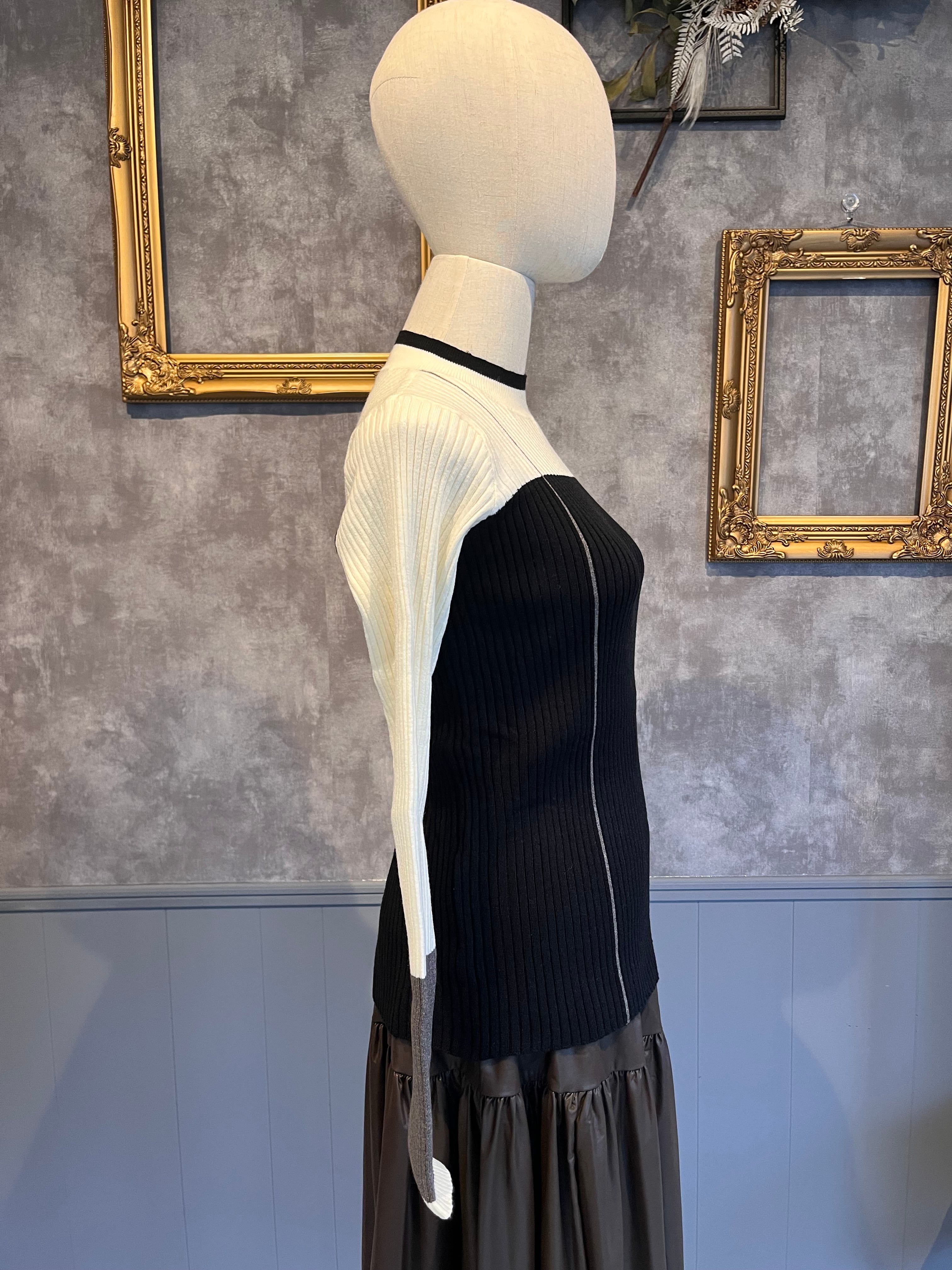 洗練されたバイカラーが魅力的なニットで、袖にスリットが入っており、スタイリッシュな印象を与えます。