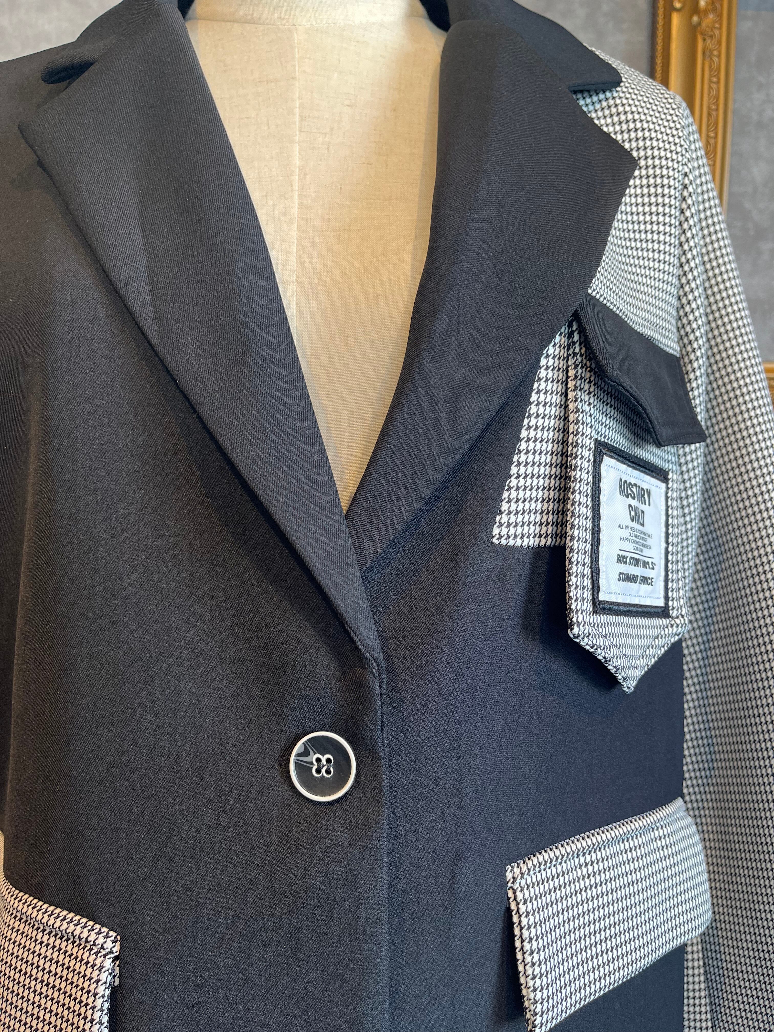 ブラックのジャケットにチェックがアシンメトリーで入った個性的なジャケットです。