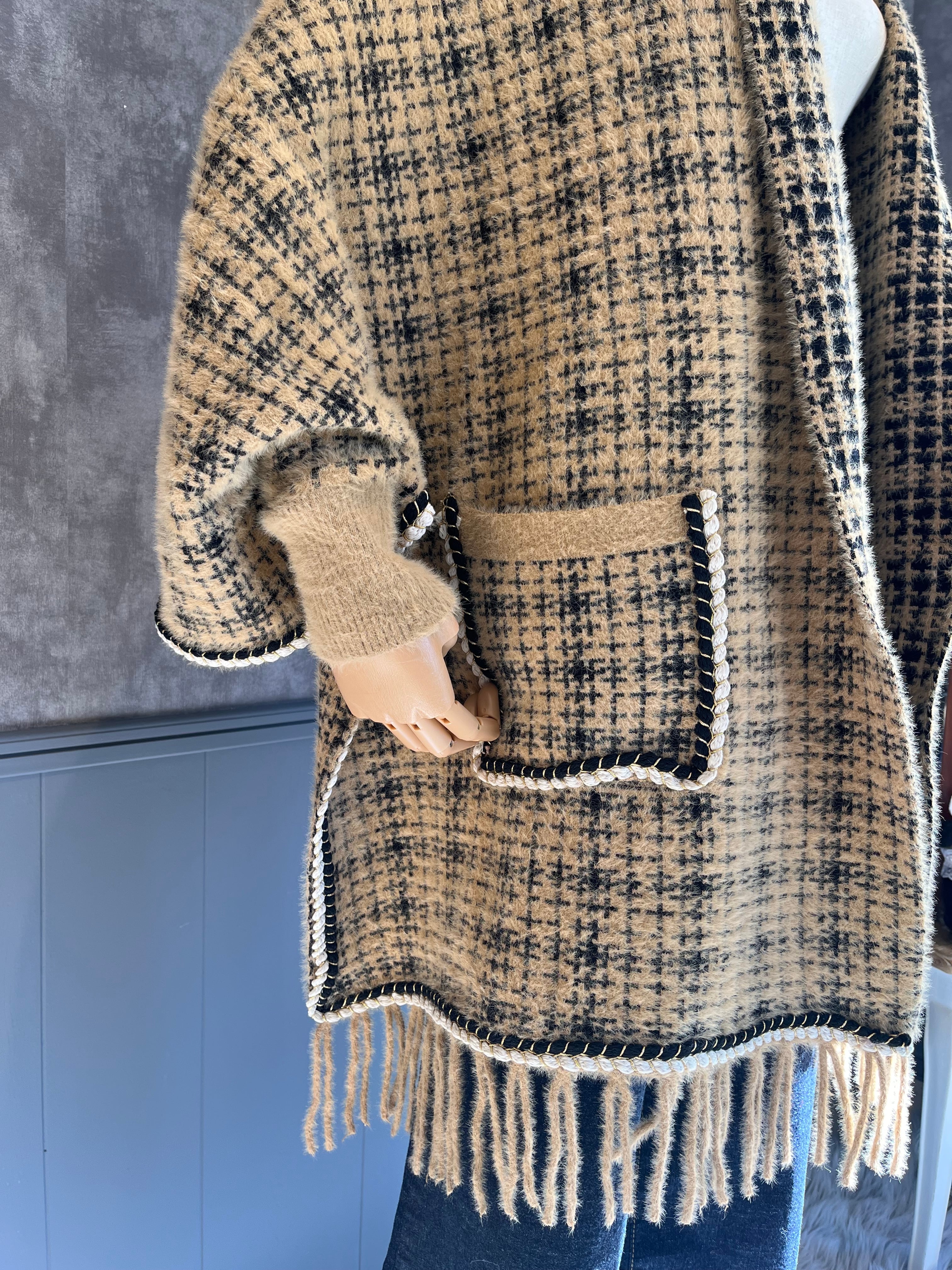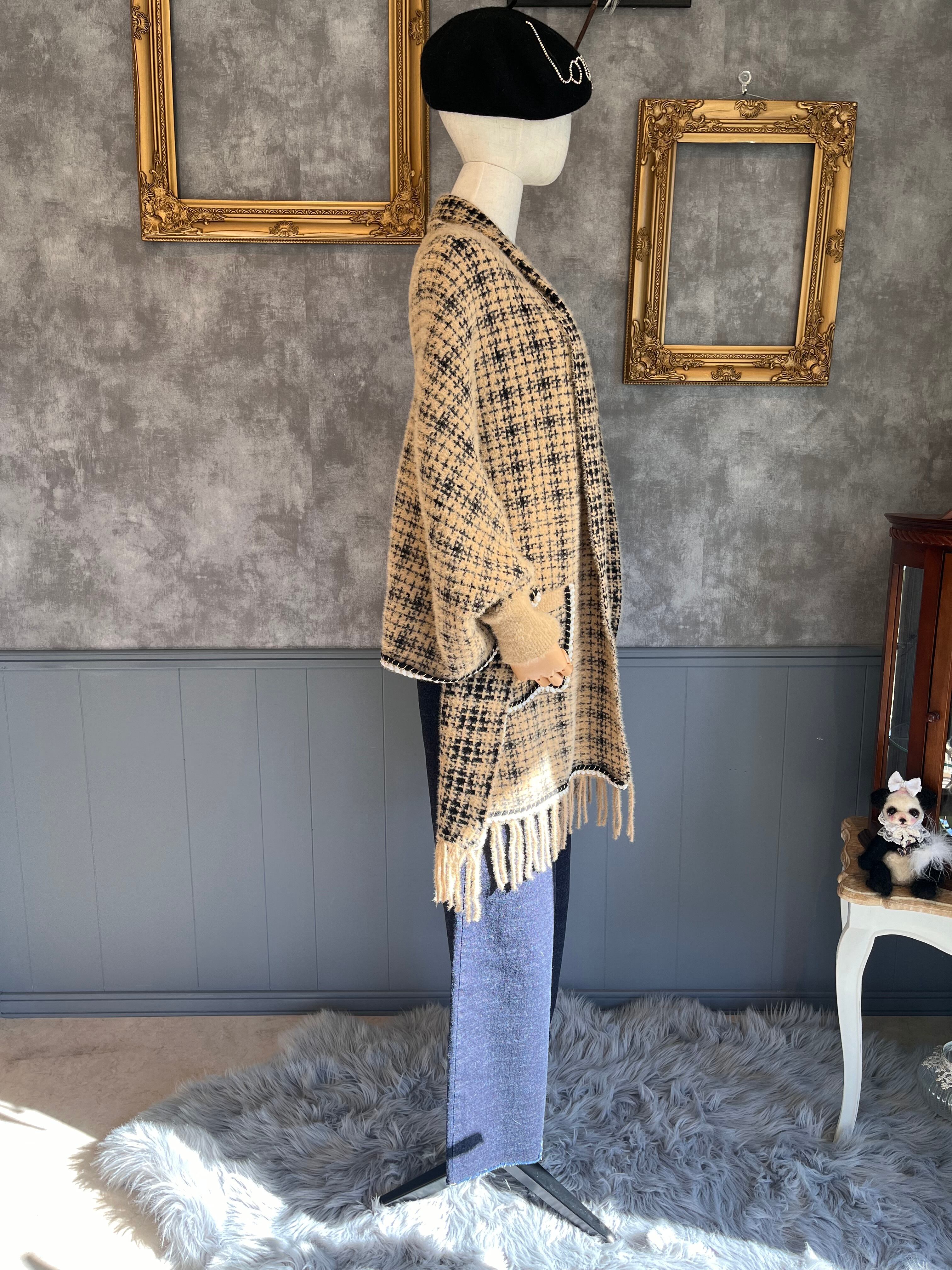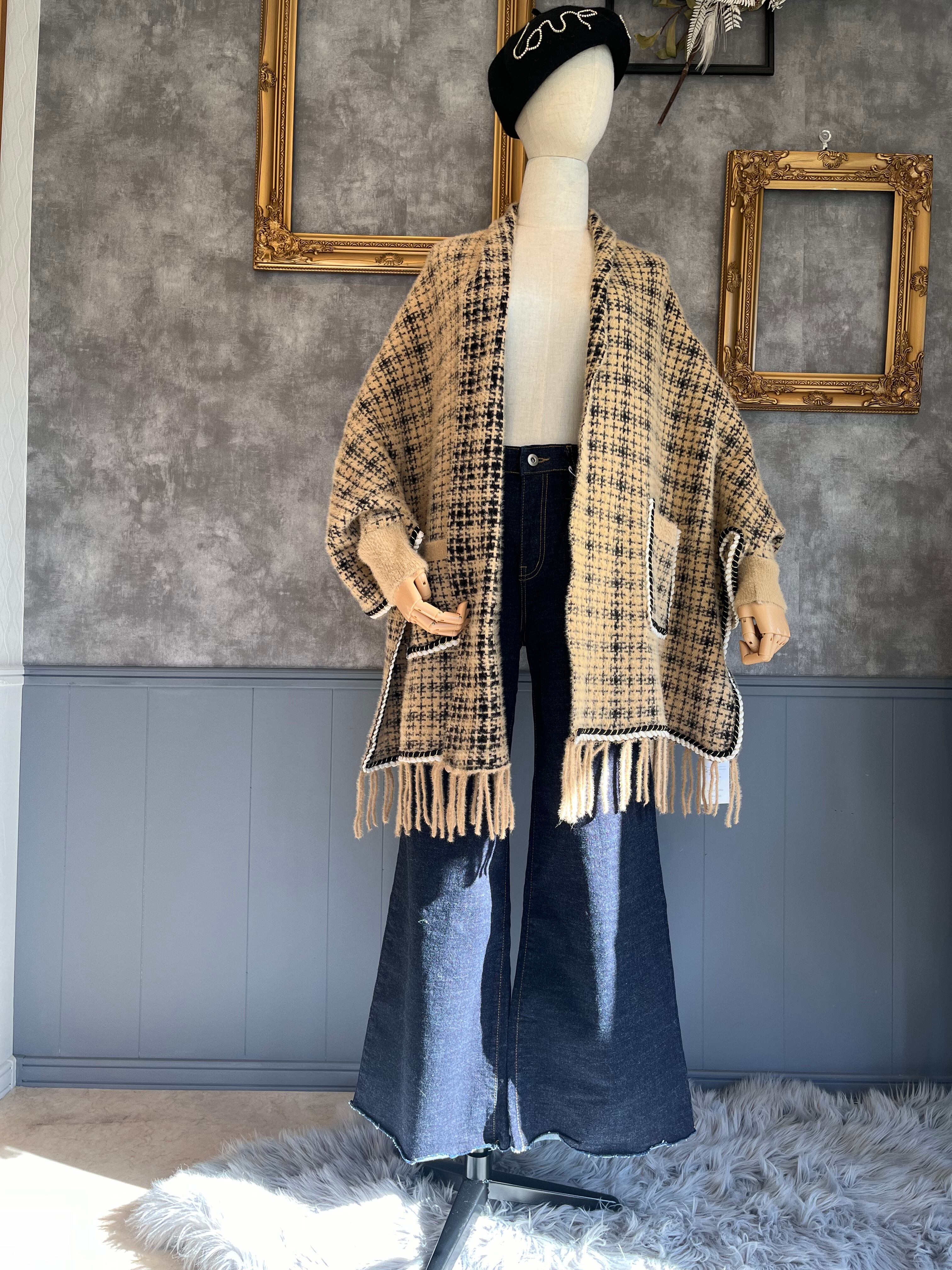 新登場のフリンジポンチョは、しっとりとした生地感が魅力的な一枚です。キャメルカラーで、落ち着いた上品さとトレンド感を兼ね備えています。このポンチョは、フリンジデザインがさりげなくアクセントになり、普段のコーディネートに華やかさをプラスします。