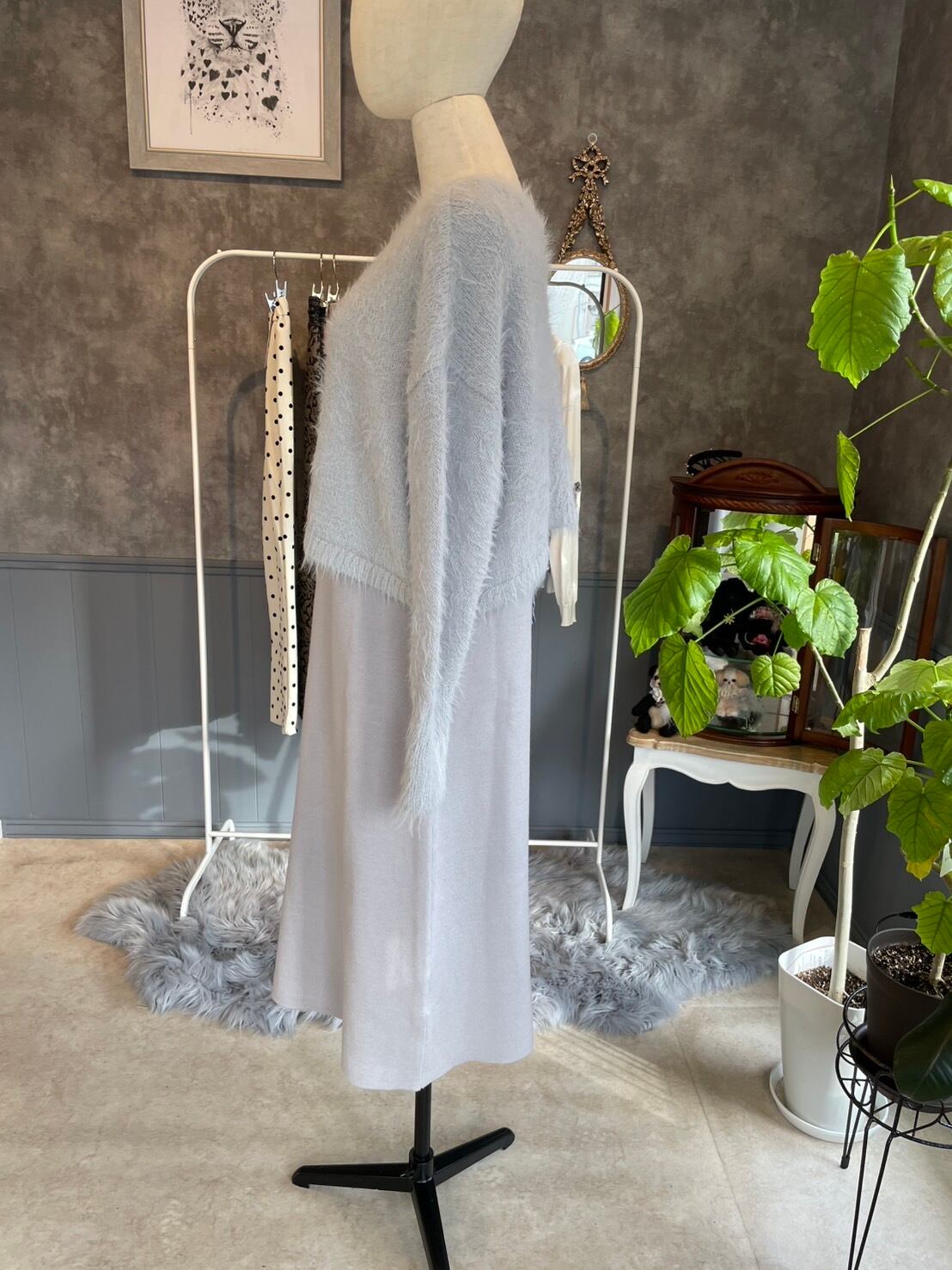 ・ニットワンピースとシャギートップスの組み合わせは、特別なシーンから、カジュアルなお出かけシーンまで幅広く活躍します。
