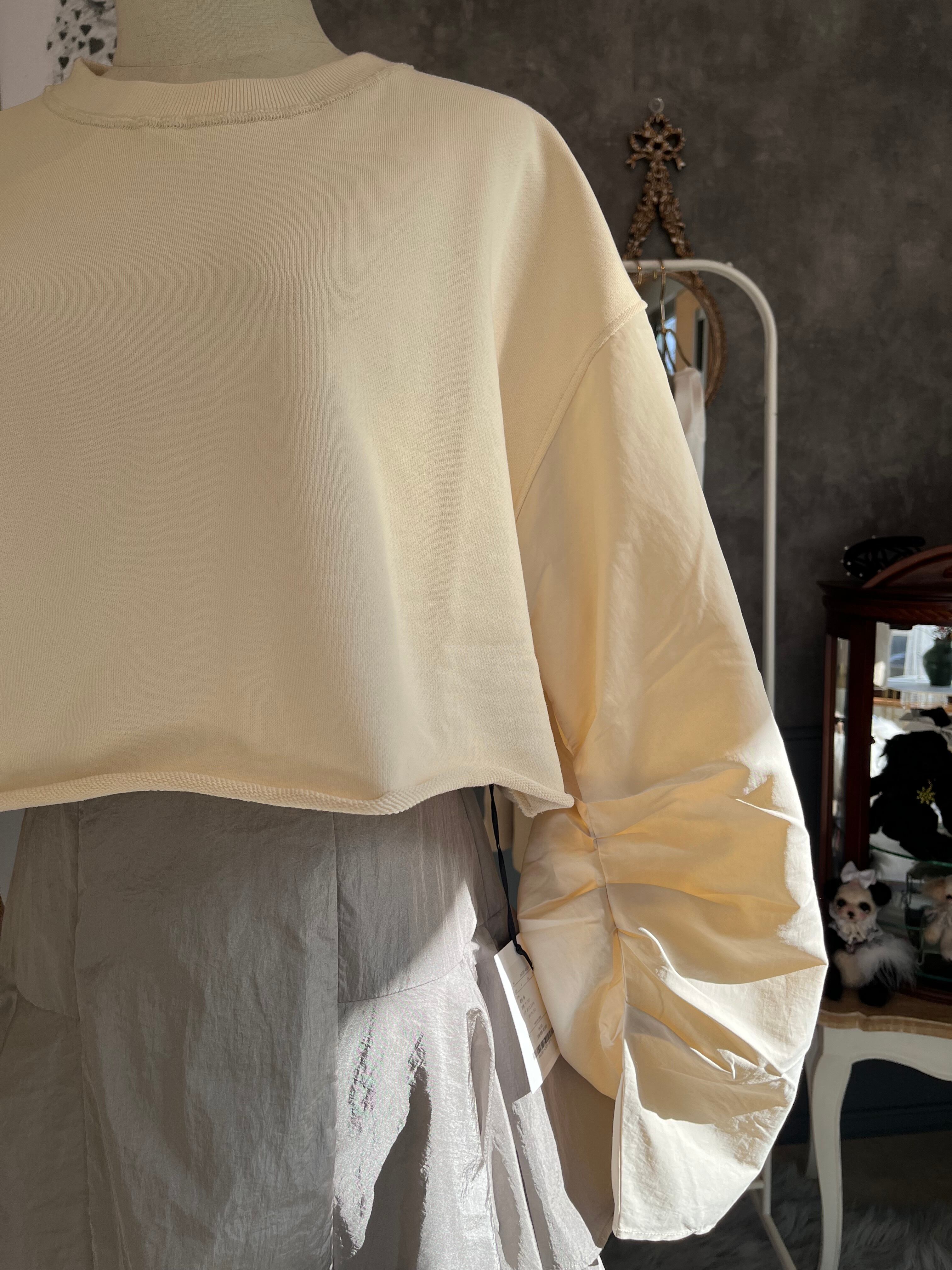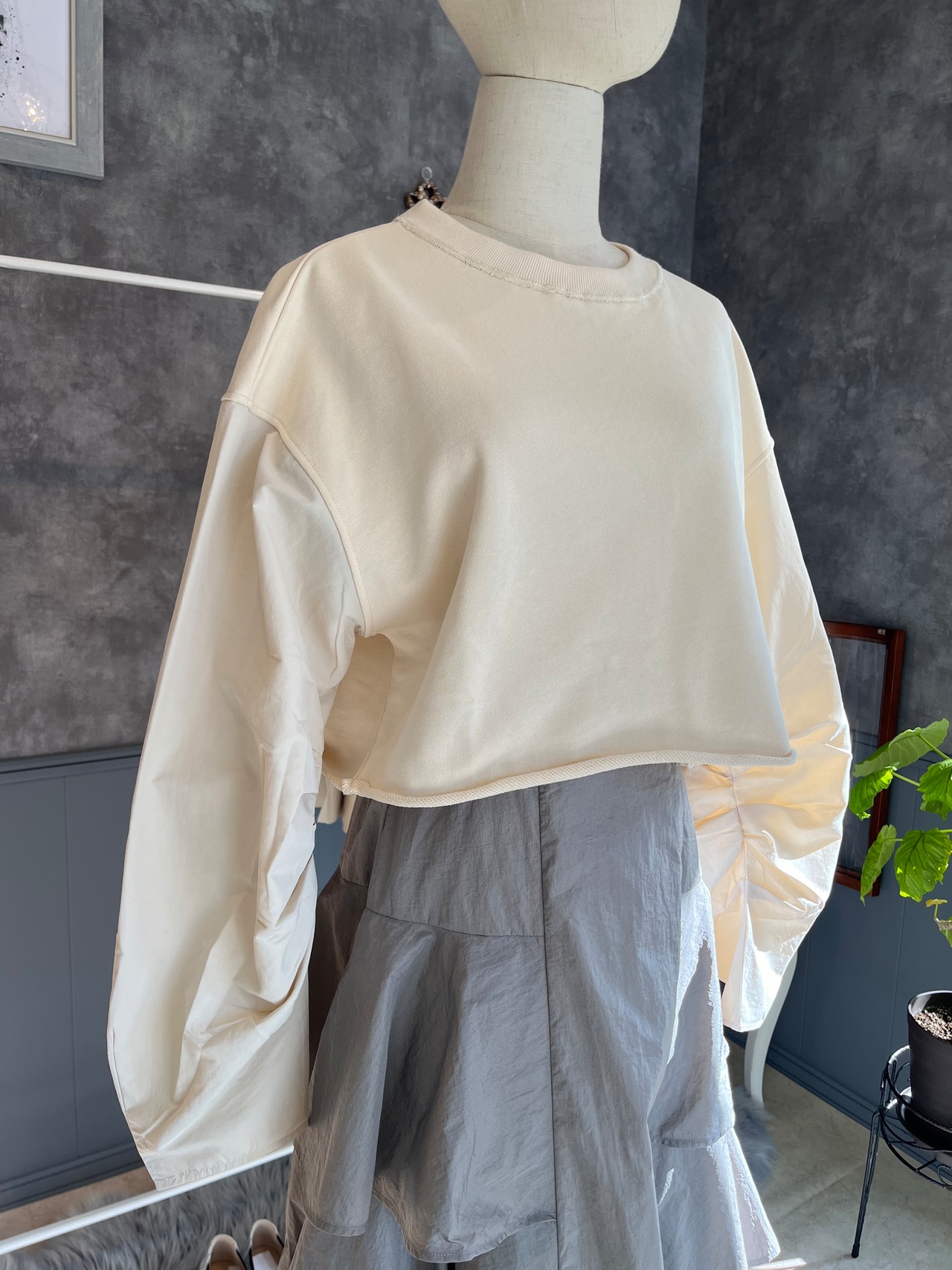 ・ナイロン素材で切り替え、たっぷりギャザーを使ったバルーンスリーブがポイント。