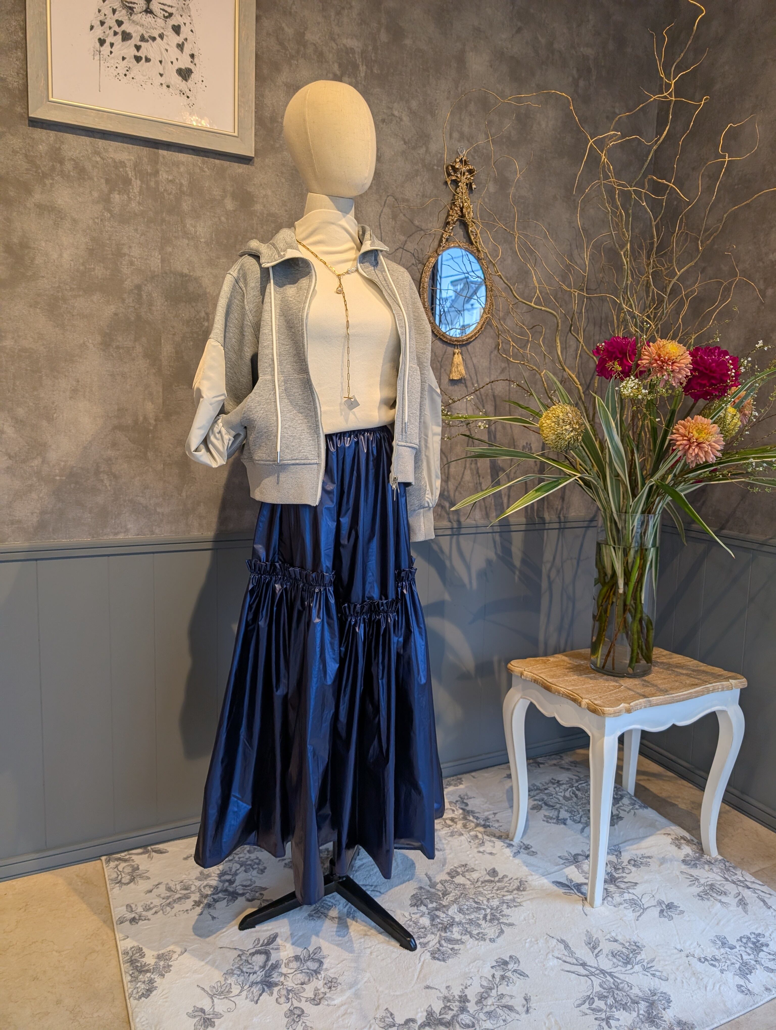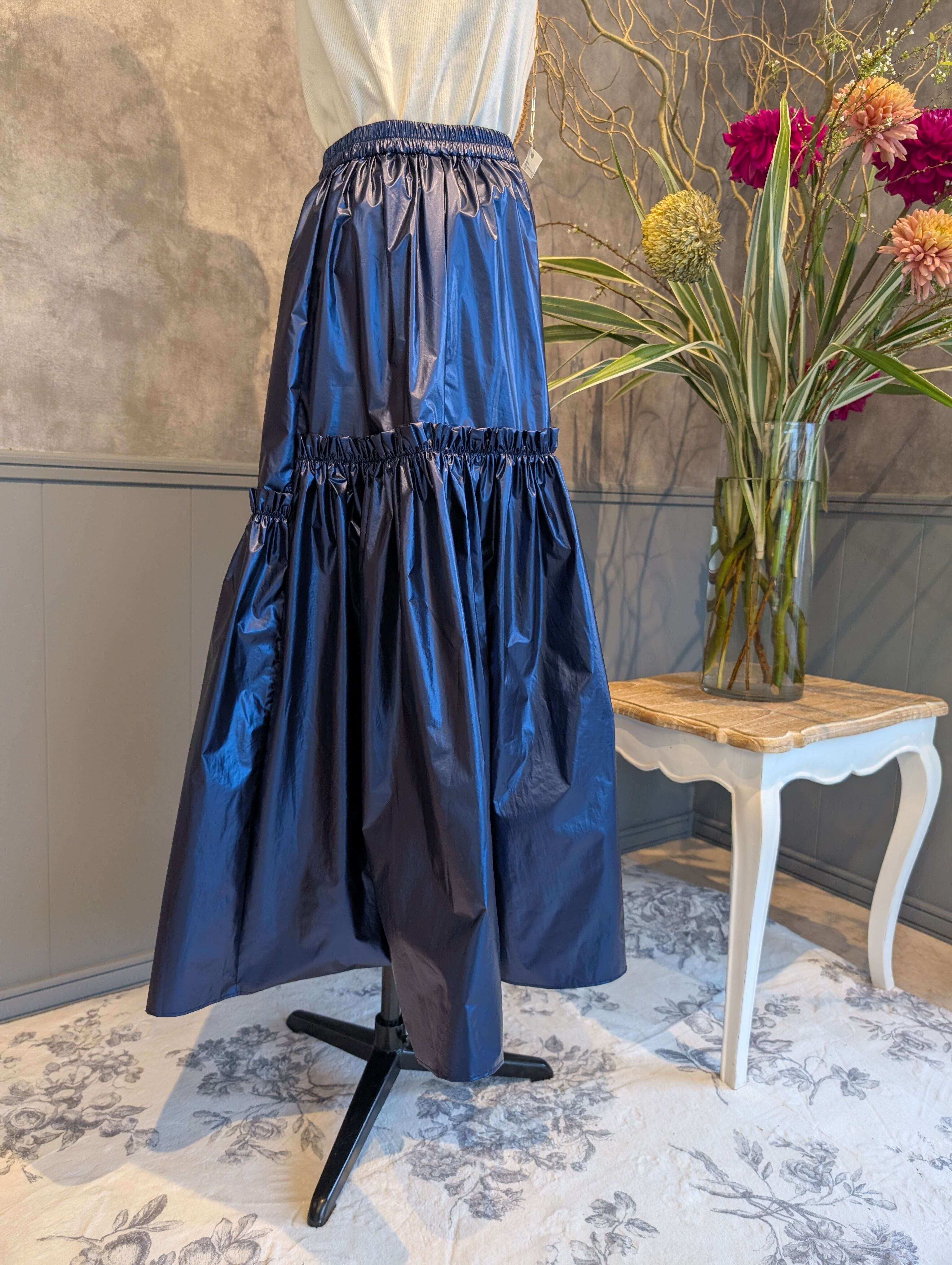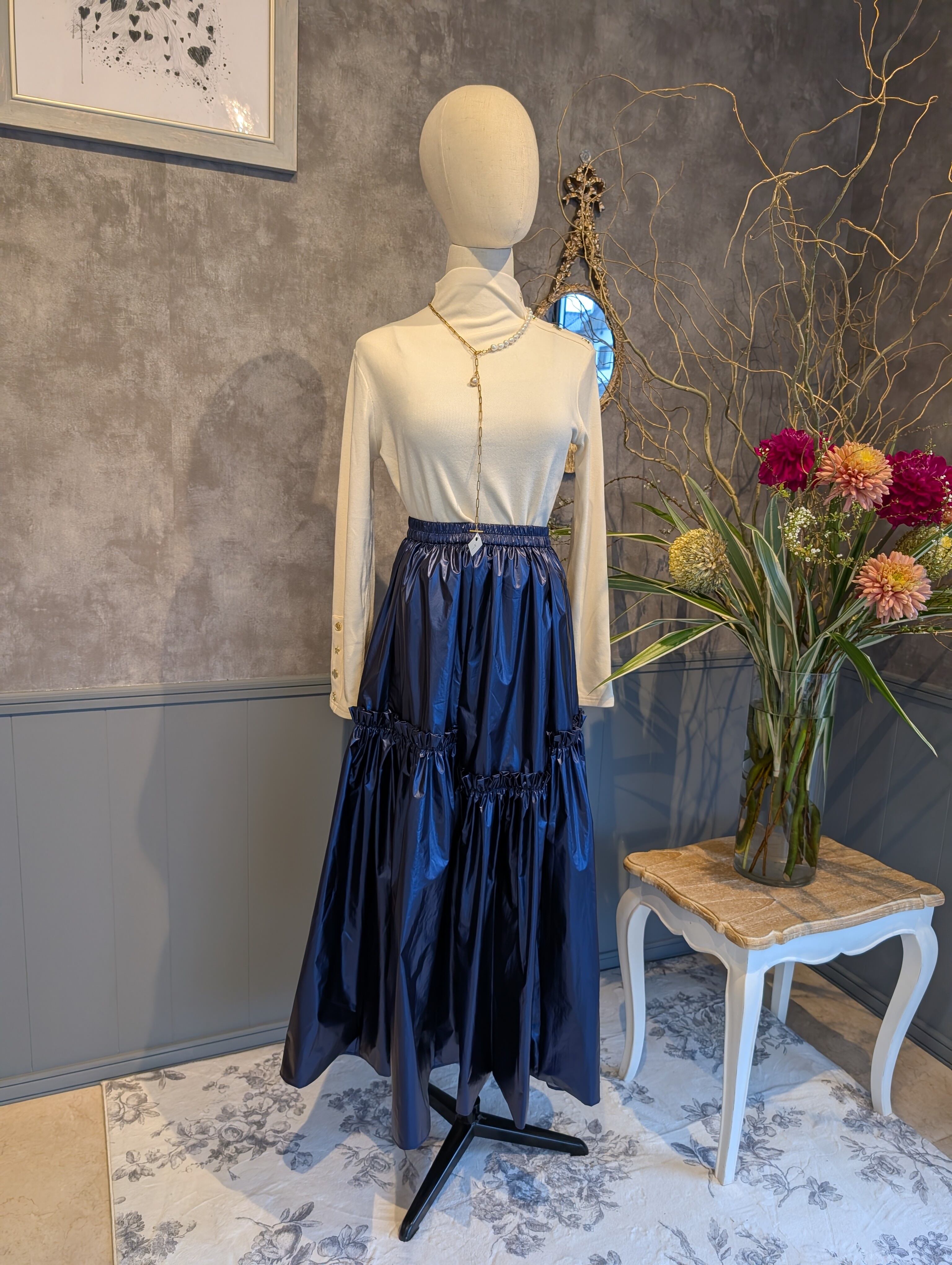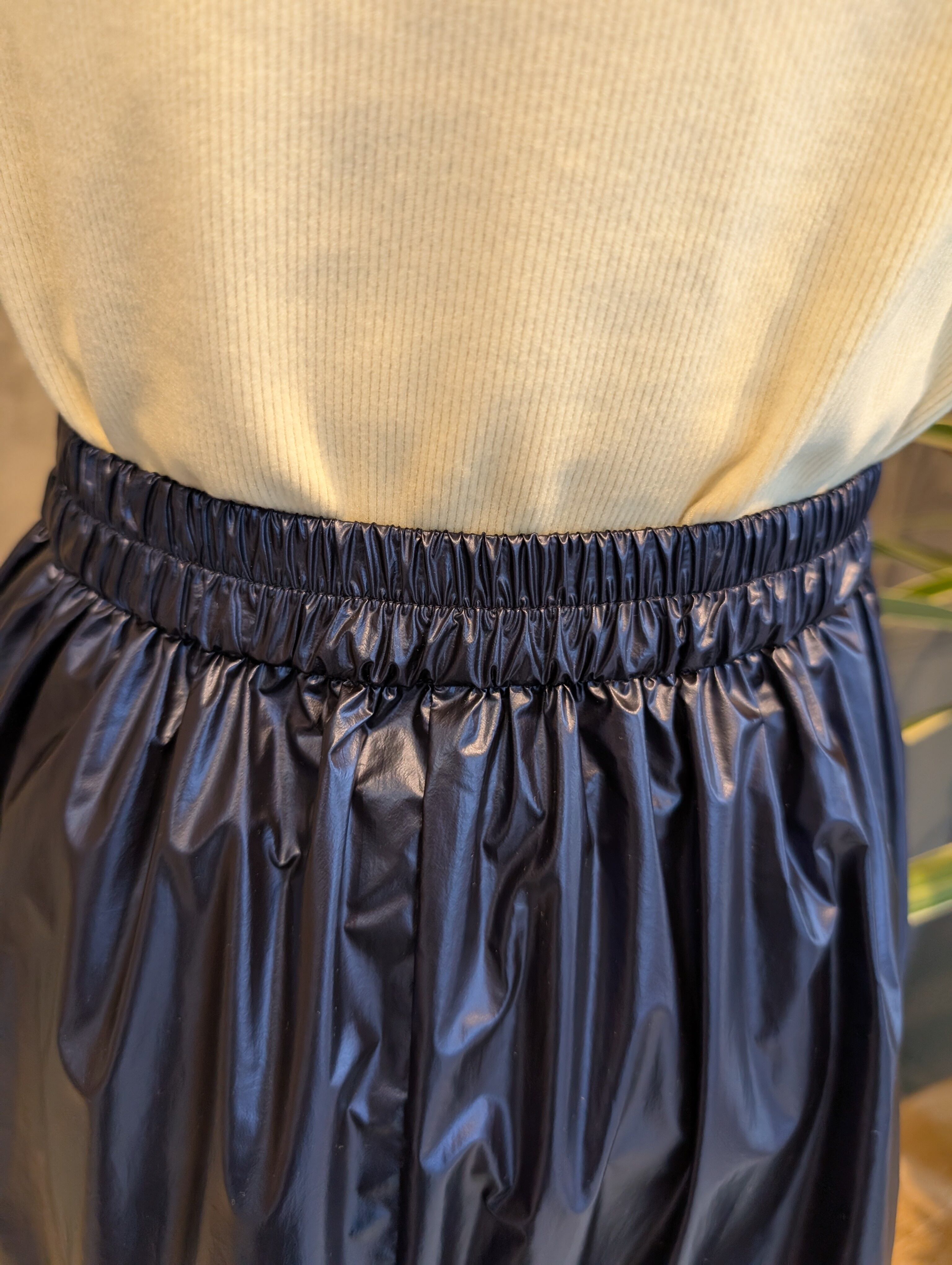 ・シャイニーな素材で華やかさが引き立つギャザースカート。