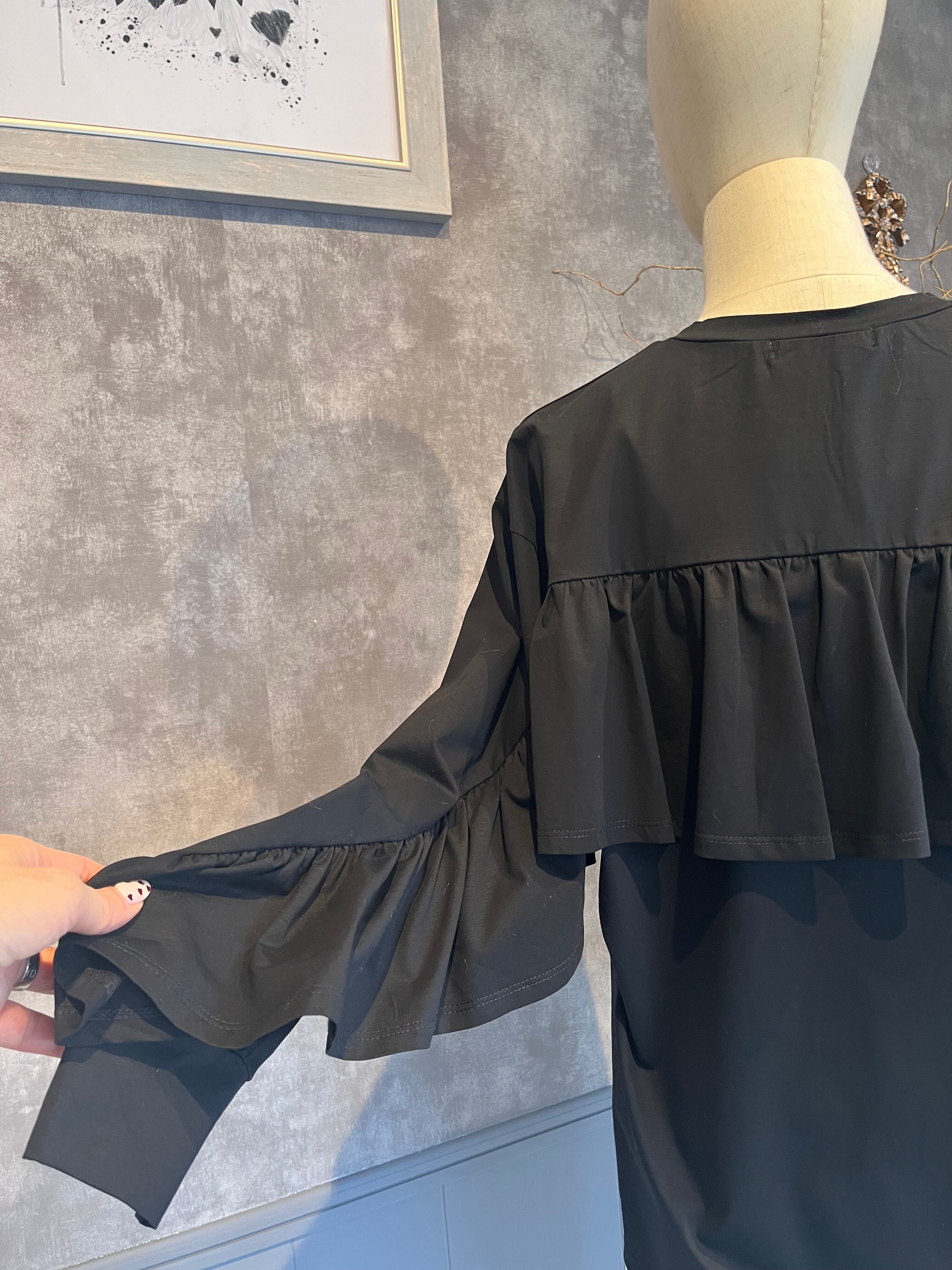 ・背中と腕に施されたフリルがアクセントになり、シンプルなロンTに華やかさをプラスします。
