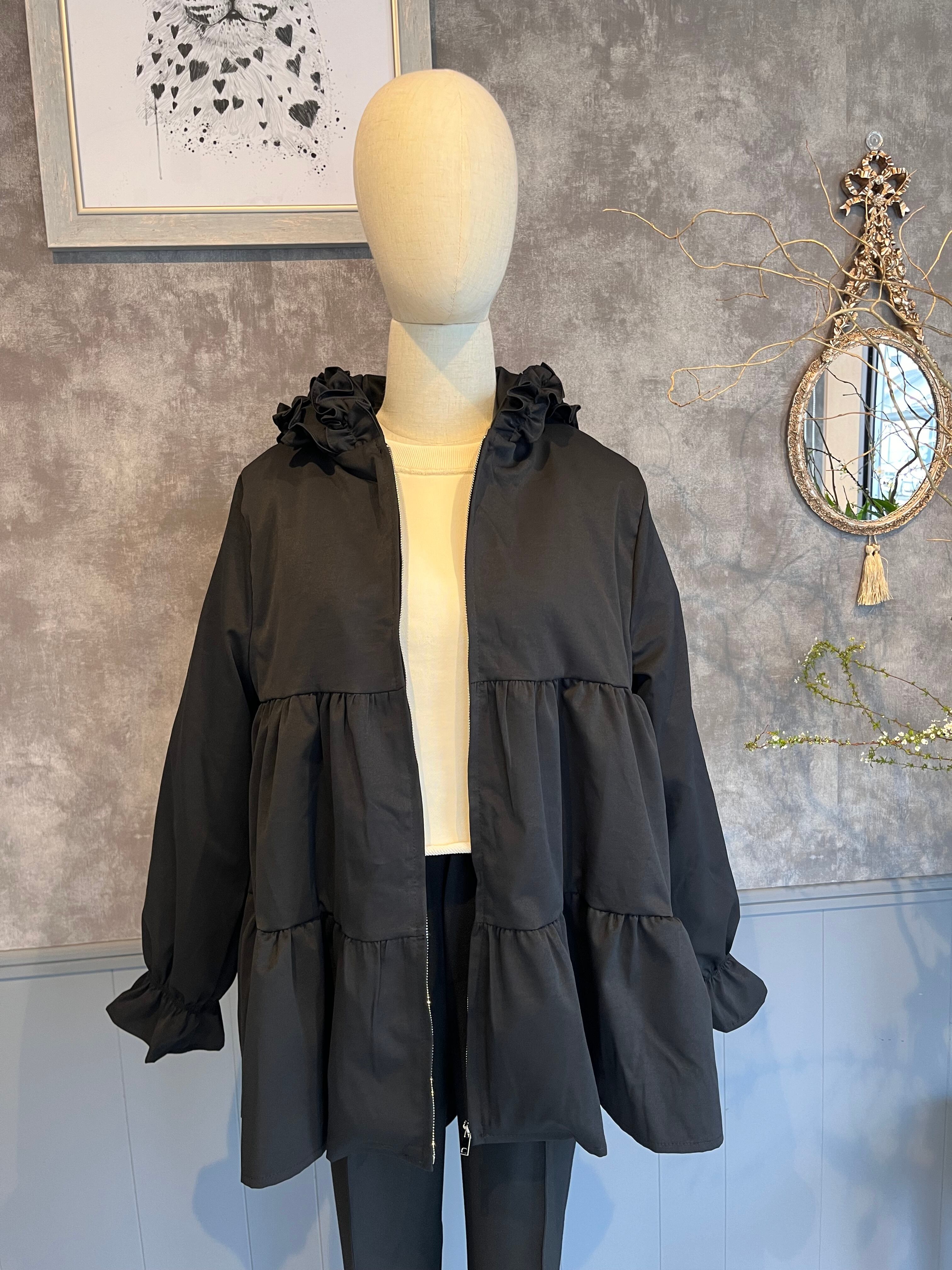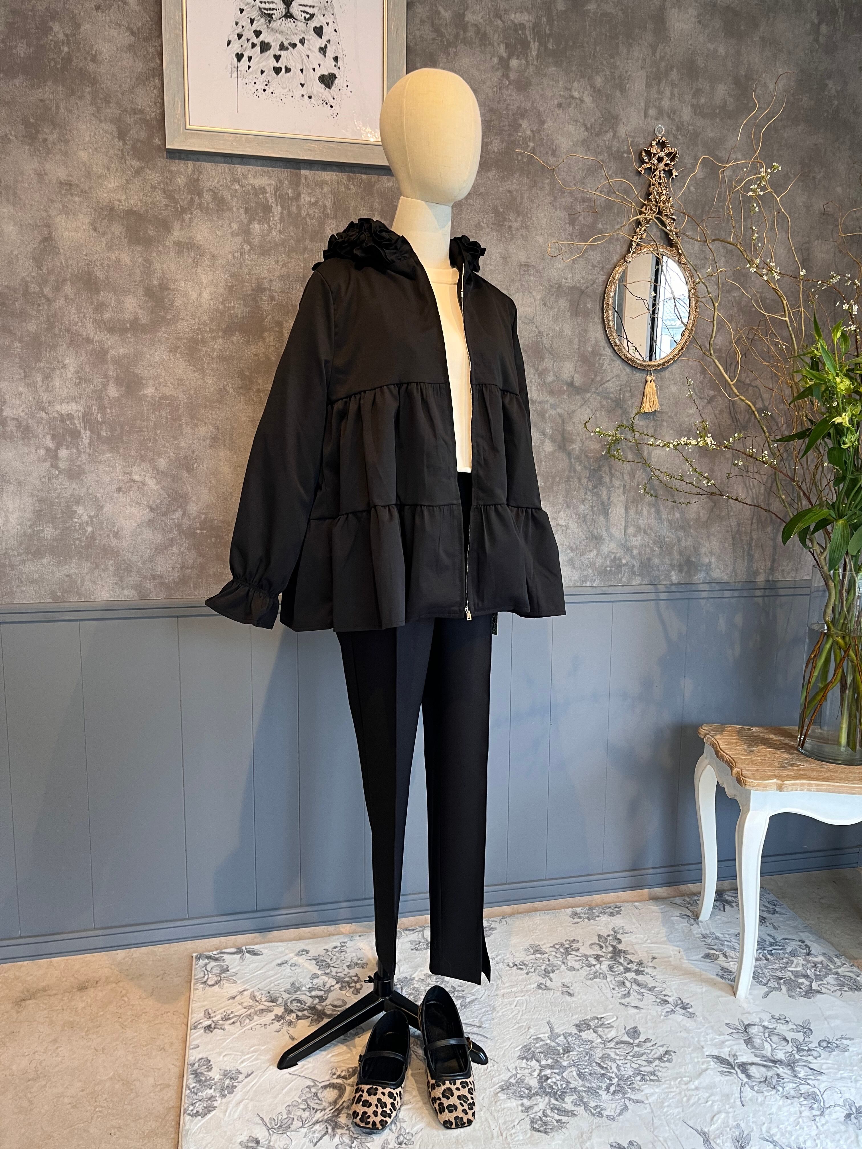 ・フードに施されたフリルがポイントとなり、シンプルながらも華やかさを添えるブルゾンです。